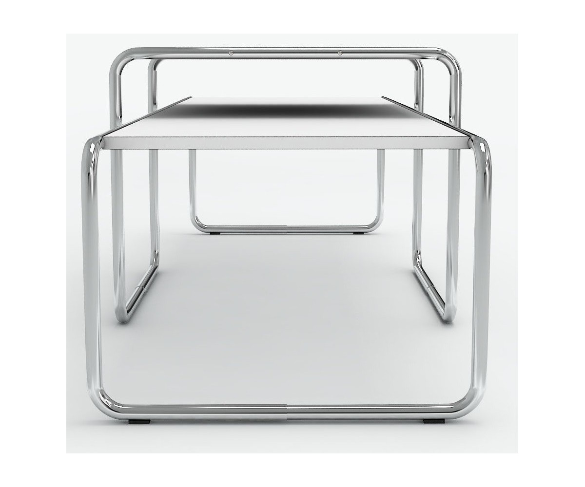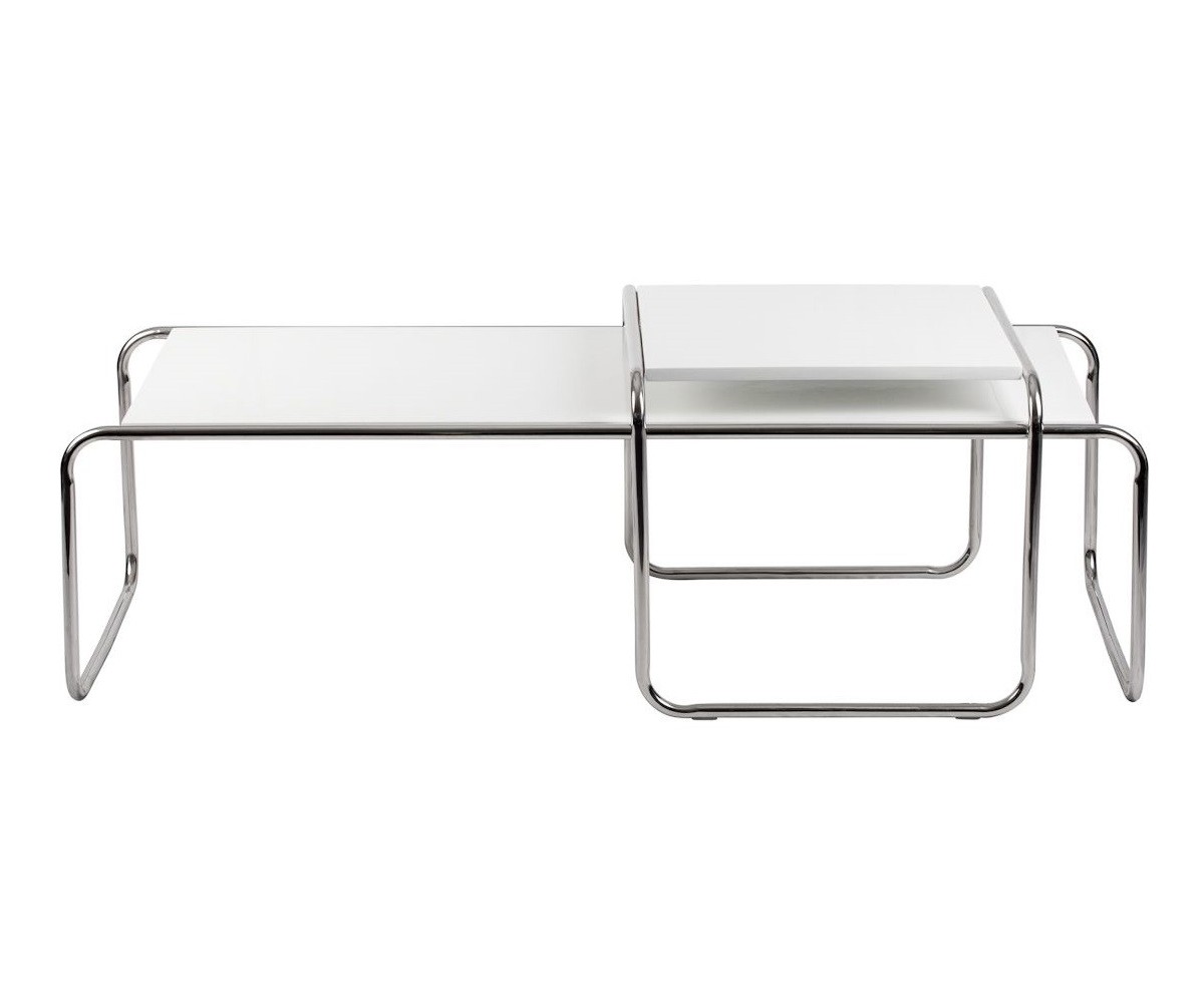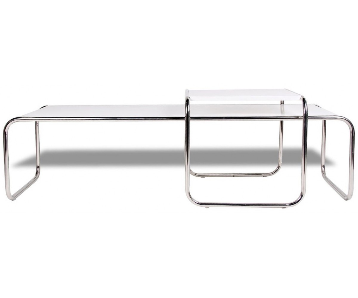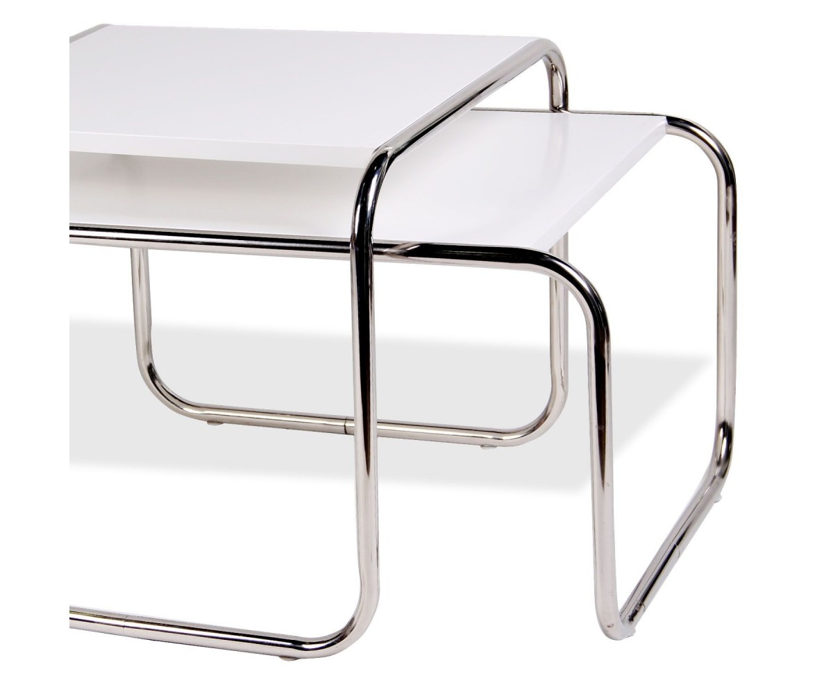 Set Mesa de centro rectangular y cuadrada inspirado en un diseño de Marcel Breuer. Estructura tubular en acero inoxidable terminación brillo, tapa en madera bilaminada color blanca roble macizo, también disponible en color negro. Mesa a juego con el Sillón Wassily. Réplica exacta con materiales originales de máxima calidad.
