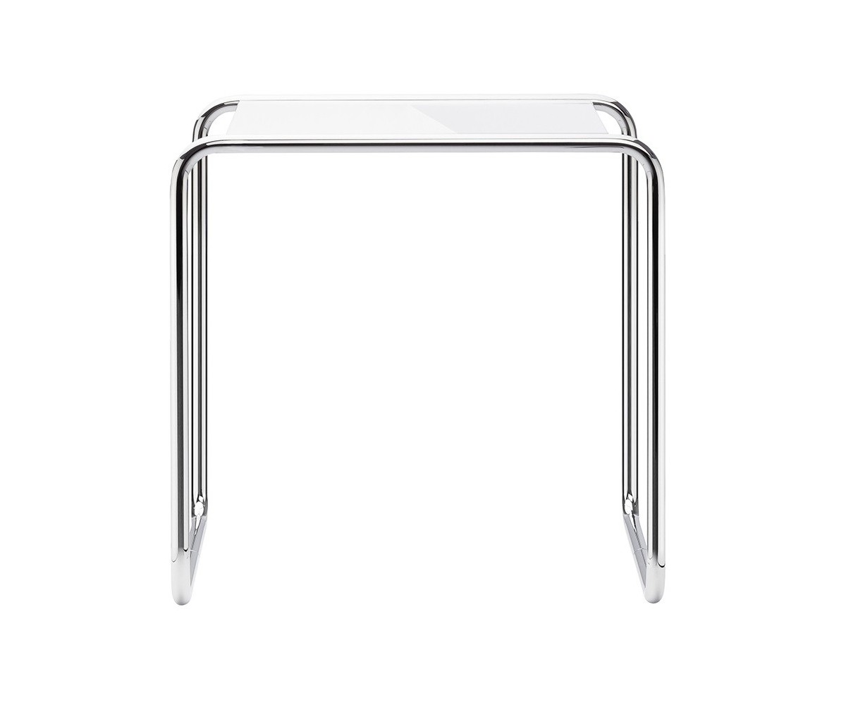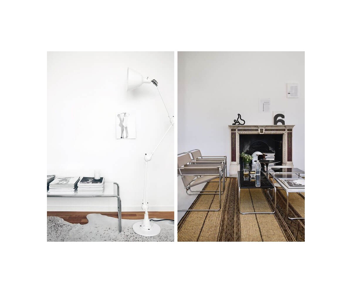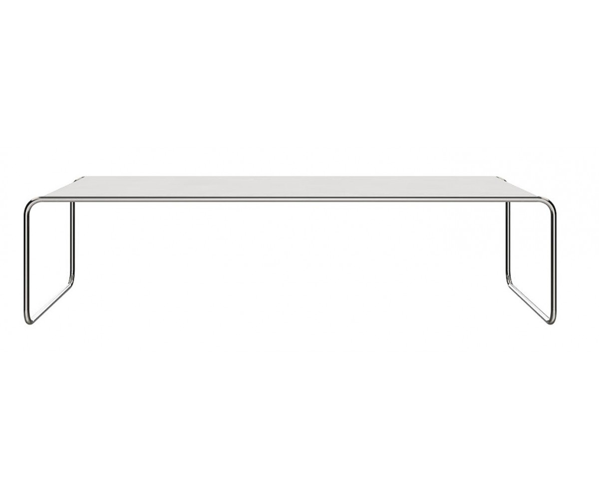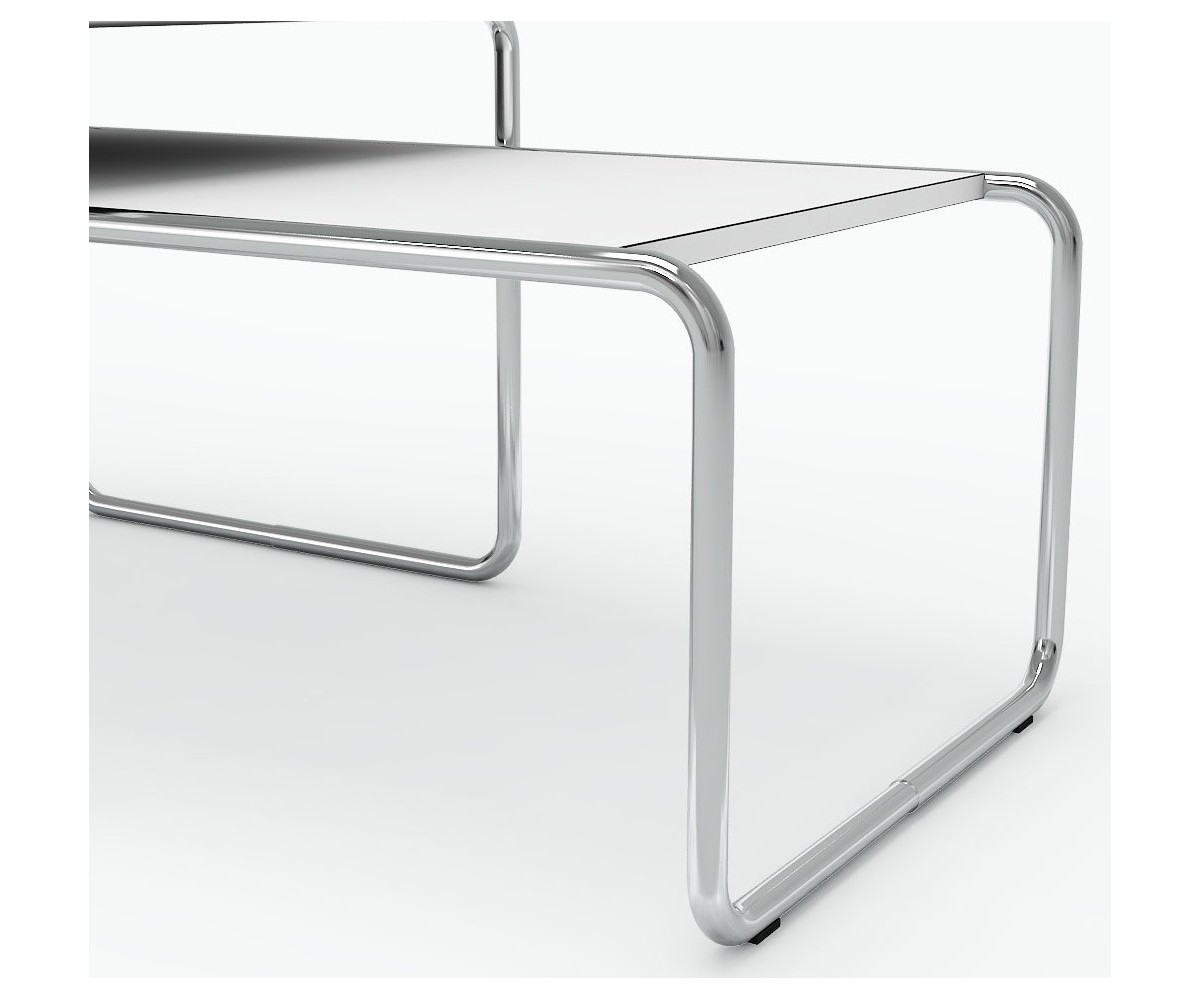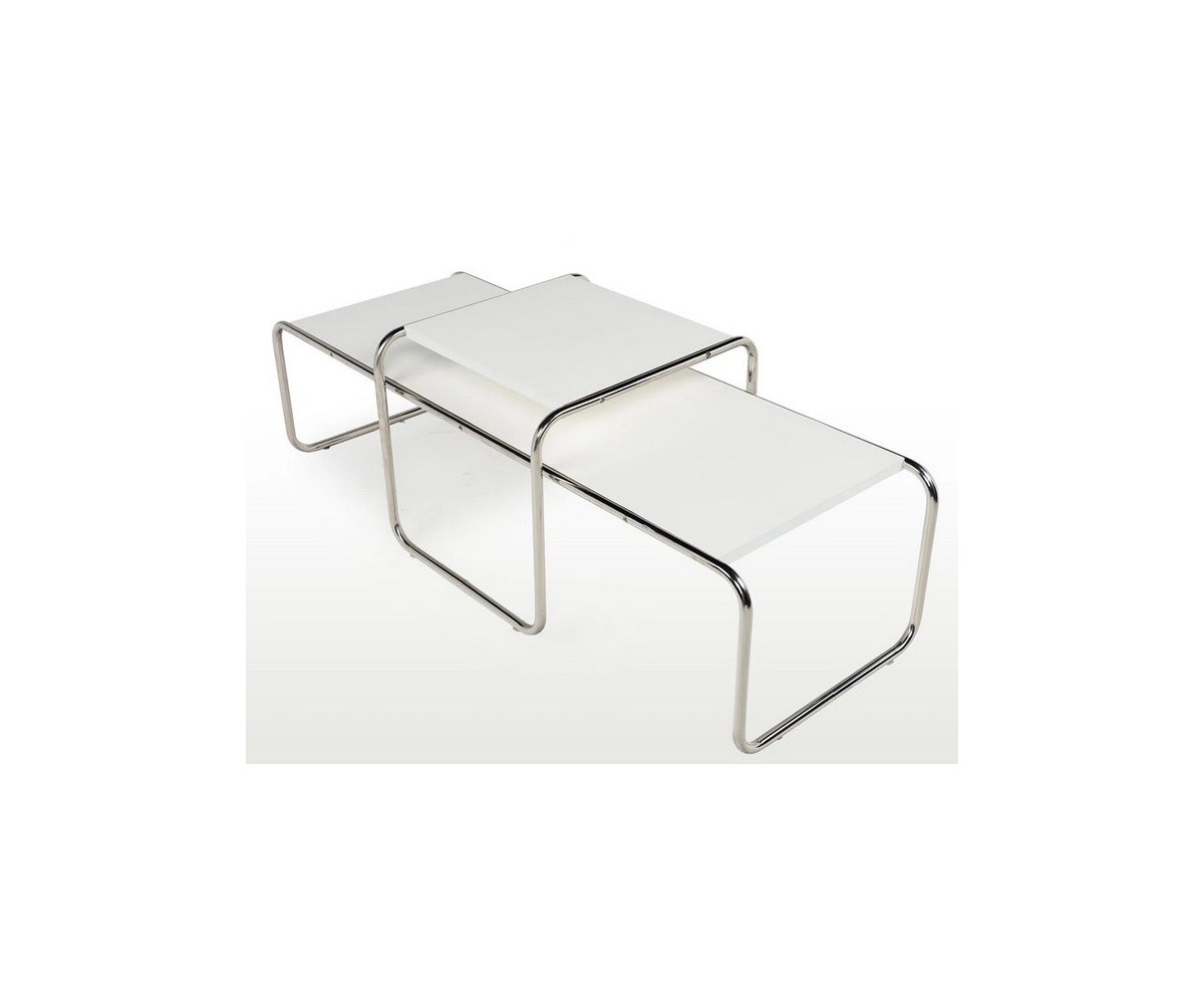 Set Mesa de centro rectangular y cuadrada inspirado en un diseño de Marcel Breuer. Estructura tubular en acero inoxidable terminación brillo, tapa en madera bilaminada color blanca roble macizo, también disponible en color negro. Mesa a juego con el Sillón Wassily. Réplica exacta con materiales originales de máxima calidad.