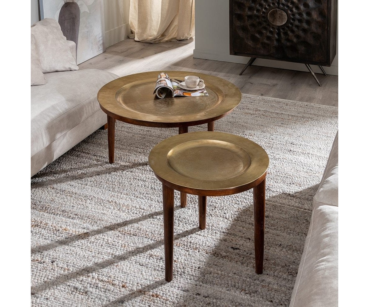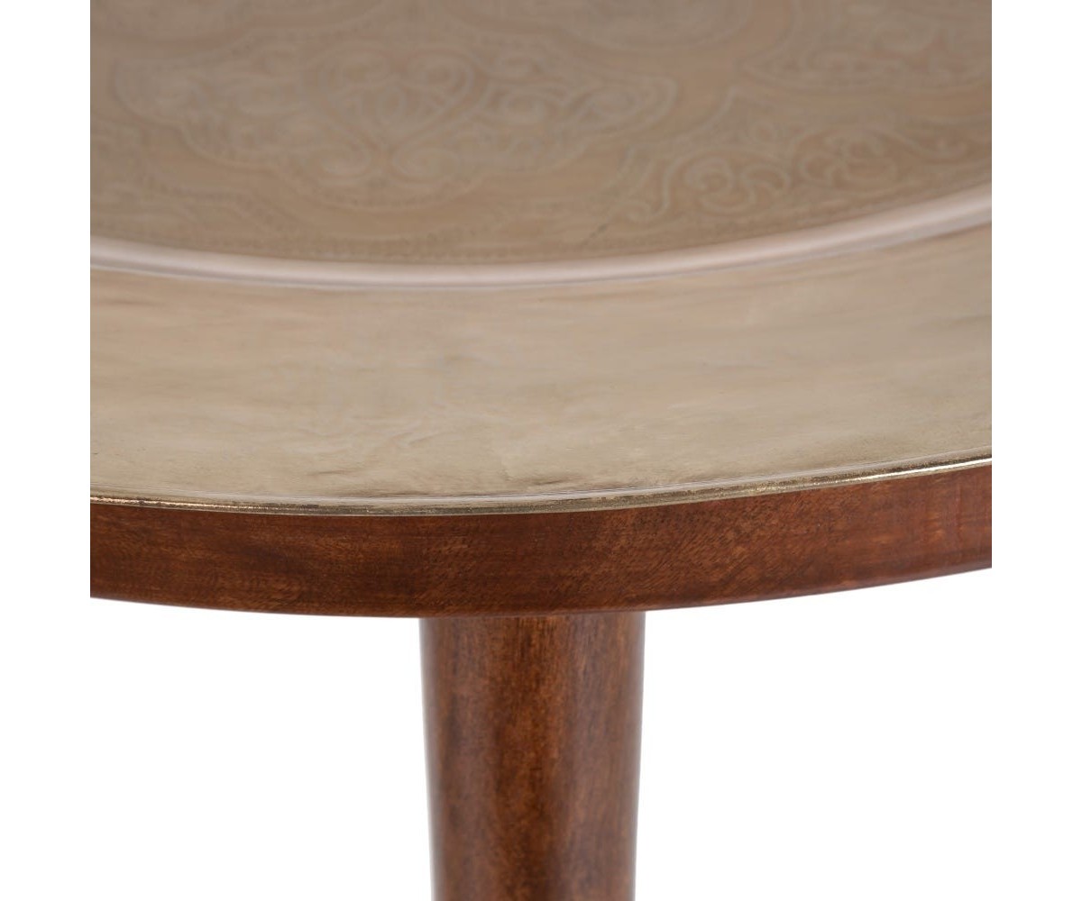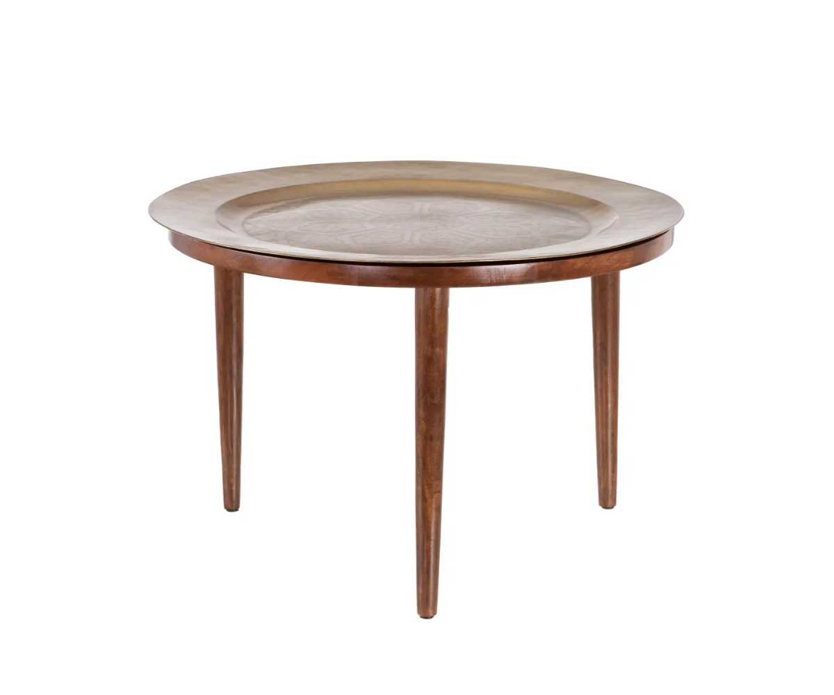 Mesa circular de centro, inspirada en un diseño de Severin Hansen. Fabricada en madera de mango con bandeja en acero dorado grabado. También disponible en mesa auxiliar. Réplica con materiales originales de máxima calidad.