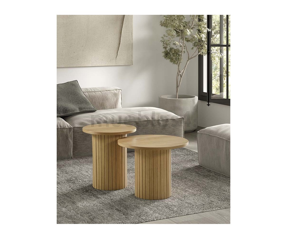 Mesa centro o auxiliar circular inspirada en un diseño de Space Copenhagen. Resultado de una elegante serie de mesas con claras referencias a la carpintería tradicional danesa. Mesas redondas orgánicas para espacios tanto domésticos como públicos.