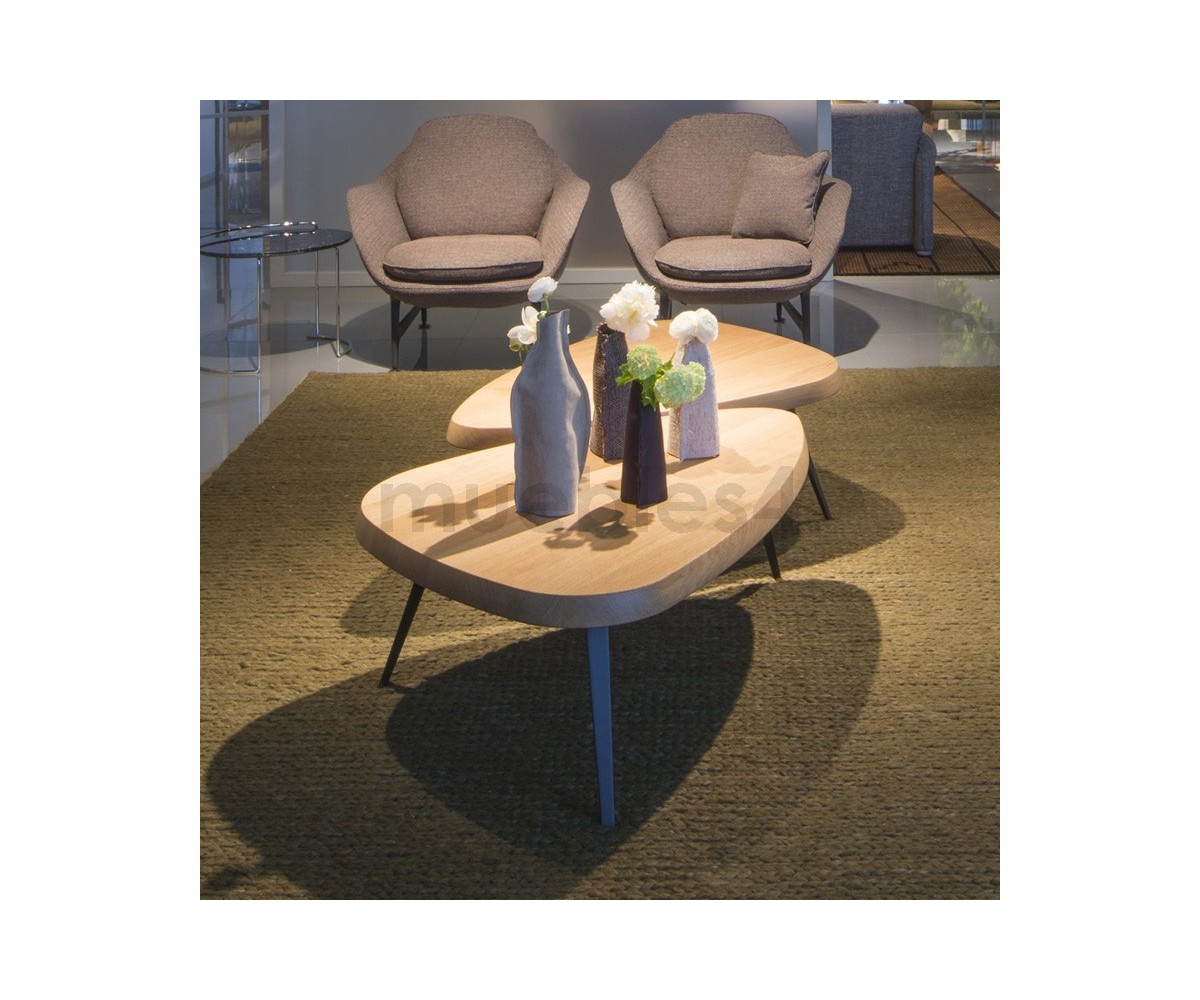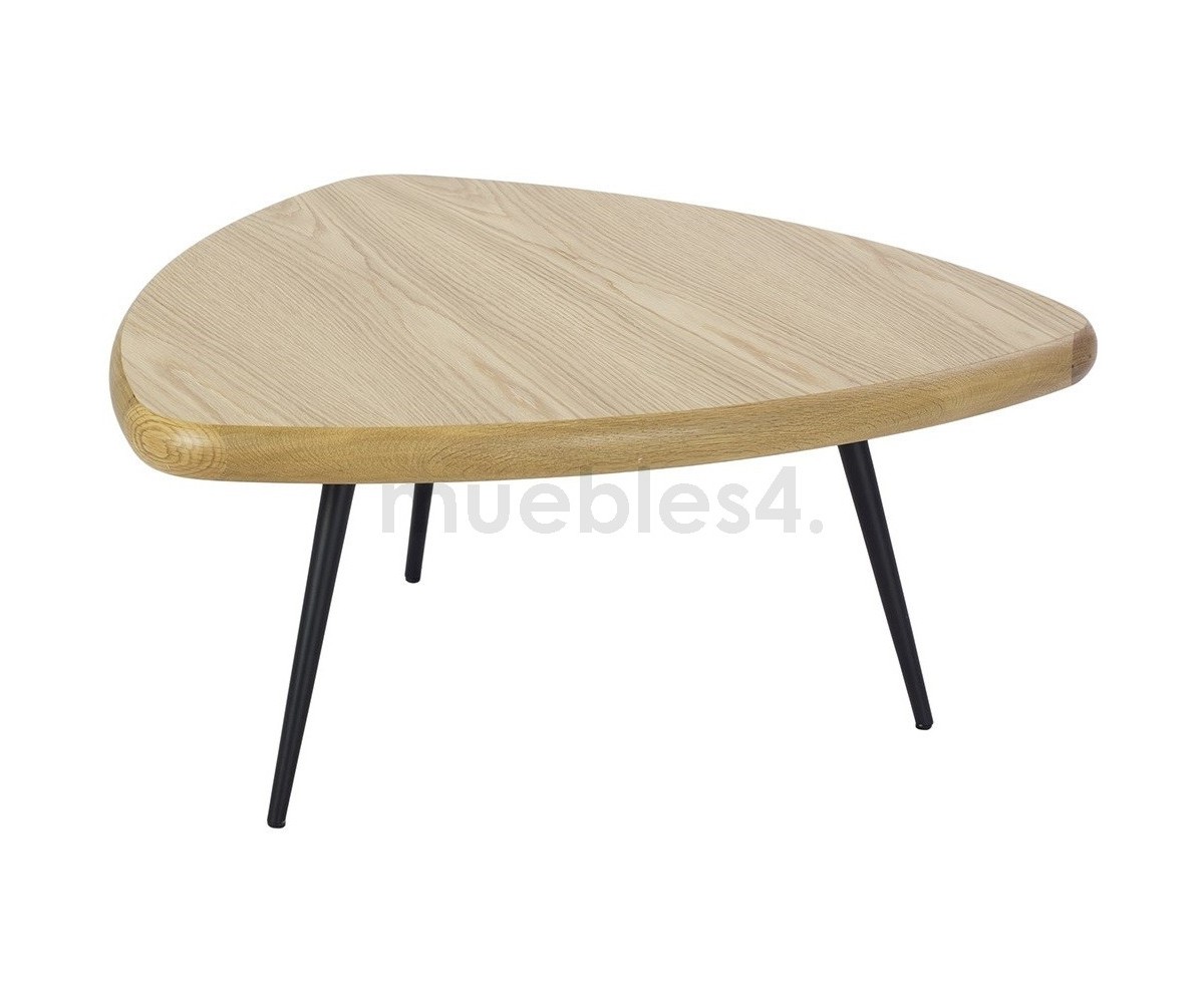 Mesa de centro triangular inspirado en un diseño de Sean Dix. Fabricada en madera maciza de roble americano natual, patas en acero lacodo color negro. Réplica exacta con materiales originales de máxima calidad.
