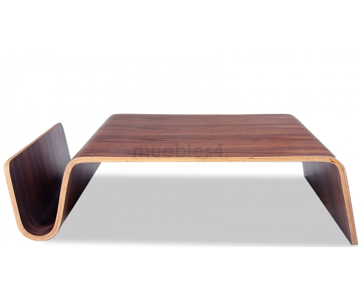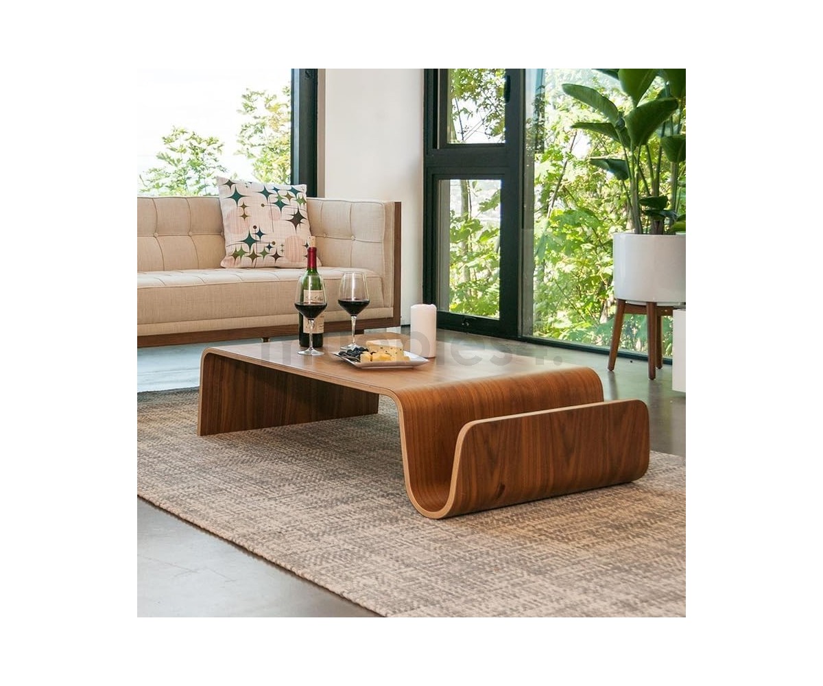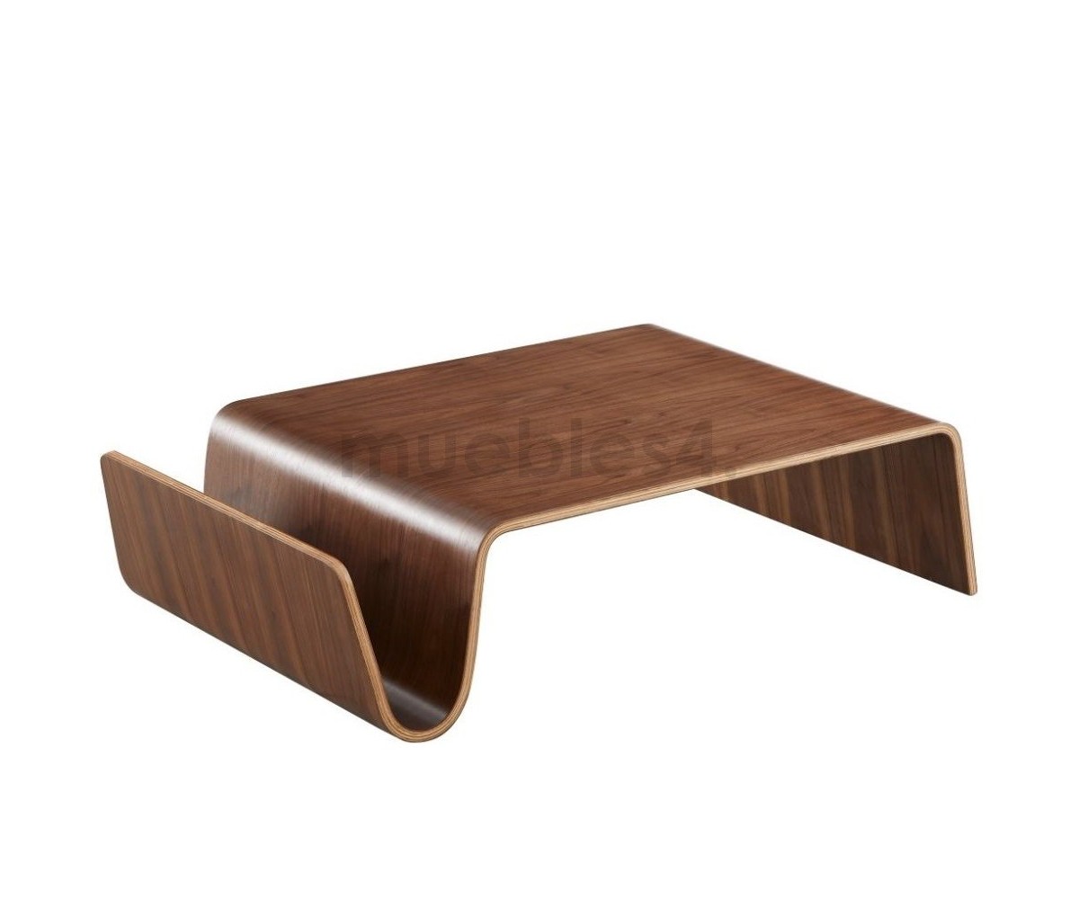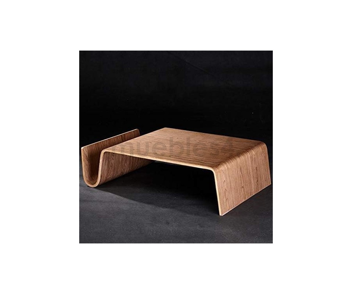 Mesa de centro rectangular con revistero inspirado en un diseño de Eric Pfeiffer. Esta mesa es una pieza contemporánea que demuestra el profundo conocimiento de Pfeiffer sobre la construcción y los materiales de los muebles. Líneas curvas de madera de alta calidad.
