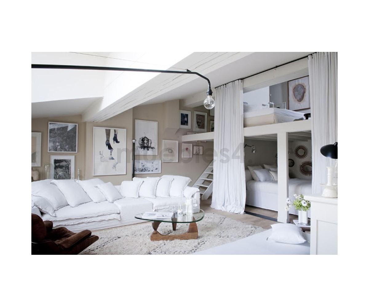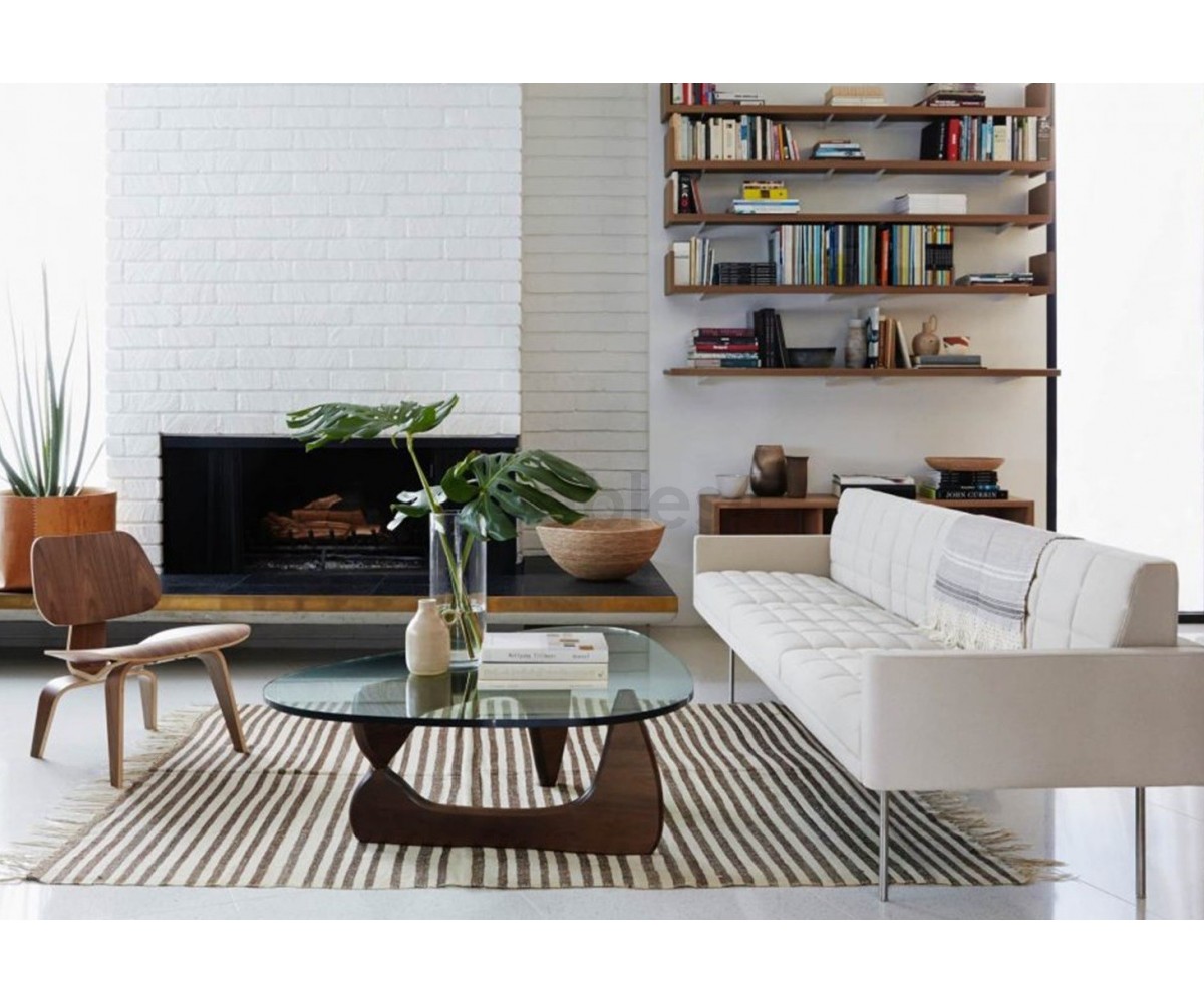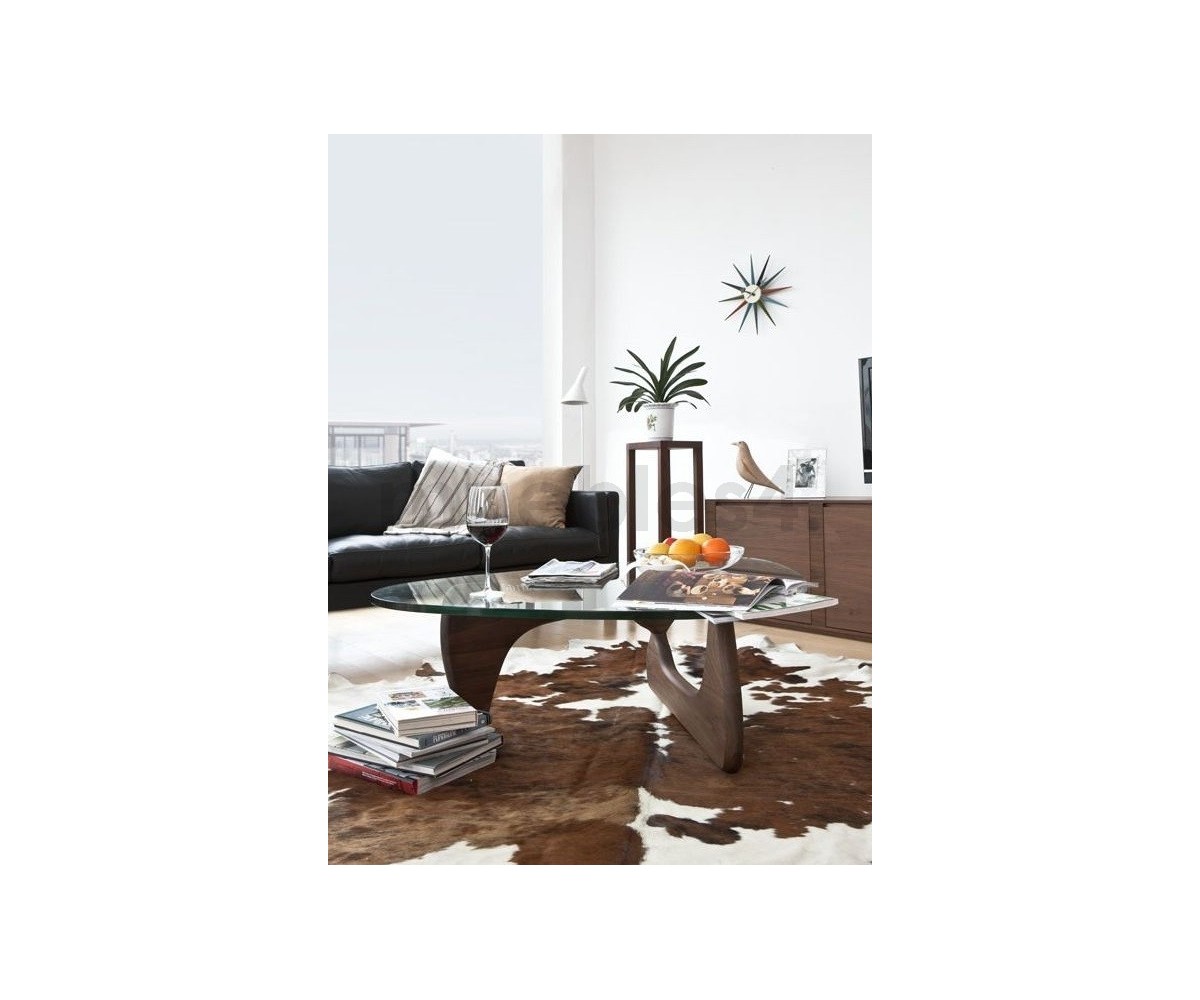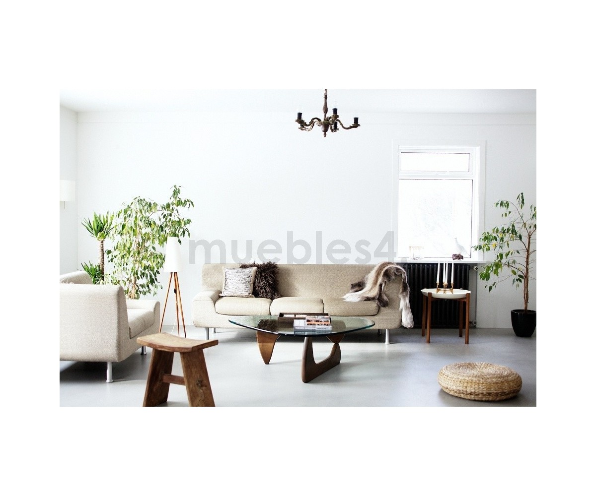 Mesa de centro inspirada en un diseño de Isamu Noguchi. Mueble escultórico, sobre dos elementos idénticos de madera en ángulo recto, sobre el que descansa un pesado tablero de cristal. Calificado como uno de los mejores diseño del Siglo XX, convirtiéndose en uno de los modelos favoritos de su creador.