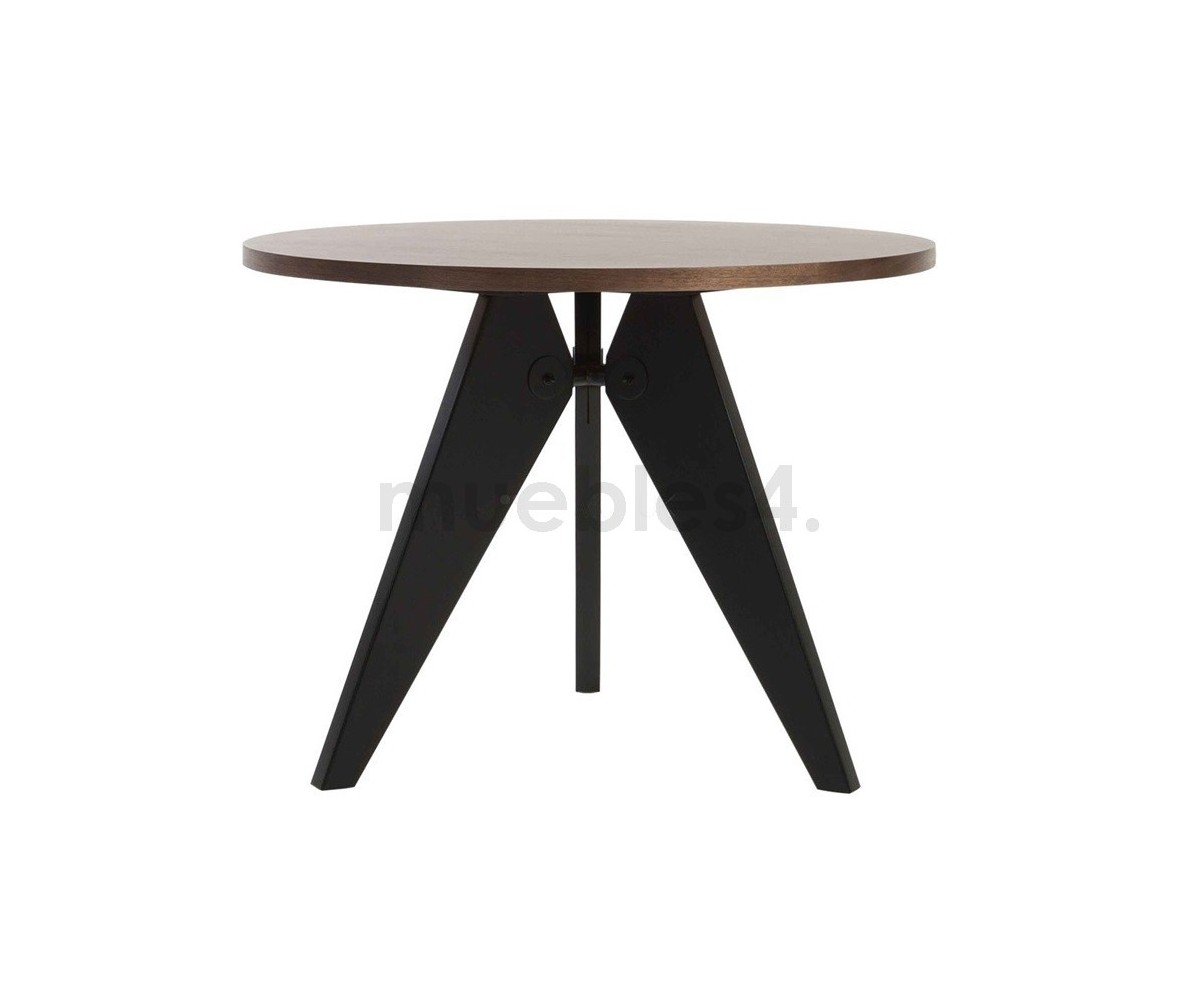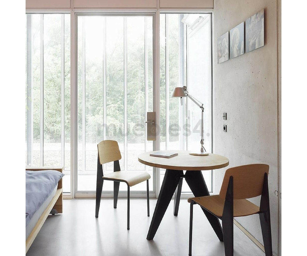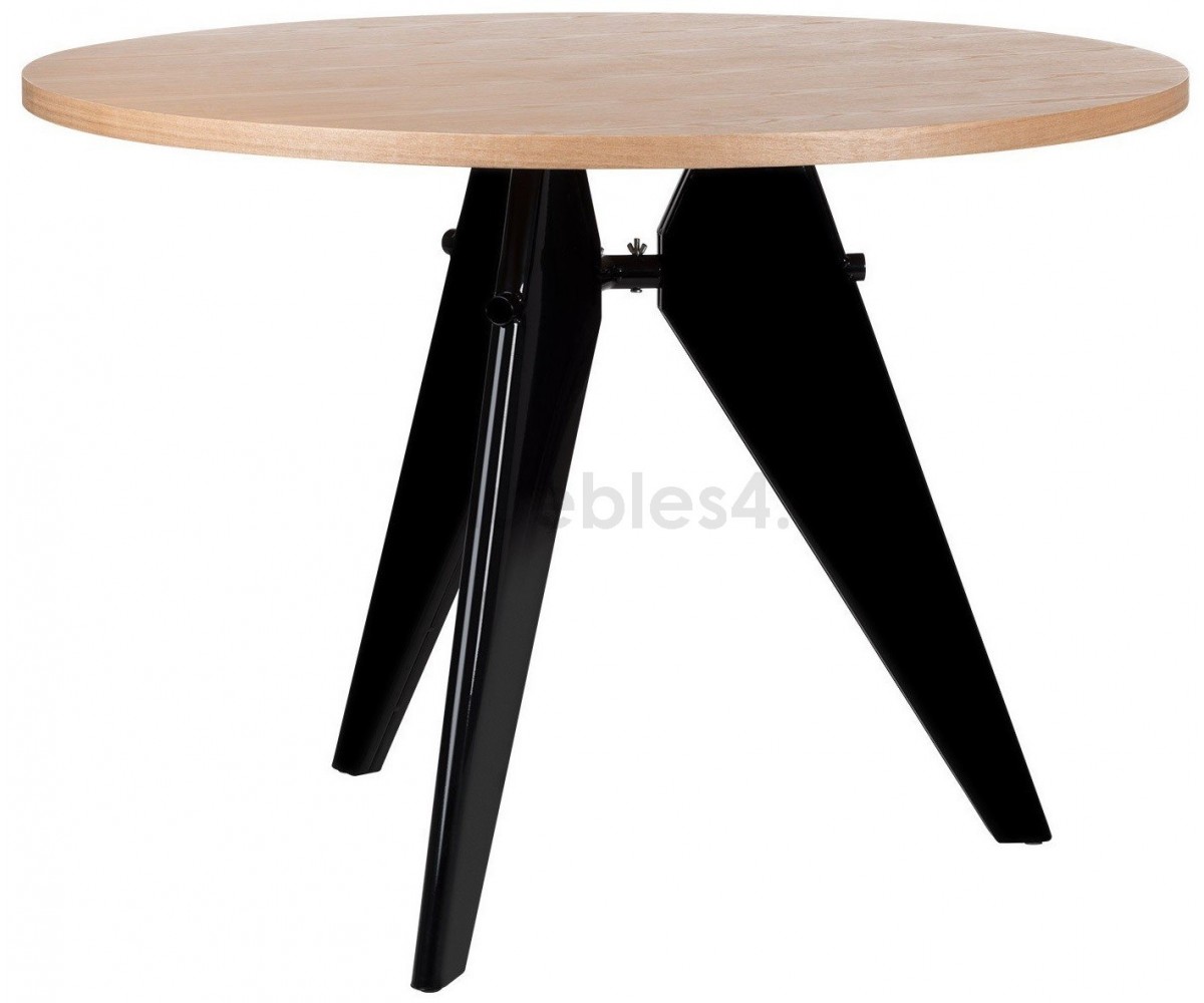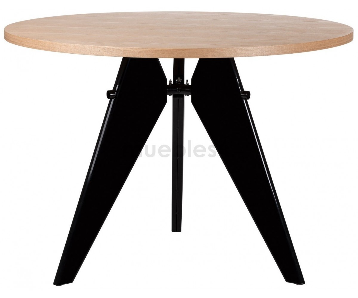 Mesa de comedor circular inspirada en un diseño de Jean Prouvé. Fabricada en madera de fresno macizo, estructura de acero triple lacado al horno en color negro para unir las 3 patas que le aporta gran estabilidad y resistencia. Réplica exacta con materiales originales de máxima calidad.