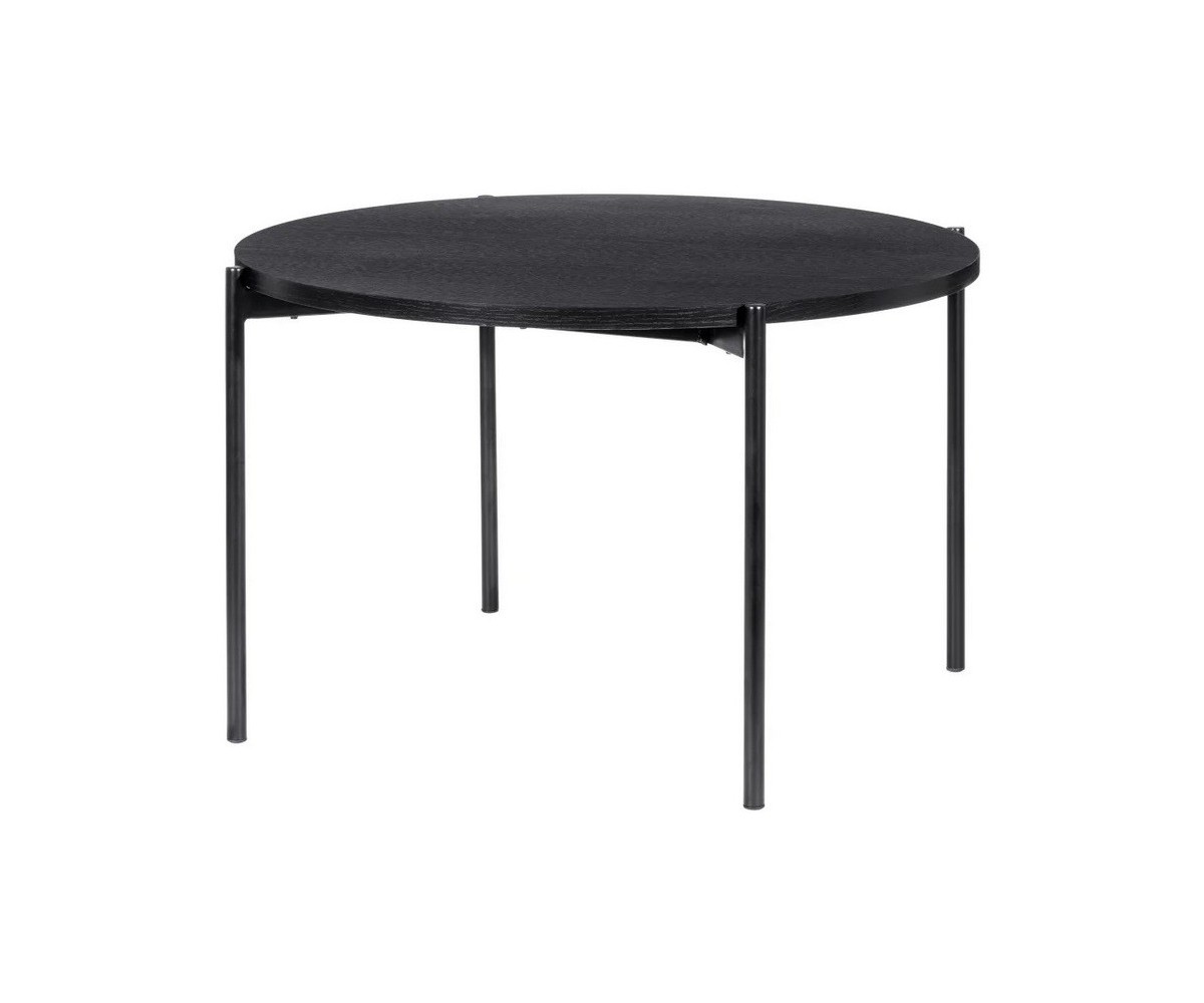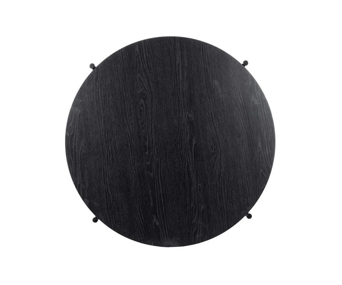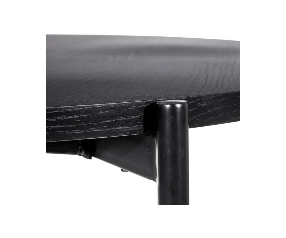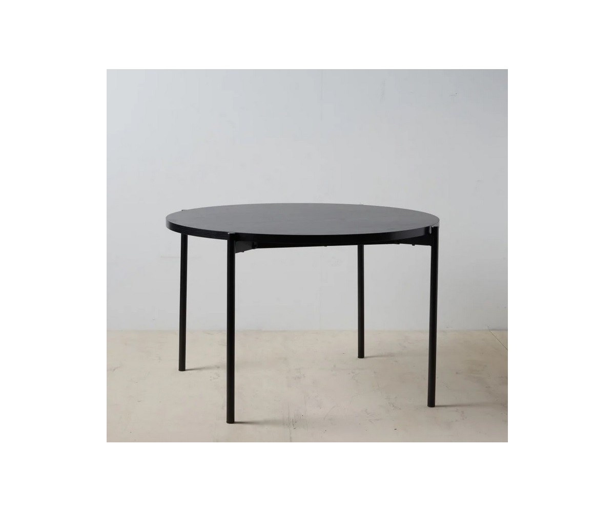 Mesa de comedor italiana inspirada en un diseño Federica Capitani. Estructura fabricada en acero tubular con triple lacado color negro, sobre circular en madera de roble teñido negro. Disponible en mesa auxiliar y centro con tapa en granito negro. Réplica exacta con materiales originales de máxima calidad.