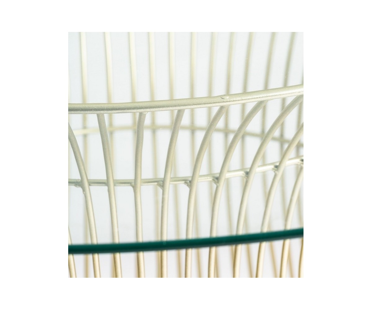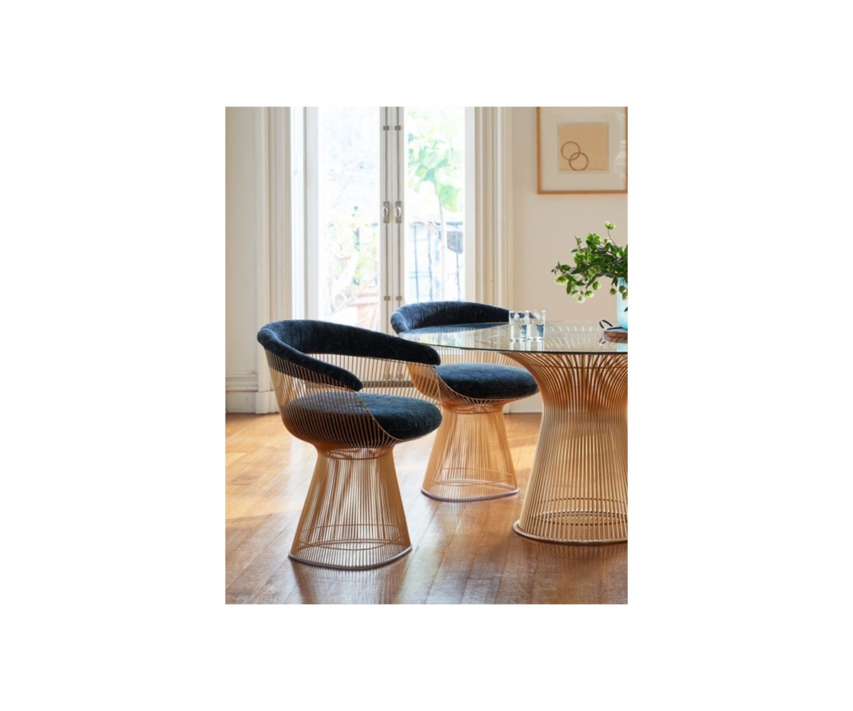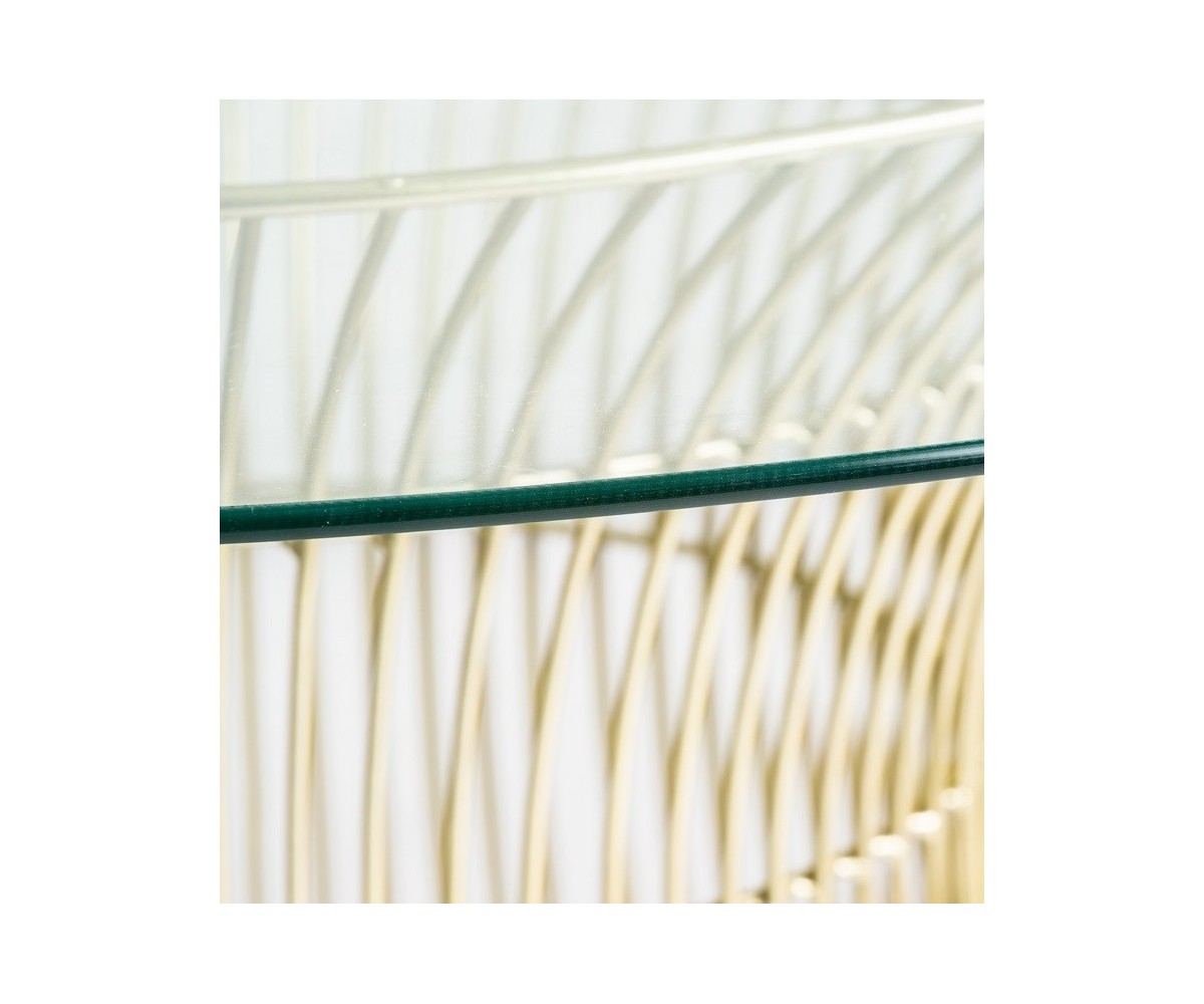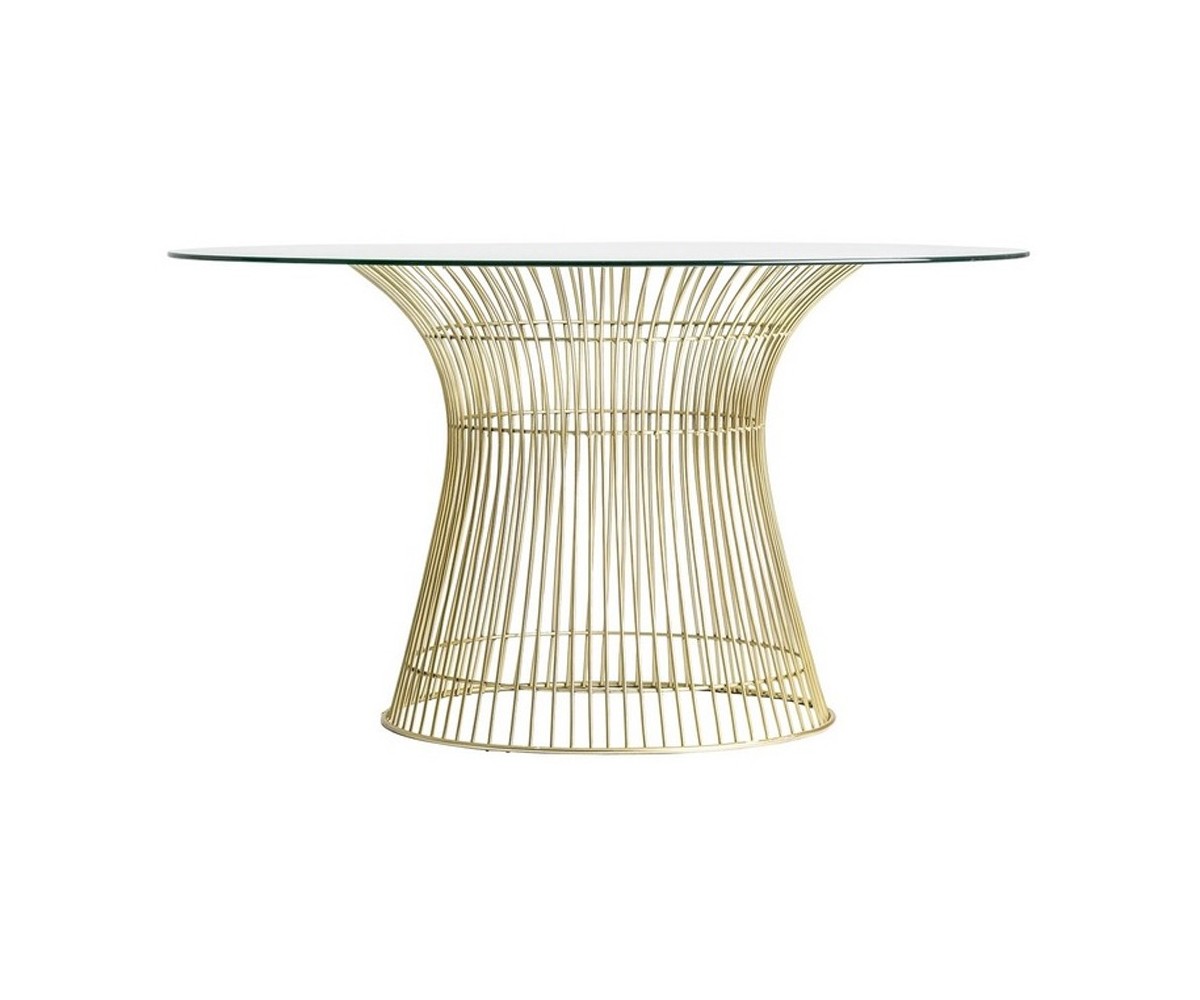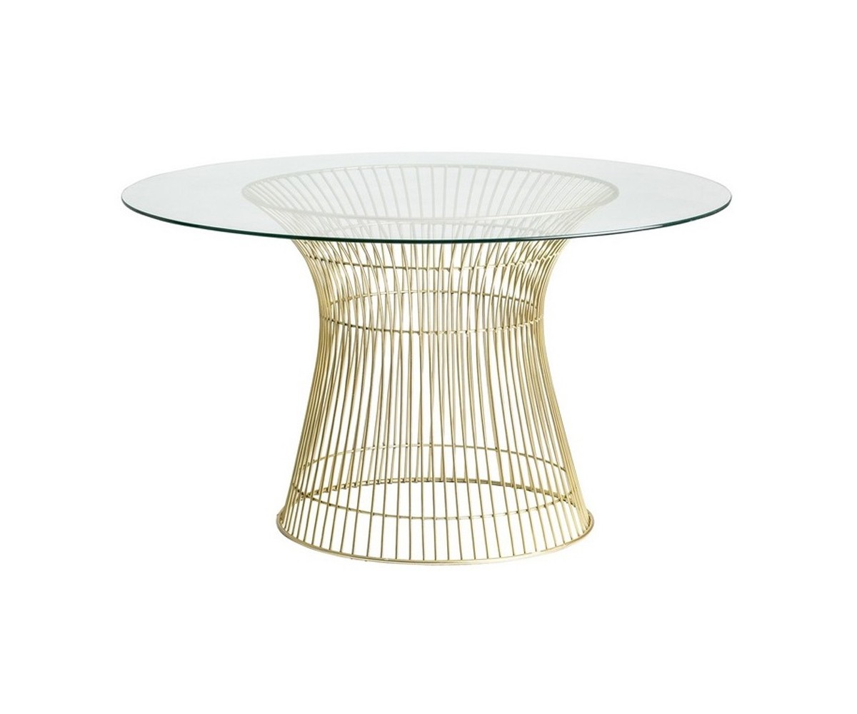 Mesa art decp circular Platner Gold, inspirada en un diseño de Réplica exacta con materiales originales de máxima calidad.. Base fabricada mediante barras tubulares con triple lacado color dorado, terminación brillo, tapa circular de cristal templado transparente. Réplica exacta con materiales originales de máxima calidad.