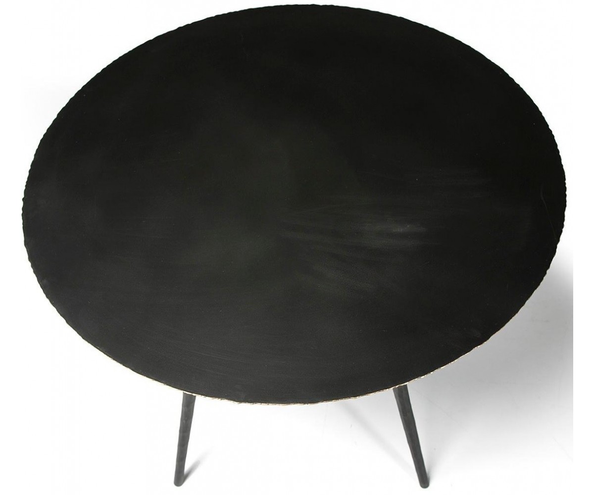 Mesa comedor circular Discipline Bridge, inspirada en un diseño de Ichiro Iwasaki. Base tripode tubular en acero con triple lacado color negro, tapa circular lacado en negro, borde dorado uniforme. También disponible en mesa de auxiliar. Réplica exacta con materiales originales de máxima calidad.
