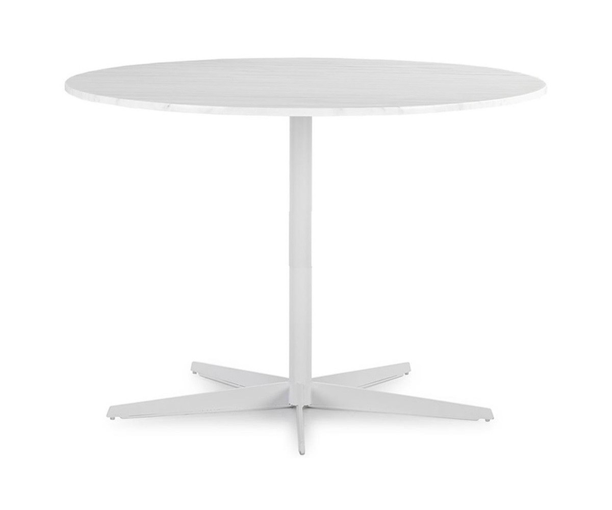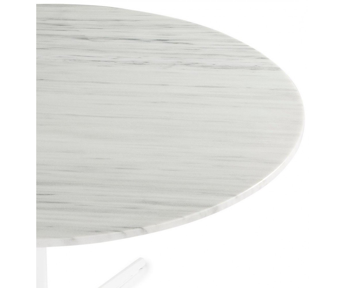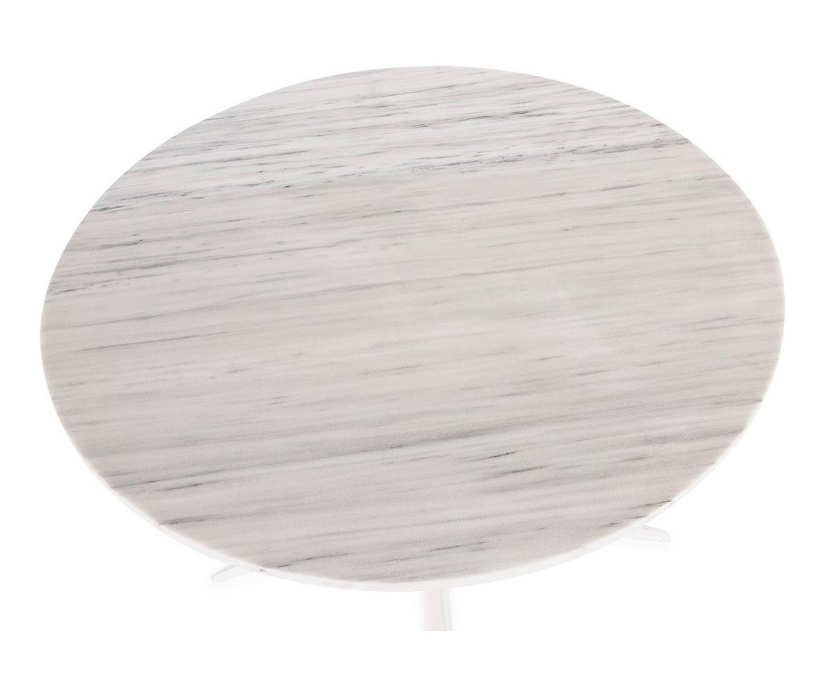 Mesa circular de diseño clásico, contemporaneo inspirada en Arne Jacobsen. Base tubular con cinco aspas con triple lacado color blanco, tapa en mármol blanco veteado. La piedra al ser un material natural puede tener ligera variación en el dibujo. Réplica exacta con materiales originales de máxima calidad.