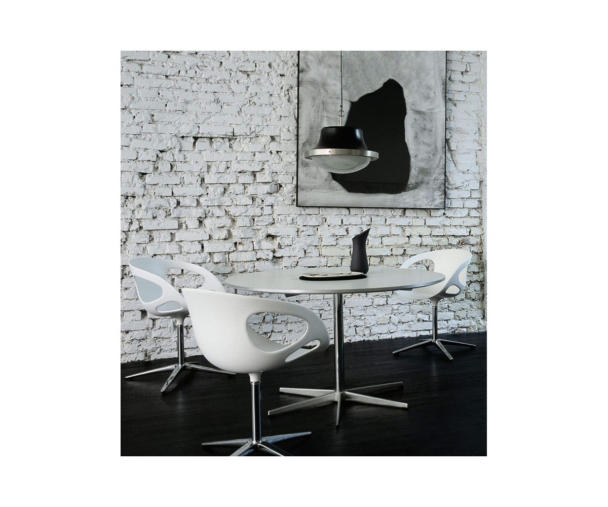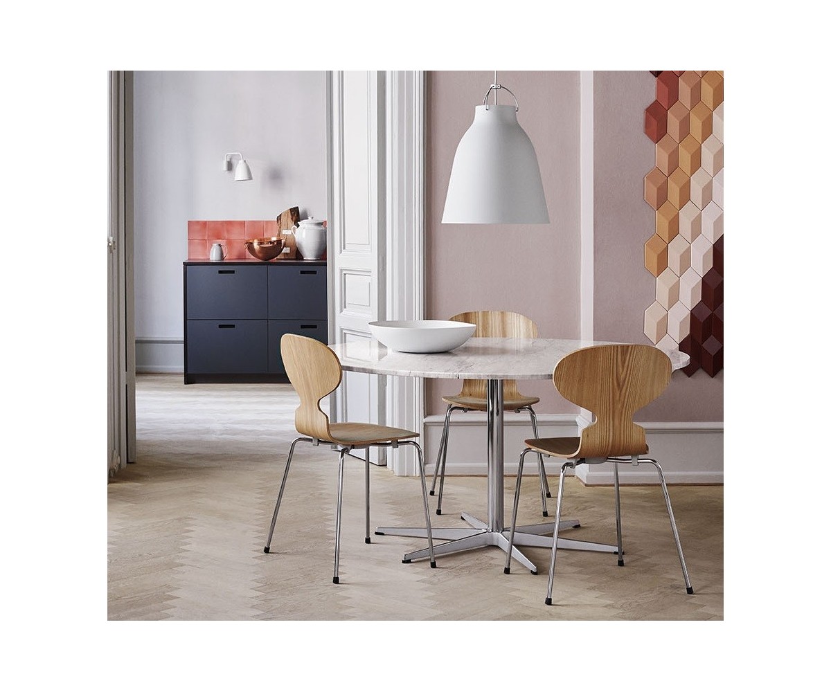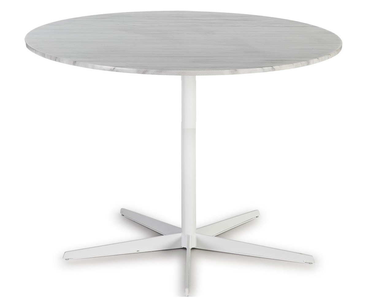 Mesa circular de diseño clásico, contemporaneo inspirada en Arne Jacobsen. Base tubular con cinco aspas con triple lacado color blanco, tapa en mármol blanco veteado. La piedra al ser un material natural puede tener ligera variación en el dibujo. Réplica exacta con materiales originales de máxima calidad.