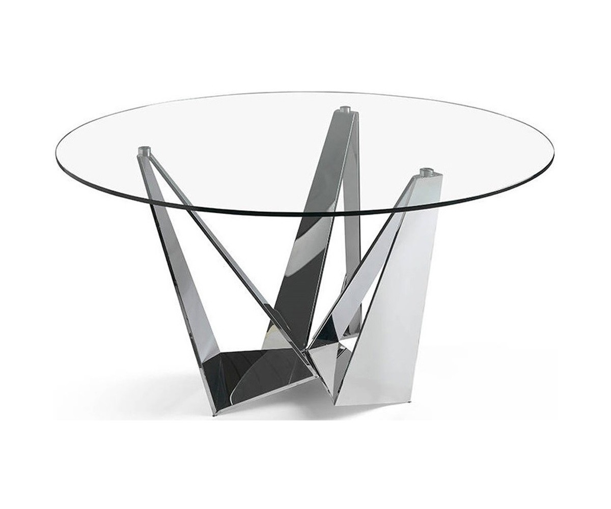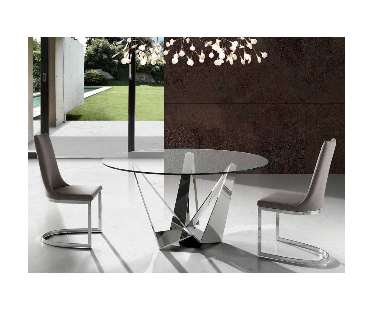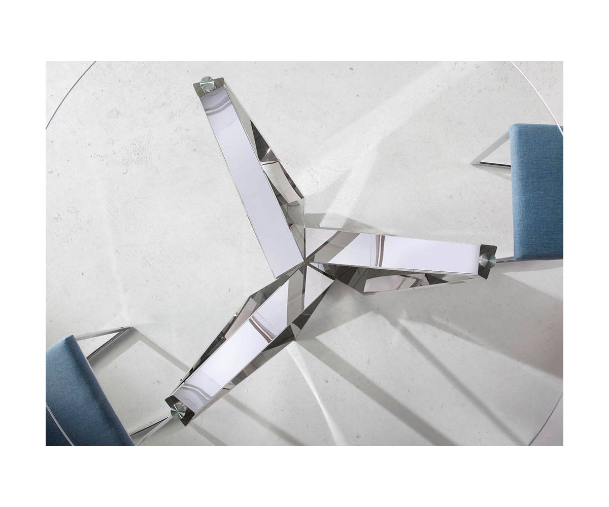 Mesa de comedor circular inspirado en un diseño de Andrea Lucatello para Cattelan Italia. Base en acero inoxidable de 22 micras, tapa circular fija de cristal templado transparente de 12mm, de grosor. OPCIÓN TAPA MÁRMOL PORCELANICO blanco, CONSULTAR. DISPONIBLE EN 130cm y 140cm, CONSULTAR. Réplica exacta con materiales originales de máxima calidad.