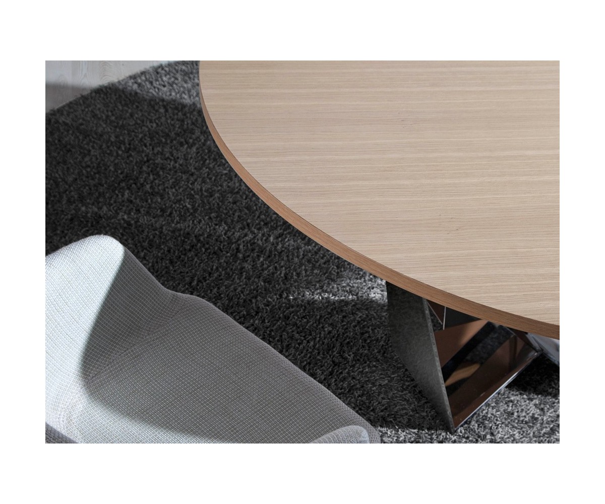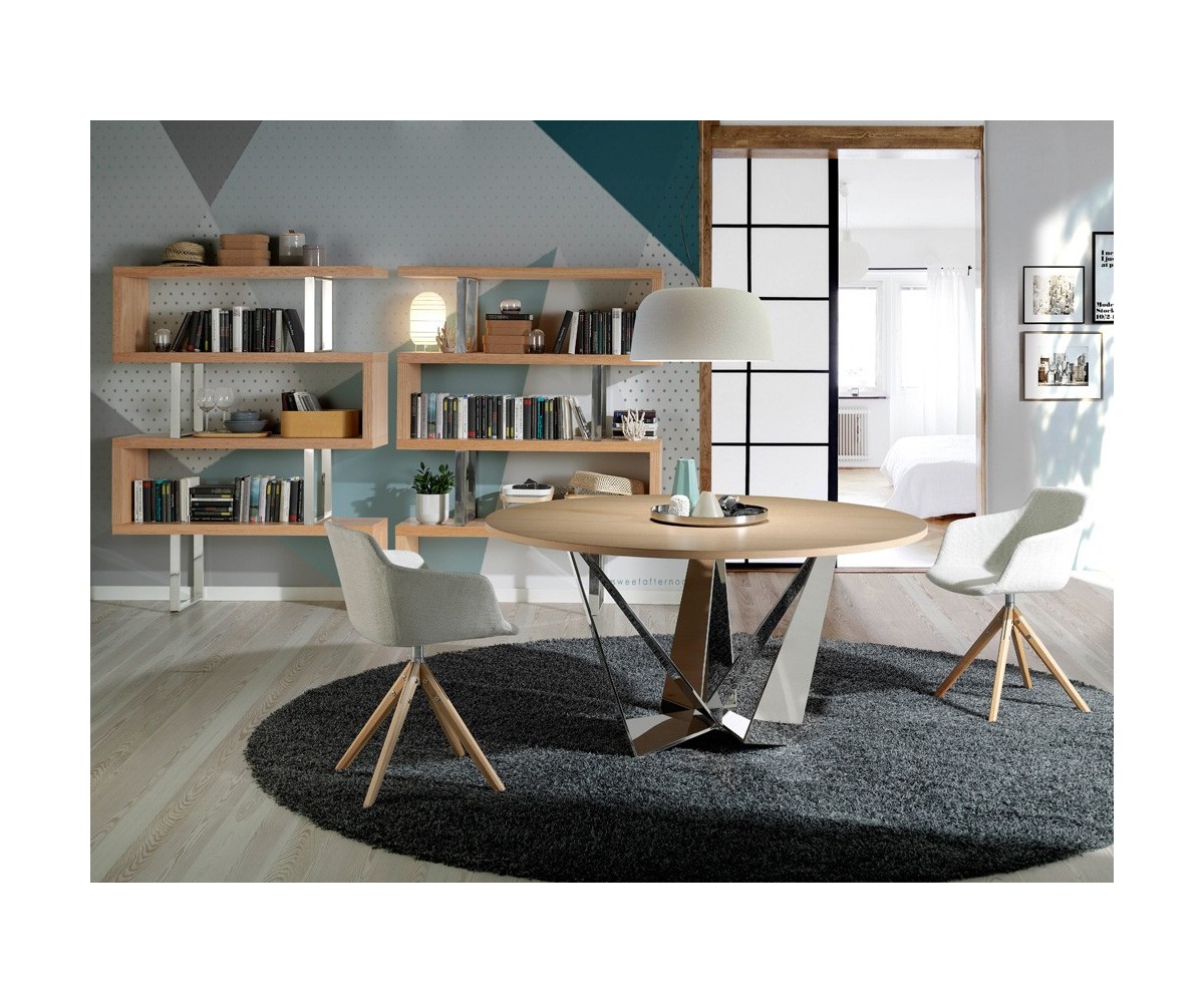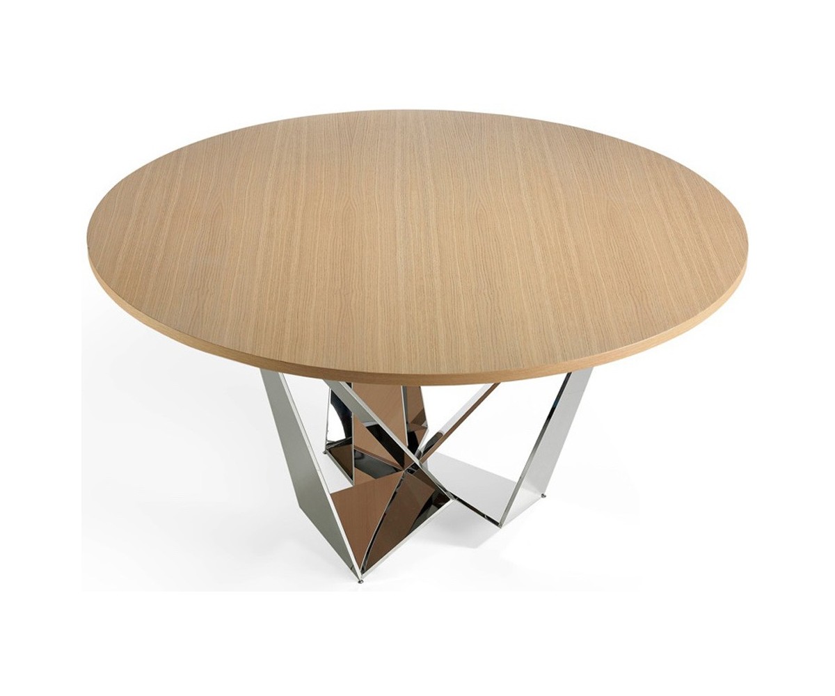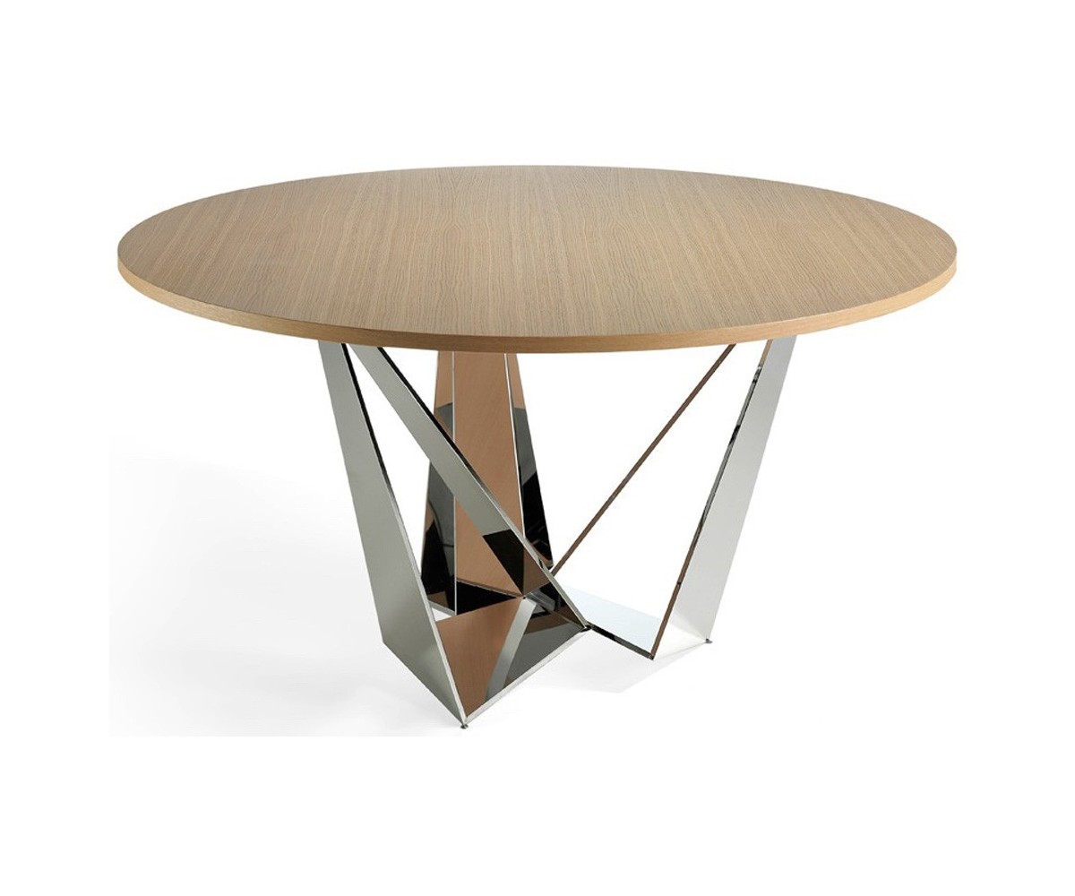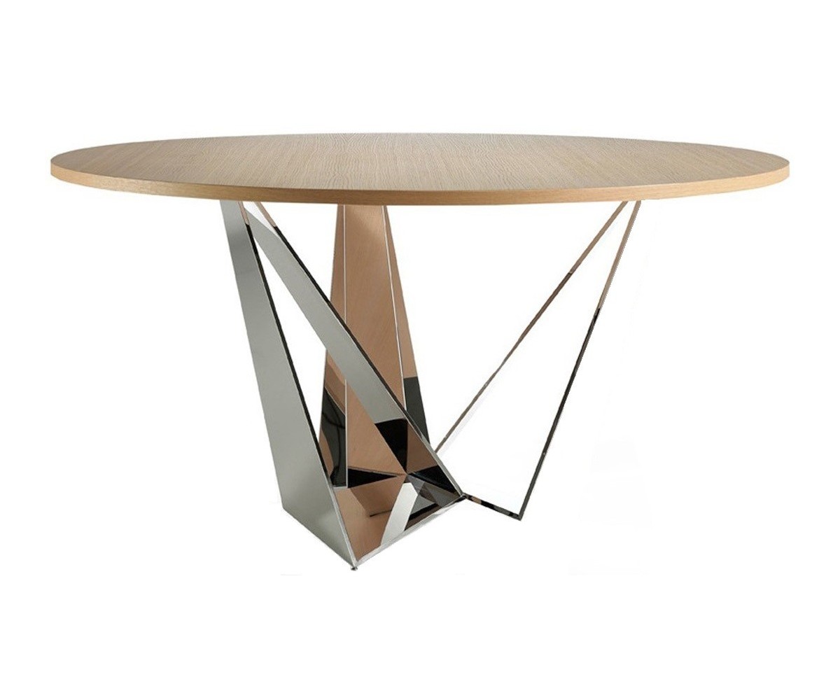 Mesa de comedor circular inspirado en un diseño de Andrea Lucatello para Cattelan Italia. Base en acero inoxidable de 22 micras, tapa circular fija de madera de roble. Réplica exacta con materiales originales de máxima calidad.
