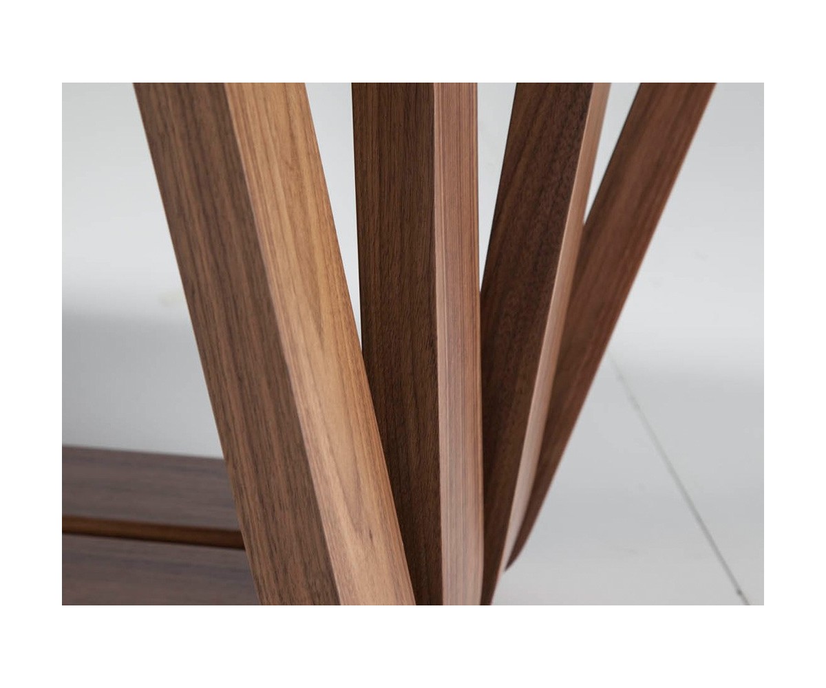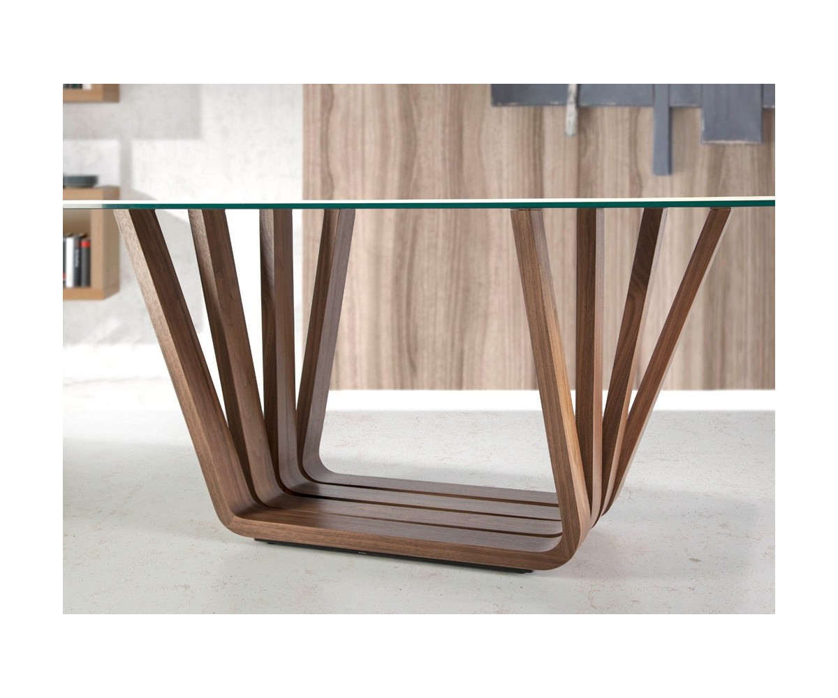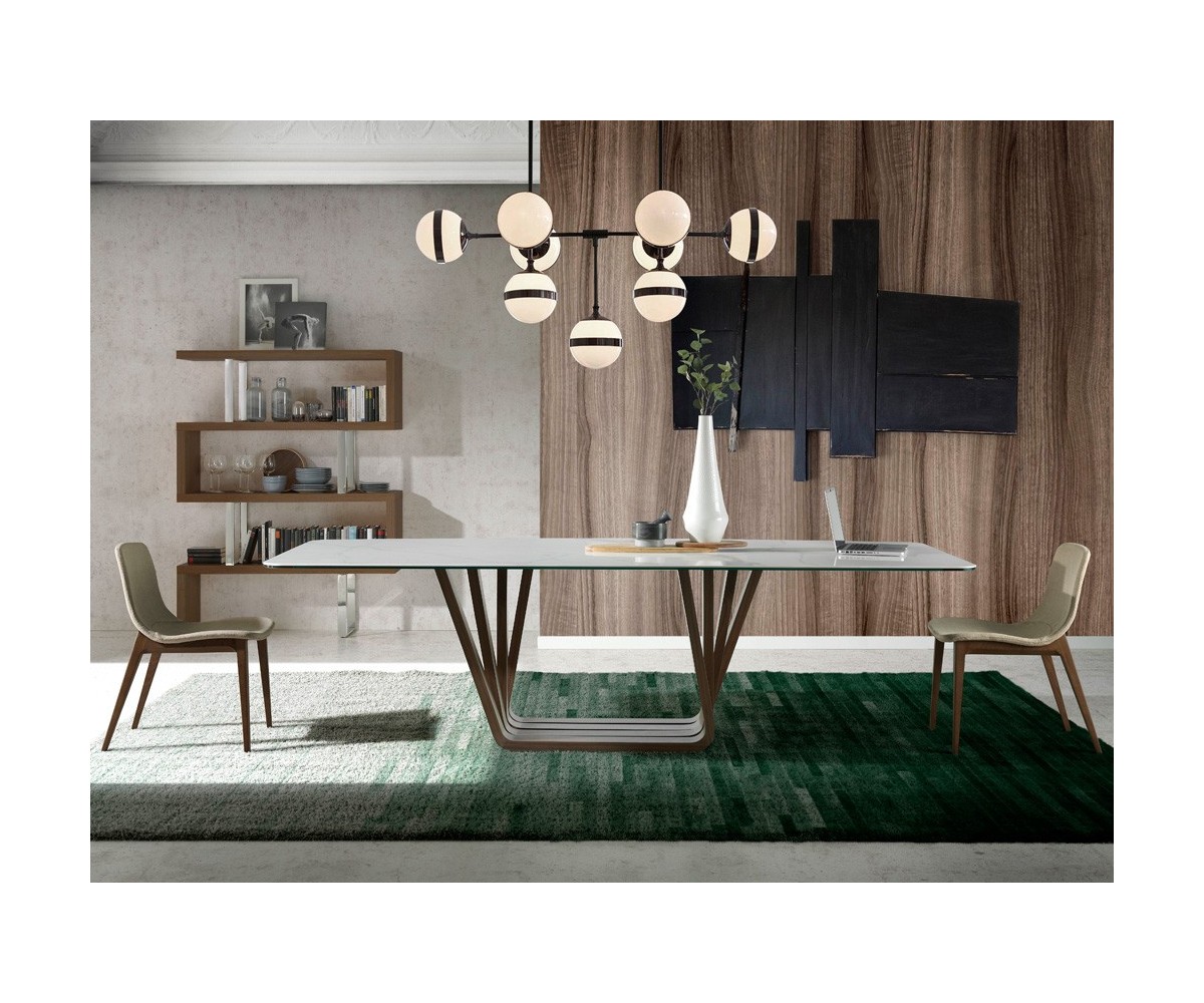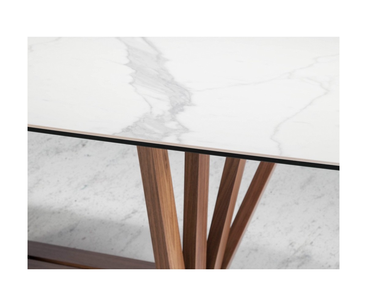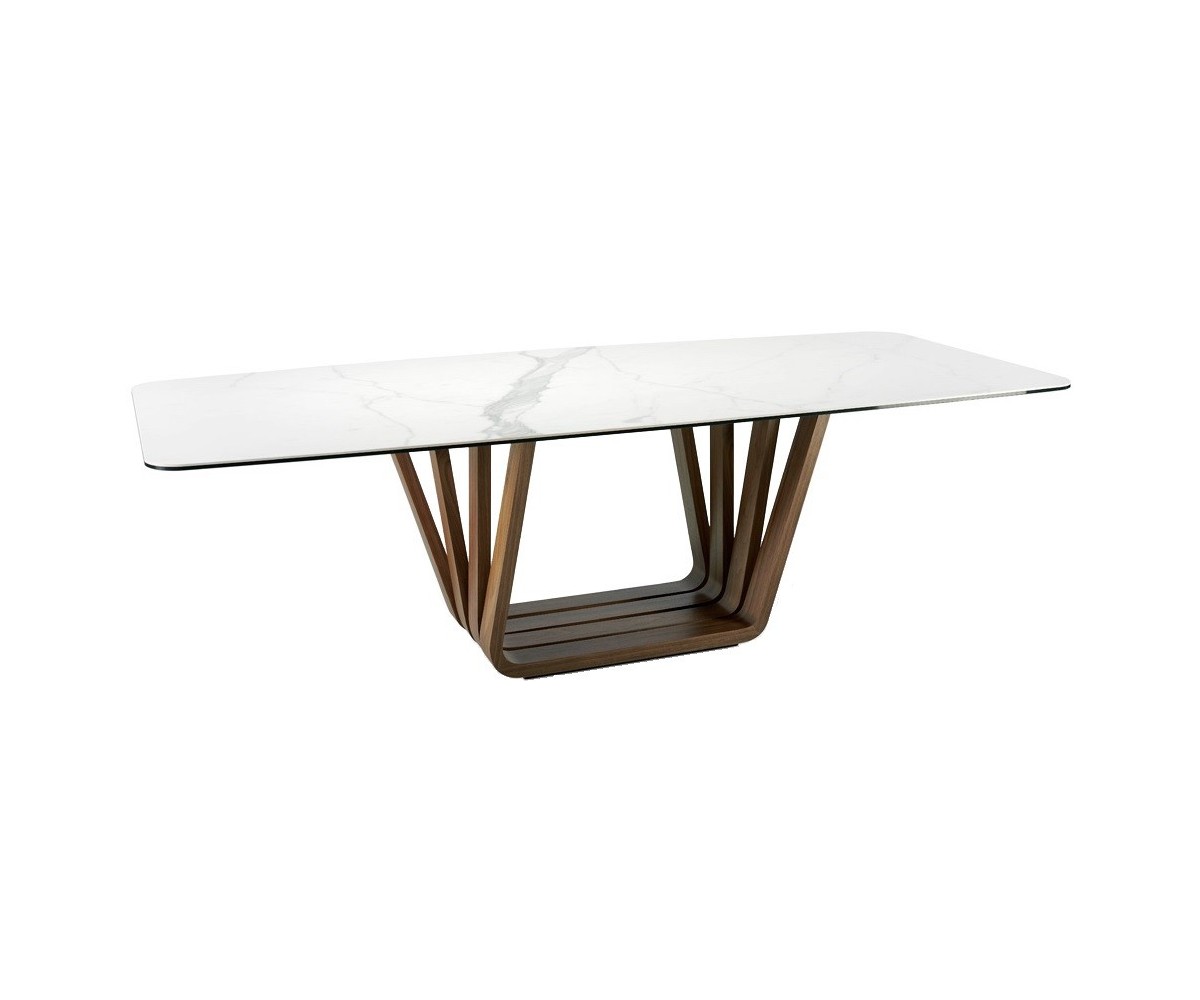 Mesa de comedor inspirada en un diseño de Andrea Lucatello para Cattelan. Tapa ovalada barril cantos redondeados y tapa fija de porcelánico blanco de 6mm sobre cristal negro de 8mm con cantos pulidos. Estructura madera en nogal natural de 0.5 mm de espesor sobre base en acero epoxi color negro. Réplica exacta con materiales originales de máxima calidad.