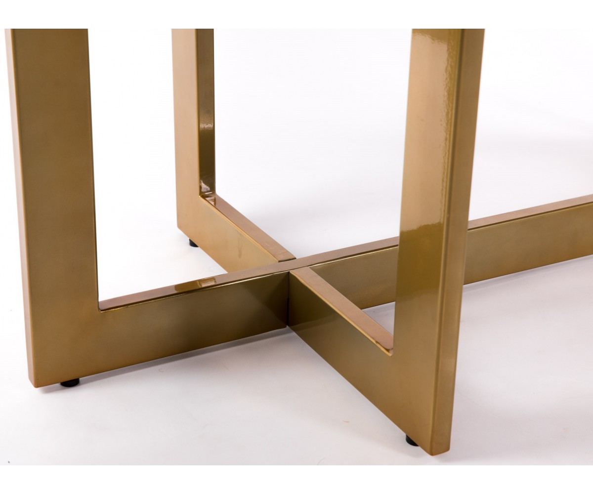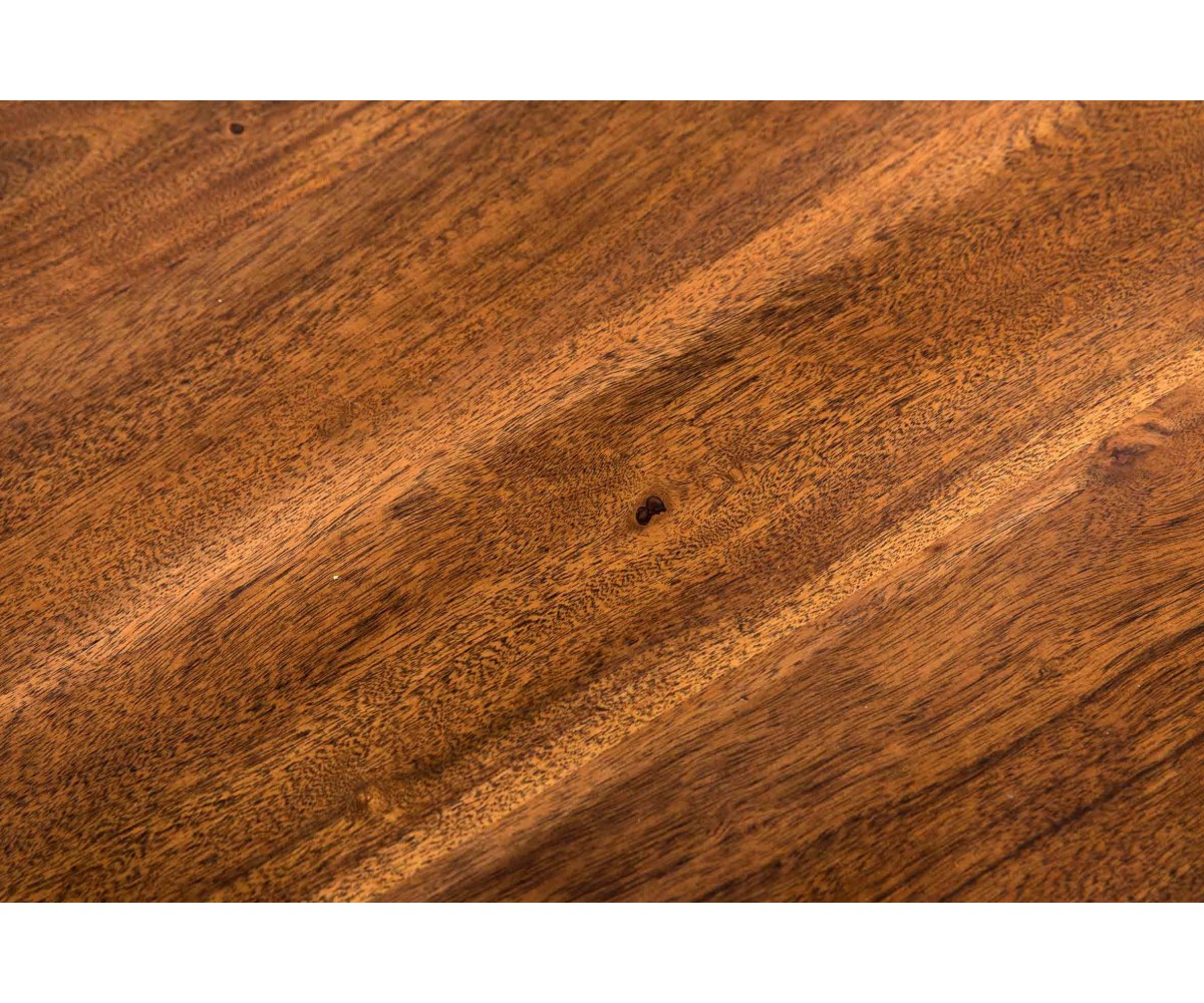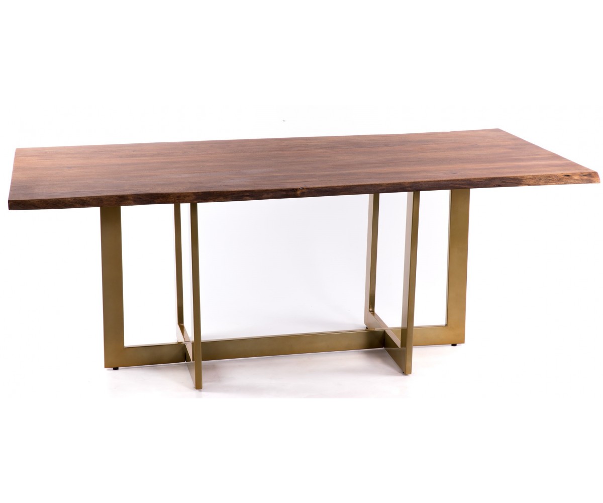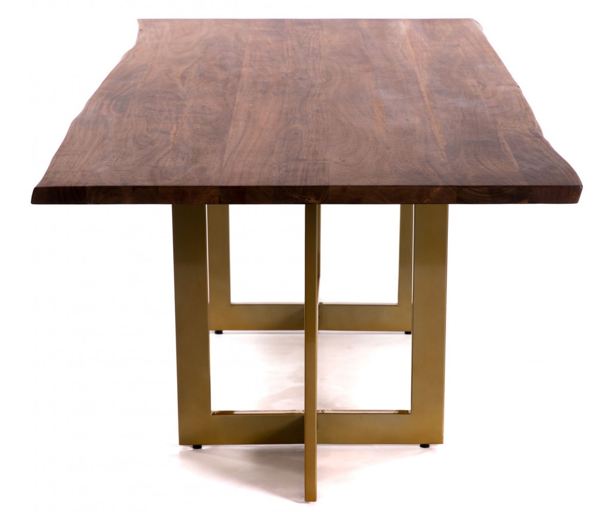 Mesa de comedor rectangular inspirada en un diseño de Gabriele Cappelletti. Estructura fabricada en acero con triple lacado color dorado. Tapa en madera de acacia oscura maciza de forma irregular. Réplica exacta con materiales originales de máxima calidad.