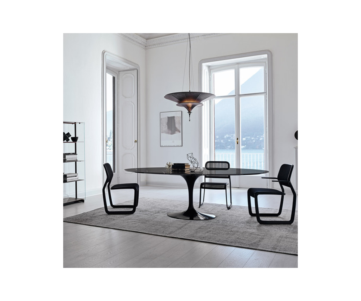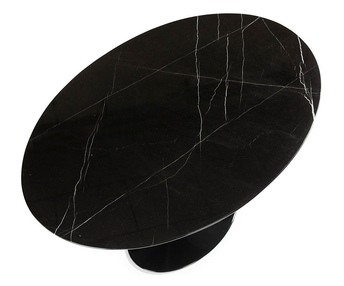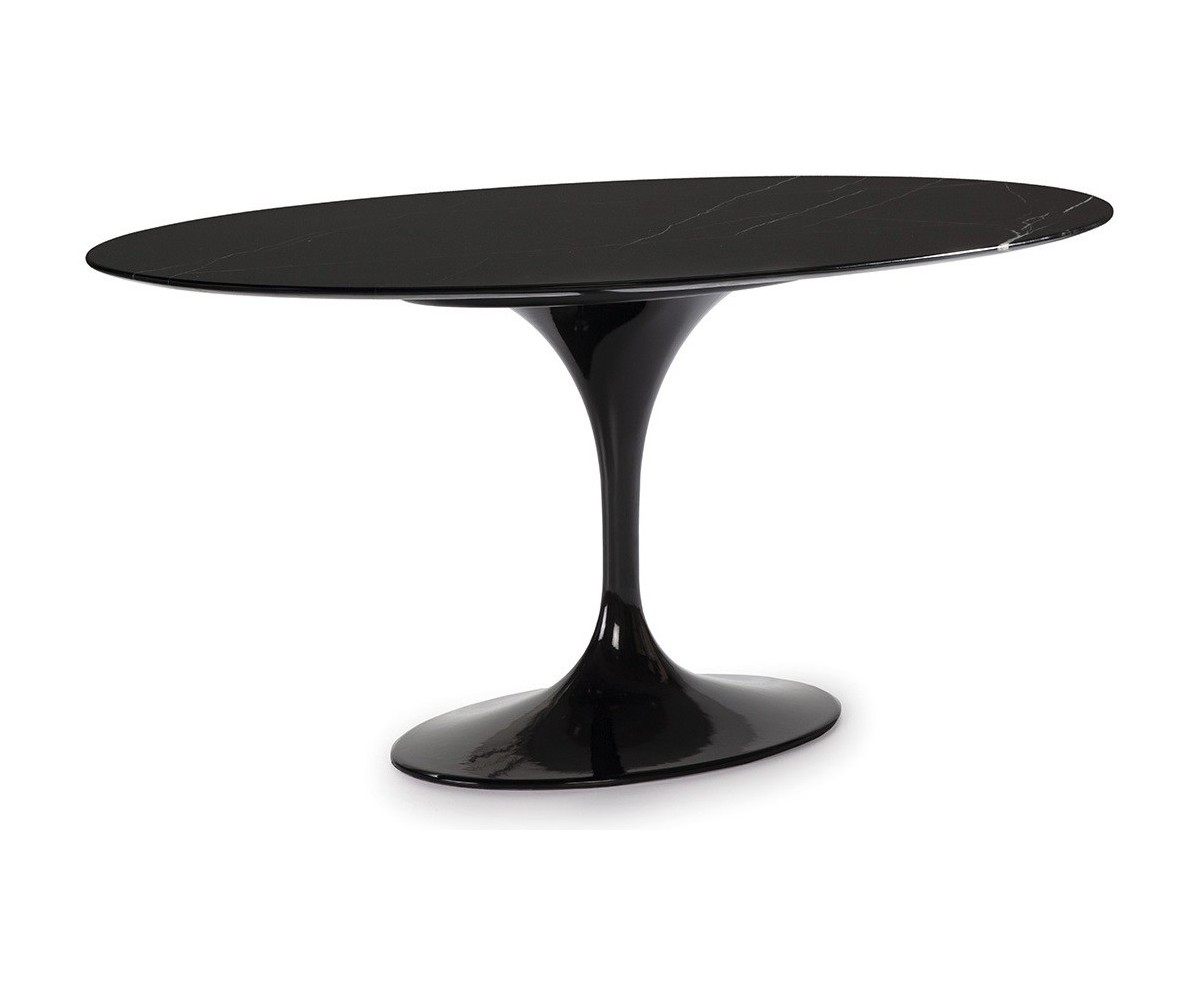 Mesa de comedor ovalada inspirada en un diseño de Eero Saarinen. Base de aluminio lacado en color negro con terminación brillo, sobre en mármol de carrara con canto biselado, al tratarse de piedra natural puede variar el tono y dibujo. Otras medidas consultar. Réplica exacta con materiales originales de máxima calidad.