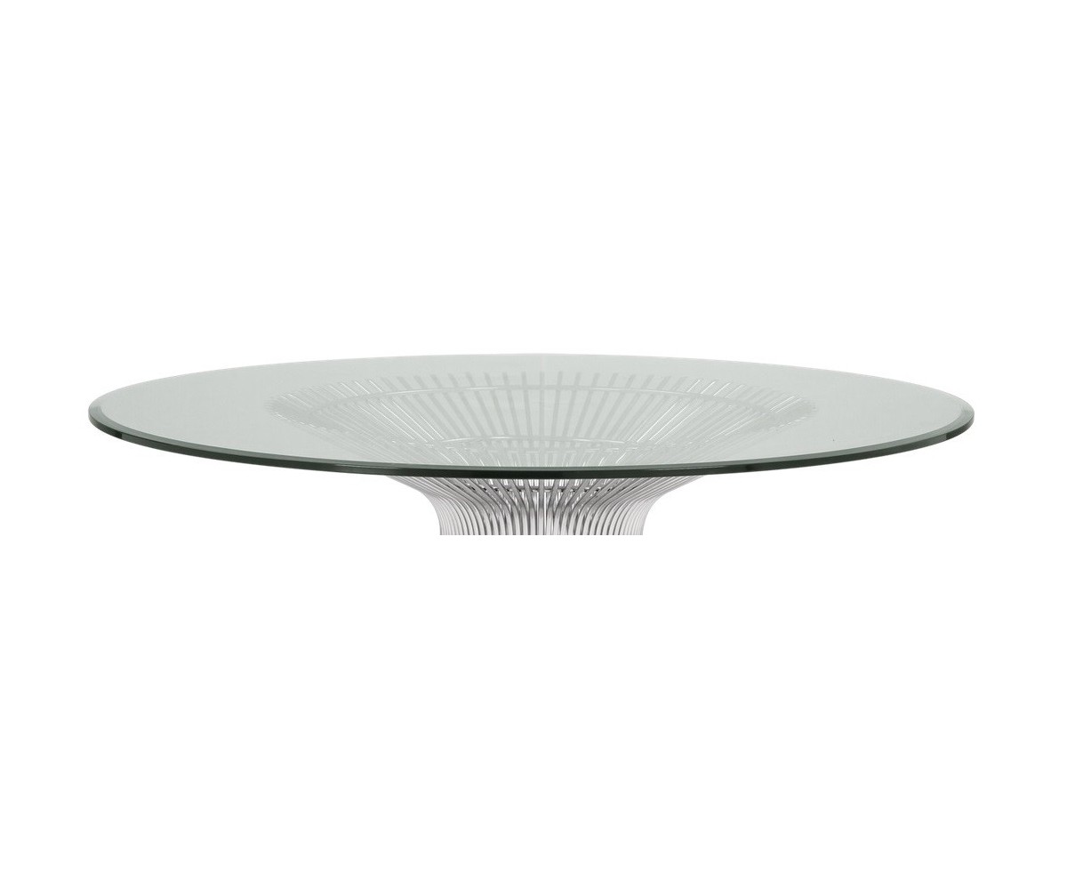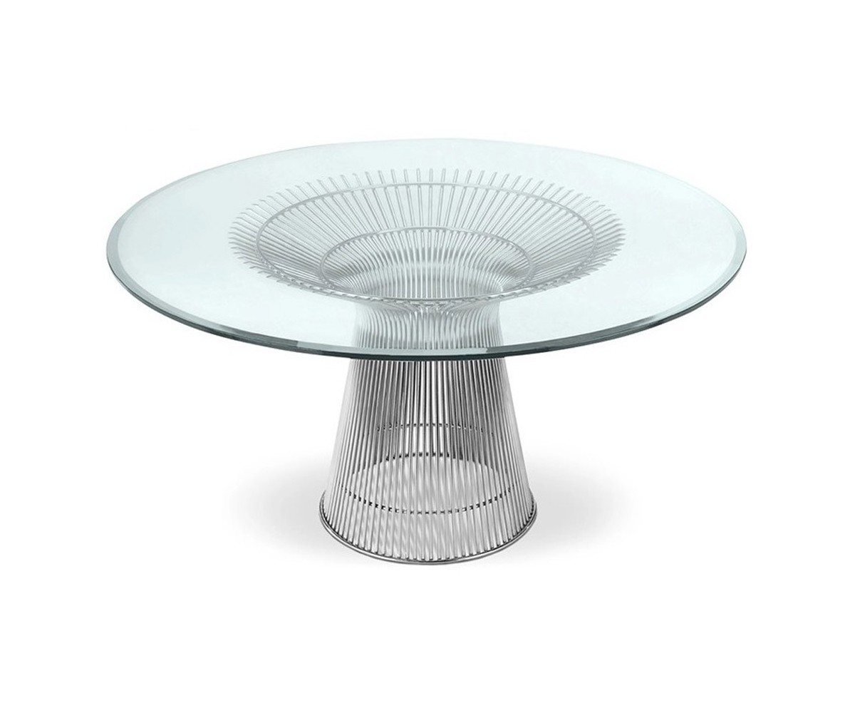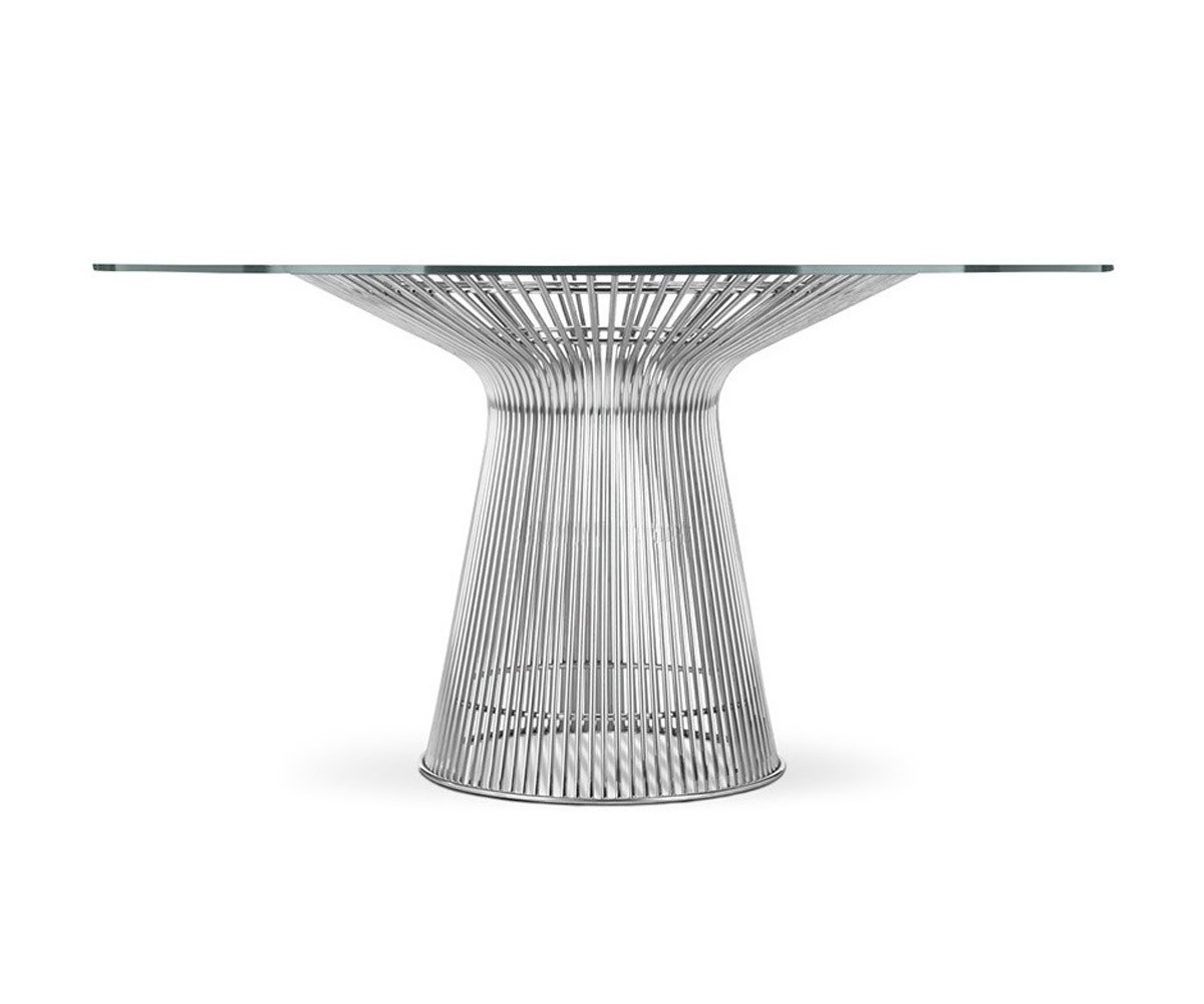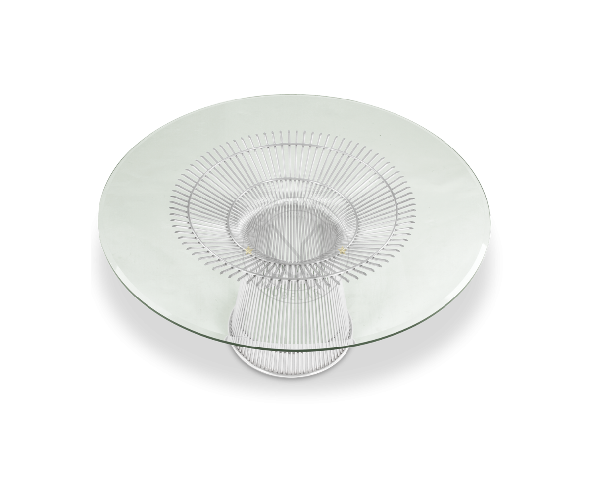Mesa de comedor inspirada en un diseño de Warren Platner. Base fabricada mediante barras tubulares en acero con triple lacado color plata, terminación brillo, tapa circular de cristal templado transparente. Grosor del vidrio 0.12 cm. También disponible en oro, consultar. Réplica exacta con materiales originales de máxima calidad.