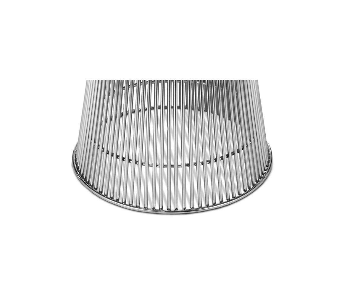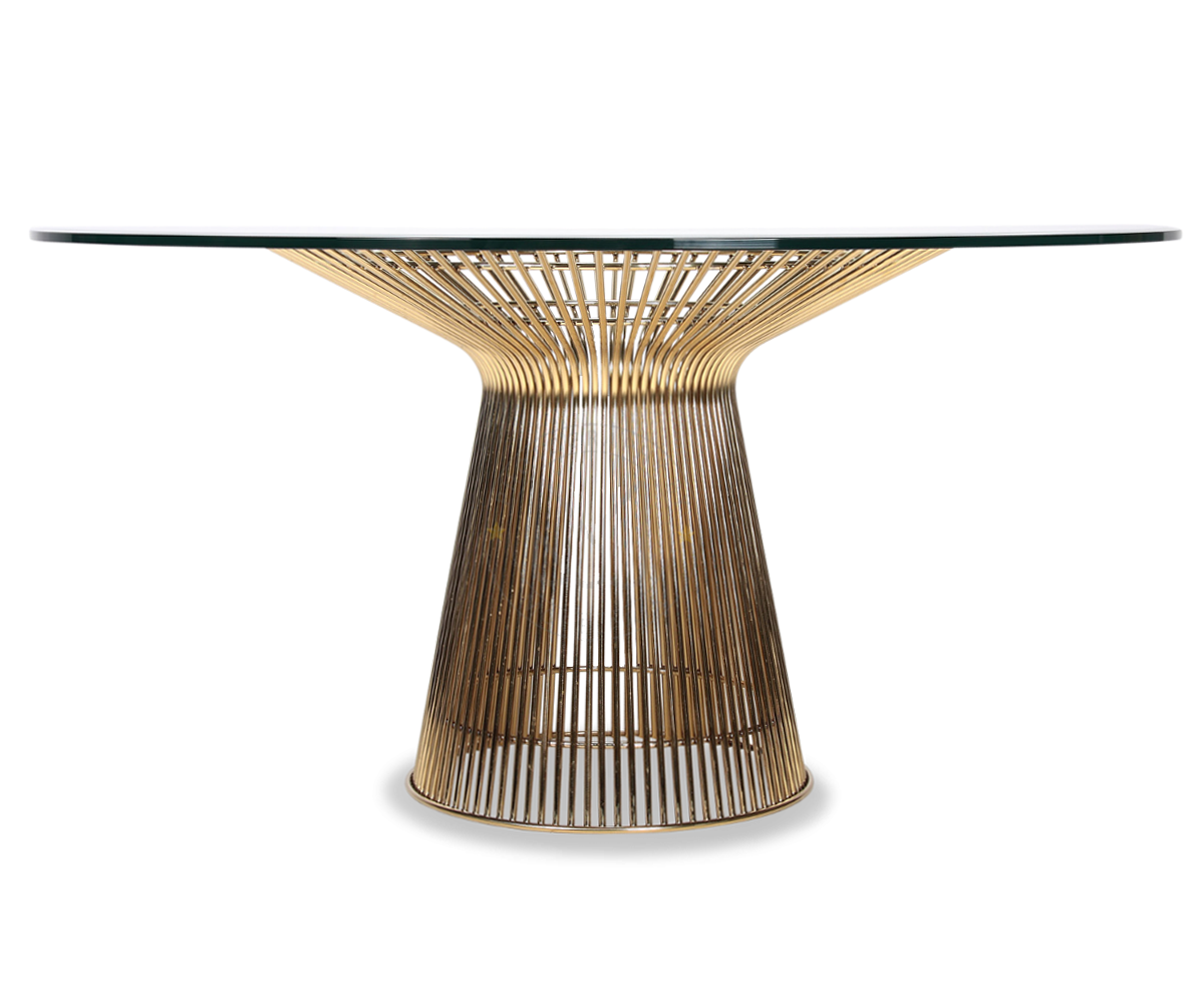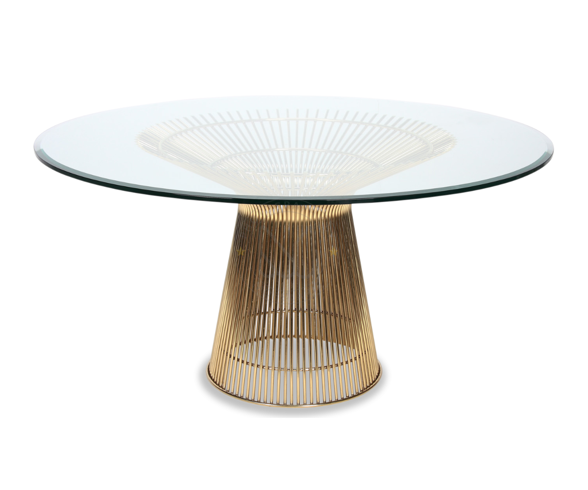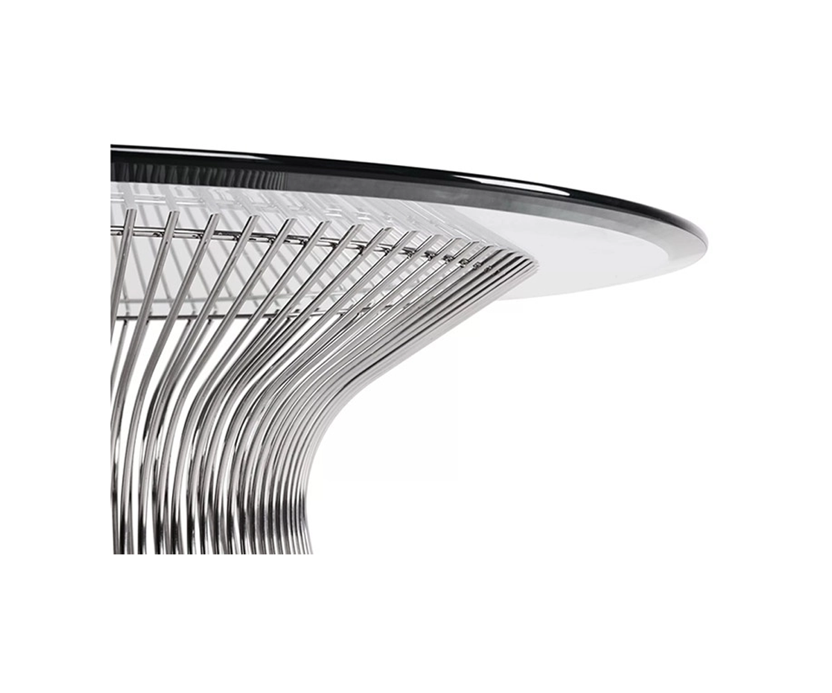 Mesa de comedor inspirada en un diseño de Warren Platner. Base fabricada mediante barras tubulares en acero con triple lacado color plata, terminación brillo, tapa circular de cristal templado transparente. Grosor del vidrio 0.12 cm. También disponible en oro, consultar. Réplica exacta con materiales originales de máxima calidad.