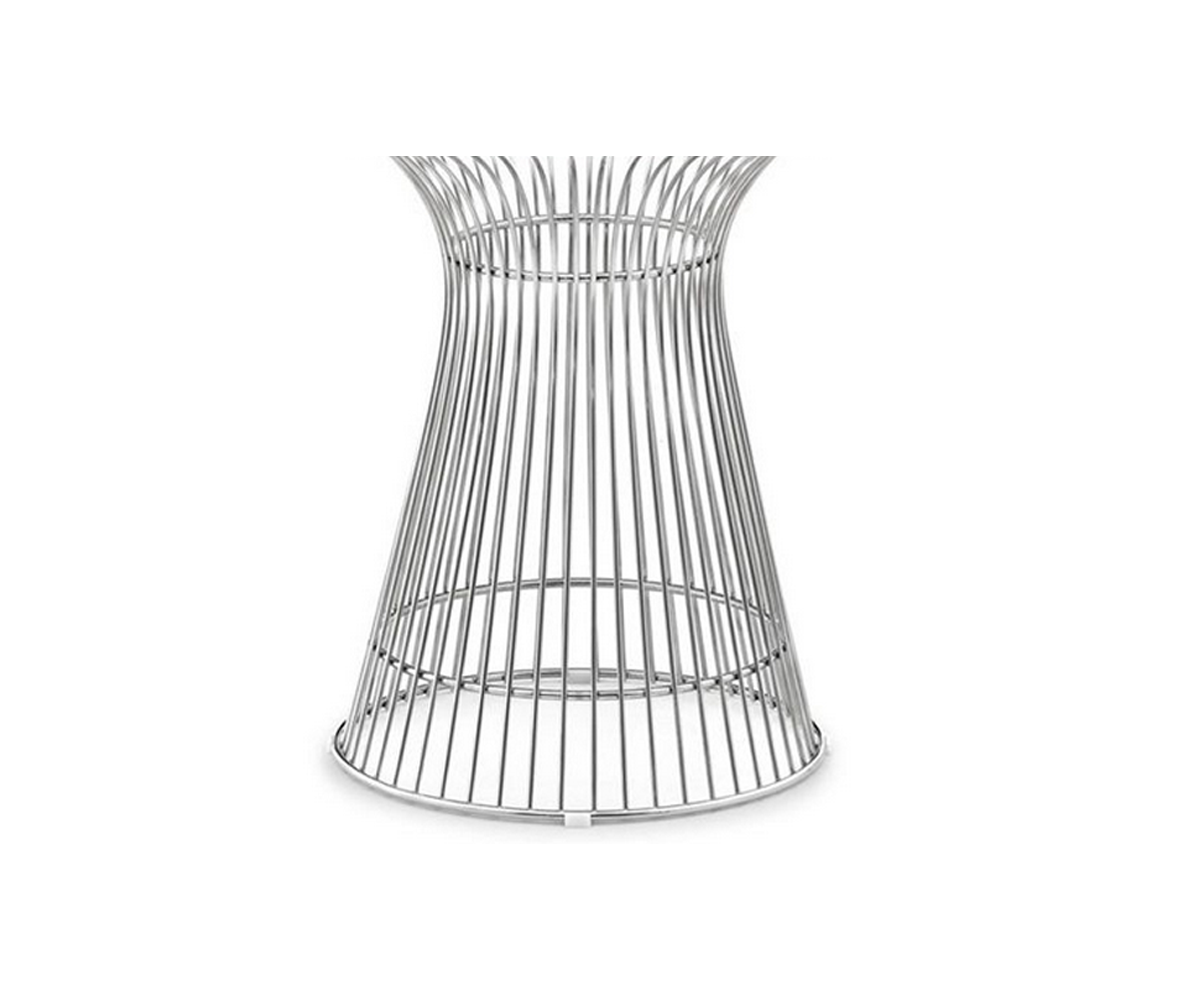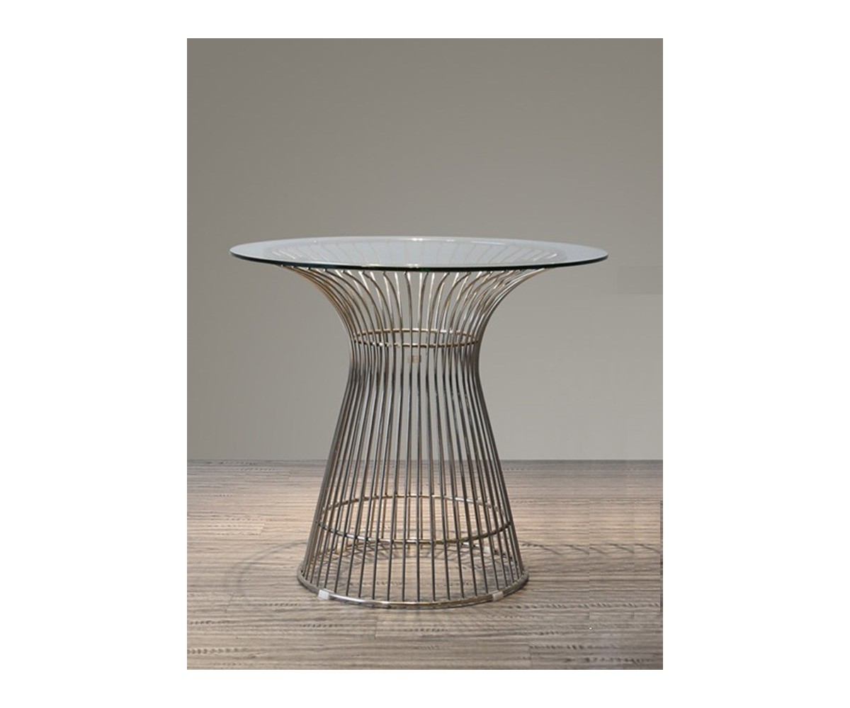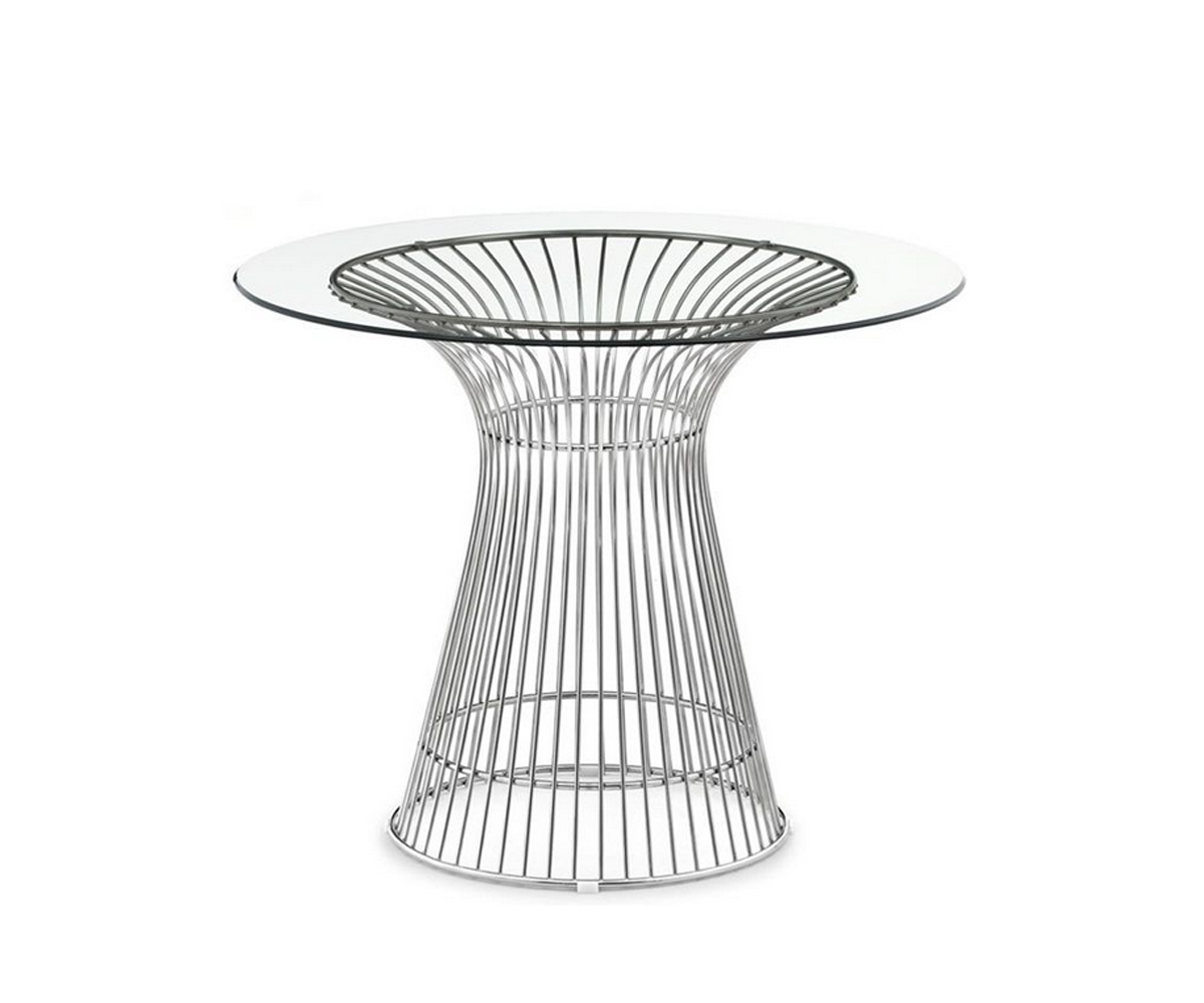 Mesa de comedor inspirada en un diseño de Warren Platner. Base fabricada mediante barras tubulares en acero inox, terminación brillo, tapa circular de cristal templado transparente. Réplica exacta con materiales originales de máxima calidad.