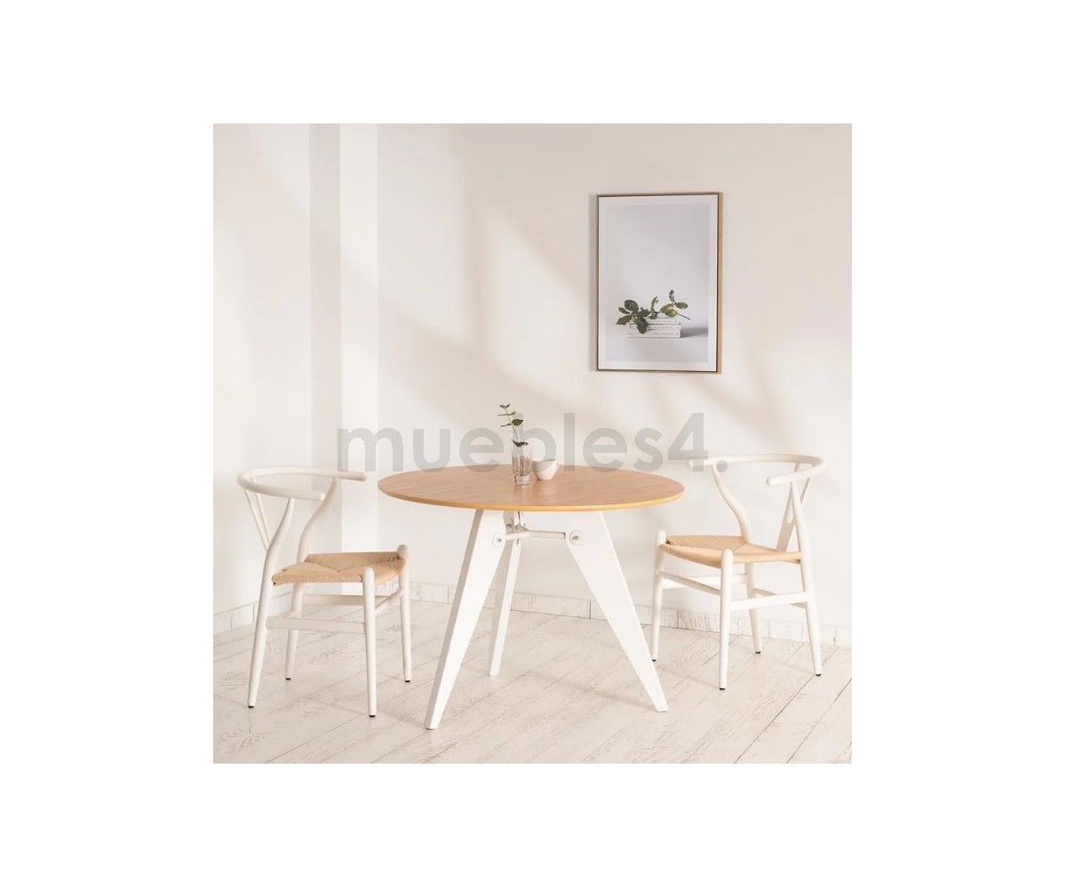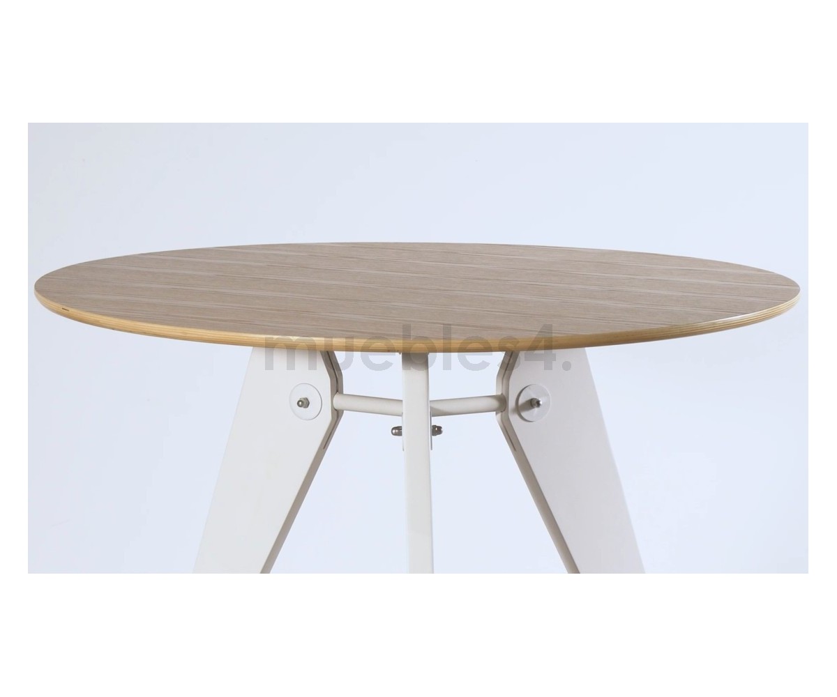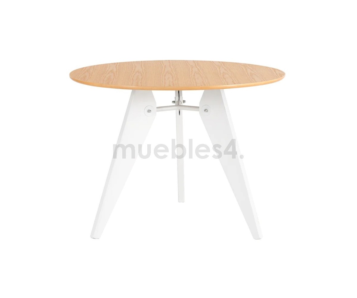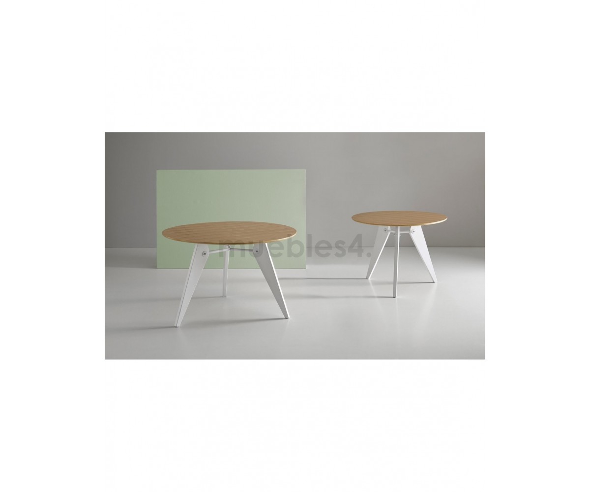 Mesa circular inspirada en un diseño de Jean Prouvé para Vitra. Las mesas modernas no deben ser necesariamente de acero y cristal y supone un cambio en el lenguaje formal de Prouvé, marcadamente arquitectónico, al emplear un material natural.