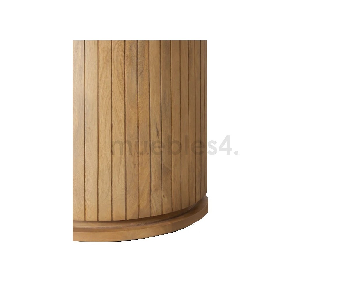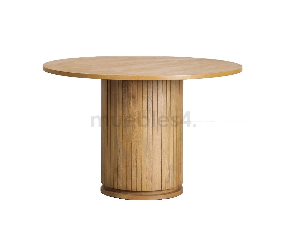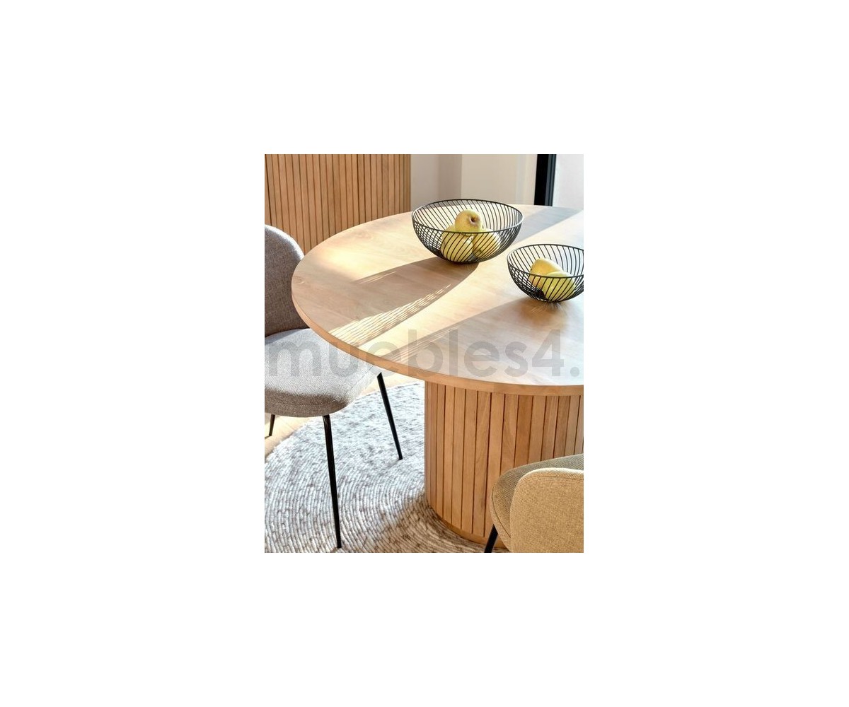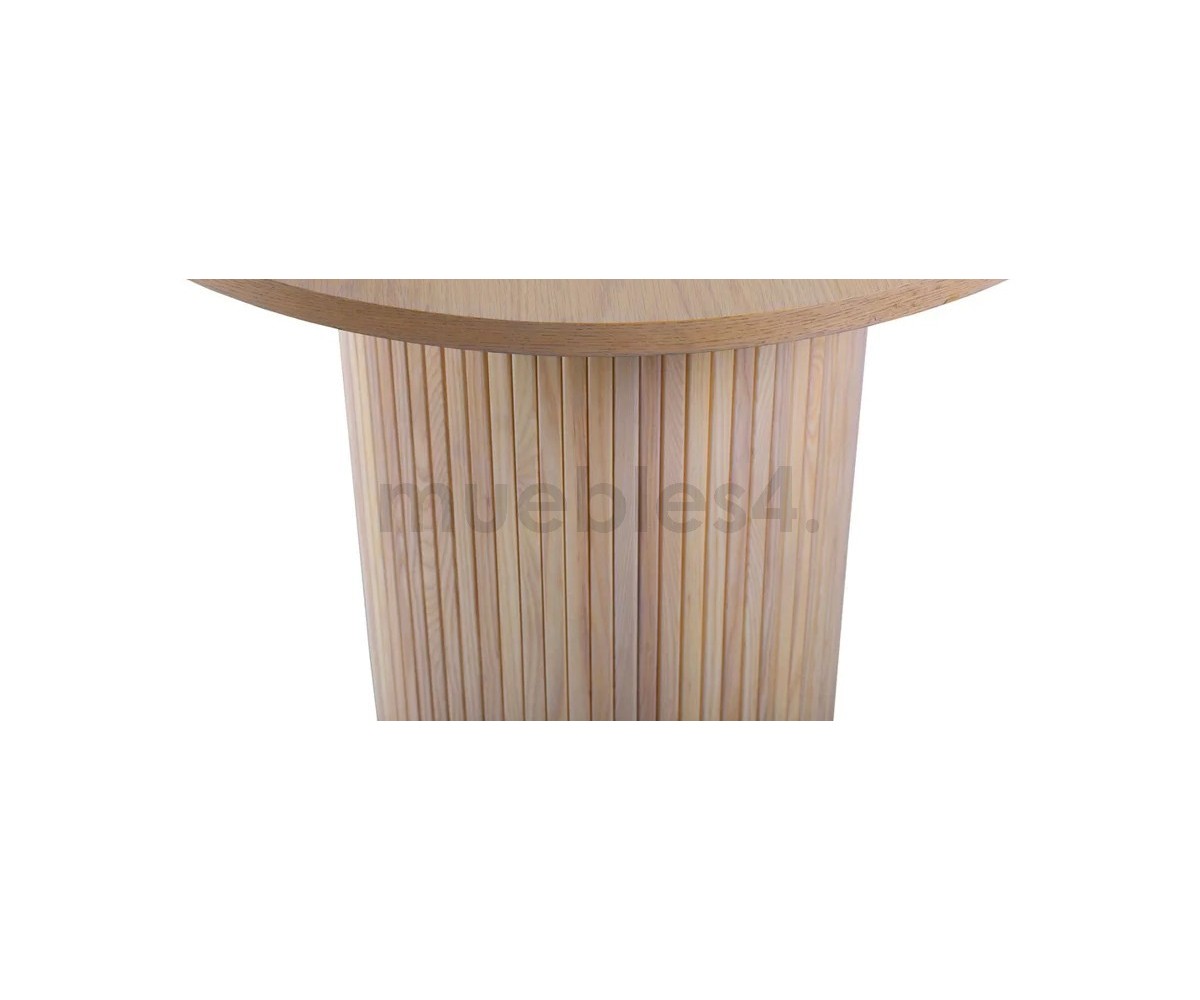 Mesa redonda inspirada en un diseño de Nordal. Formadas por un tablero circular que descansa sobre una base de madera con ranuras verticales. Tenga en cuenta que el producto está parcialmente hecho a mano y a partir de materiales naturales, por lo que pueden producirse irregularidades y variaciones en los colores, acabados y tamaños, lo que forma parte del aspecto único del producto.