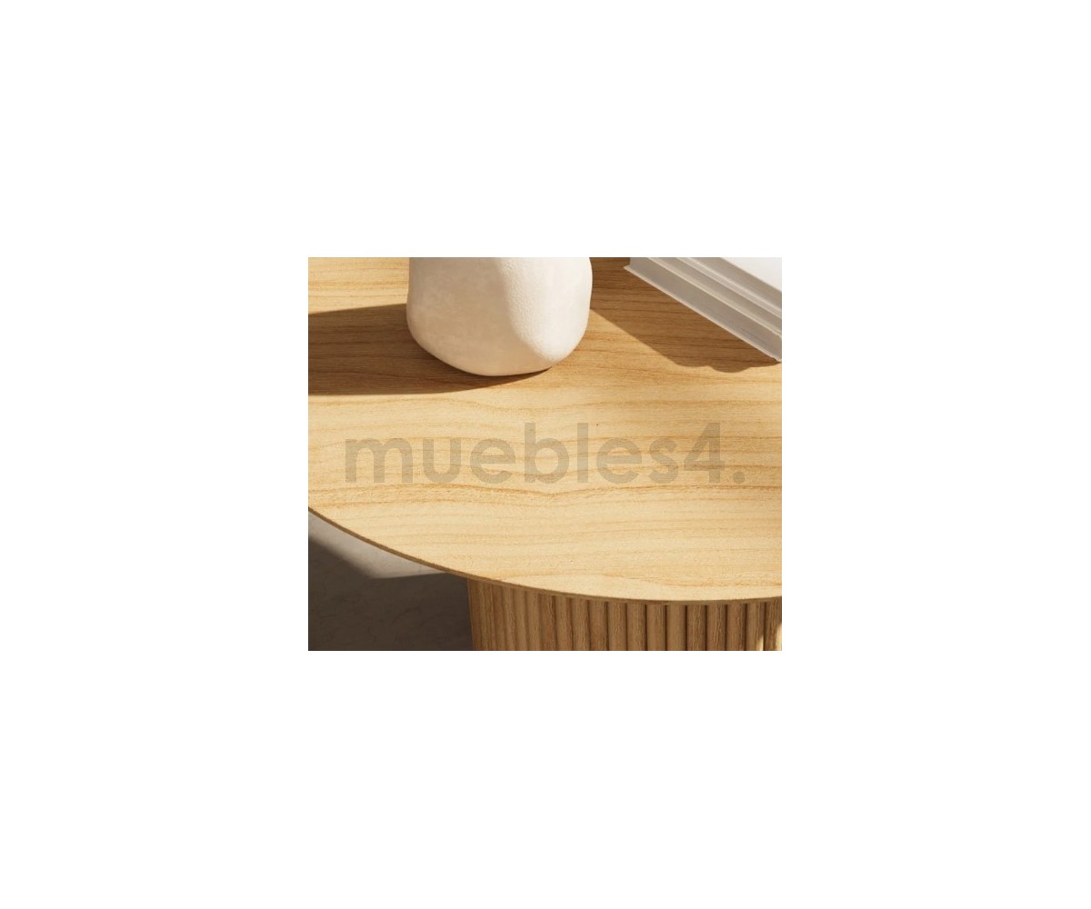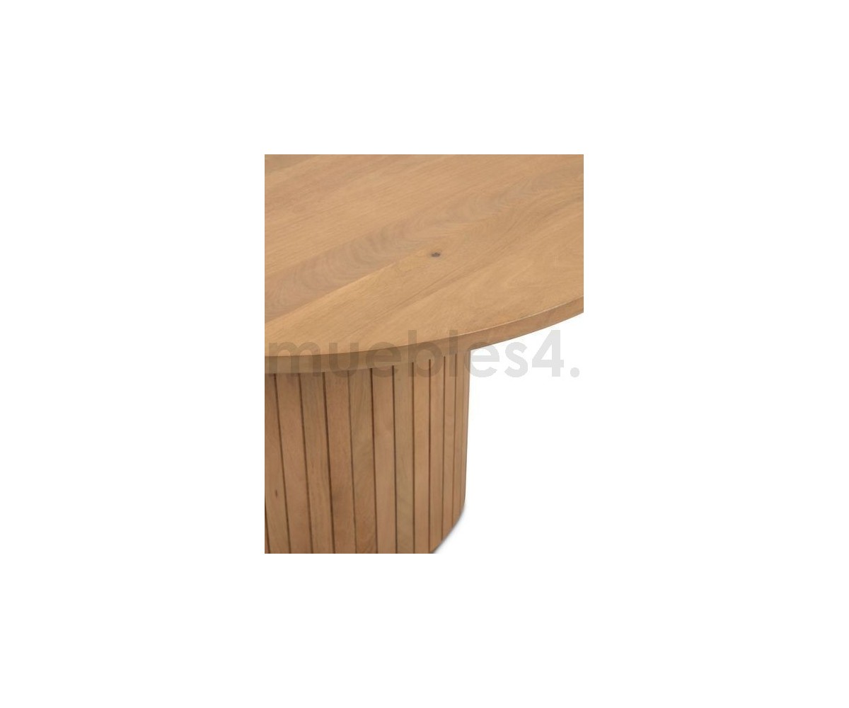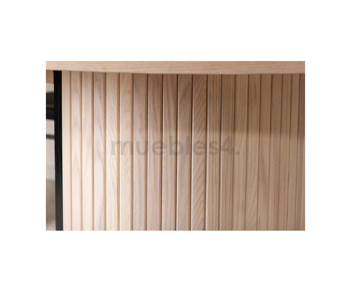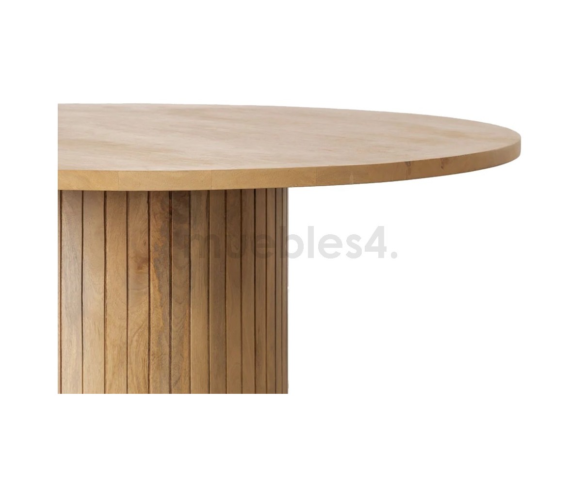 Mesa redonda inspirada en un diseño de Nordal. Formadas por un tablero circular que descansa sobre una base de madera con ranuras verticales. Tenga en cuenta que el producto está parcialmente hecho a mano y a partir de materiales naturales, por lo que pueden producirse irregularidades y variaciones en los colores, acabados y tamaños, lo que forma parte del aspecto único del producto.