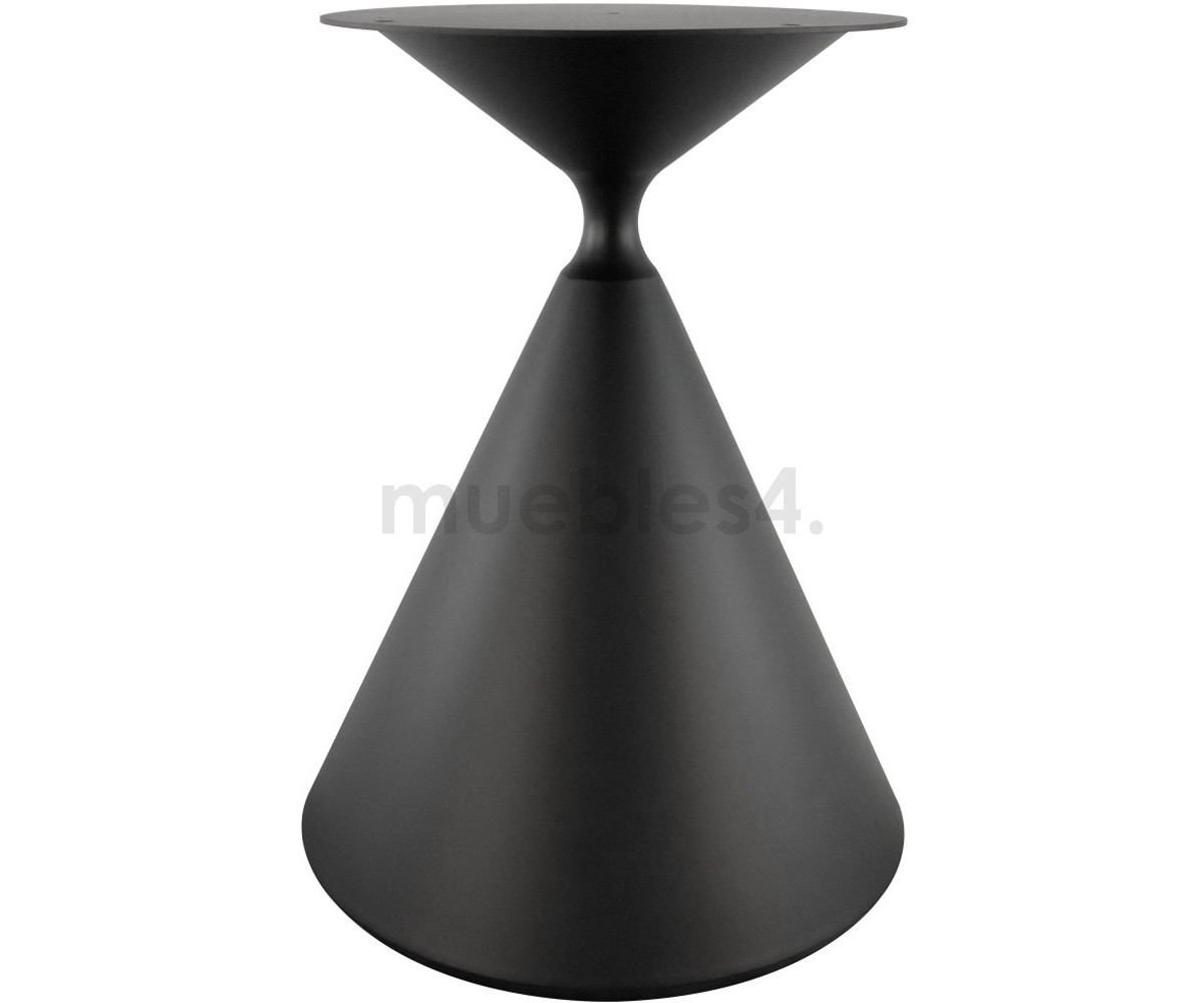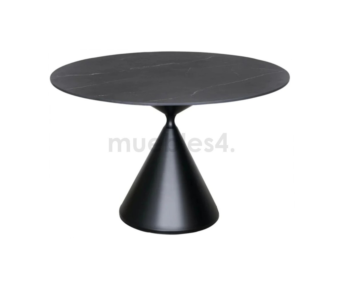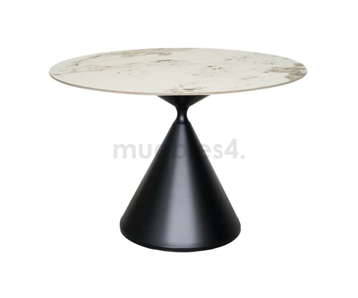 Mesa circular inspirada en Marc Krusin. Dos volúmenes logran un equilibrio perfecto de uno sobre el otro. Dos conos de diferentes formas se encuentran en sus vértices opuestos, desafiando la gravedad en un equilibrio aparentemente inestable.