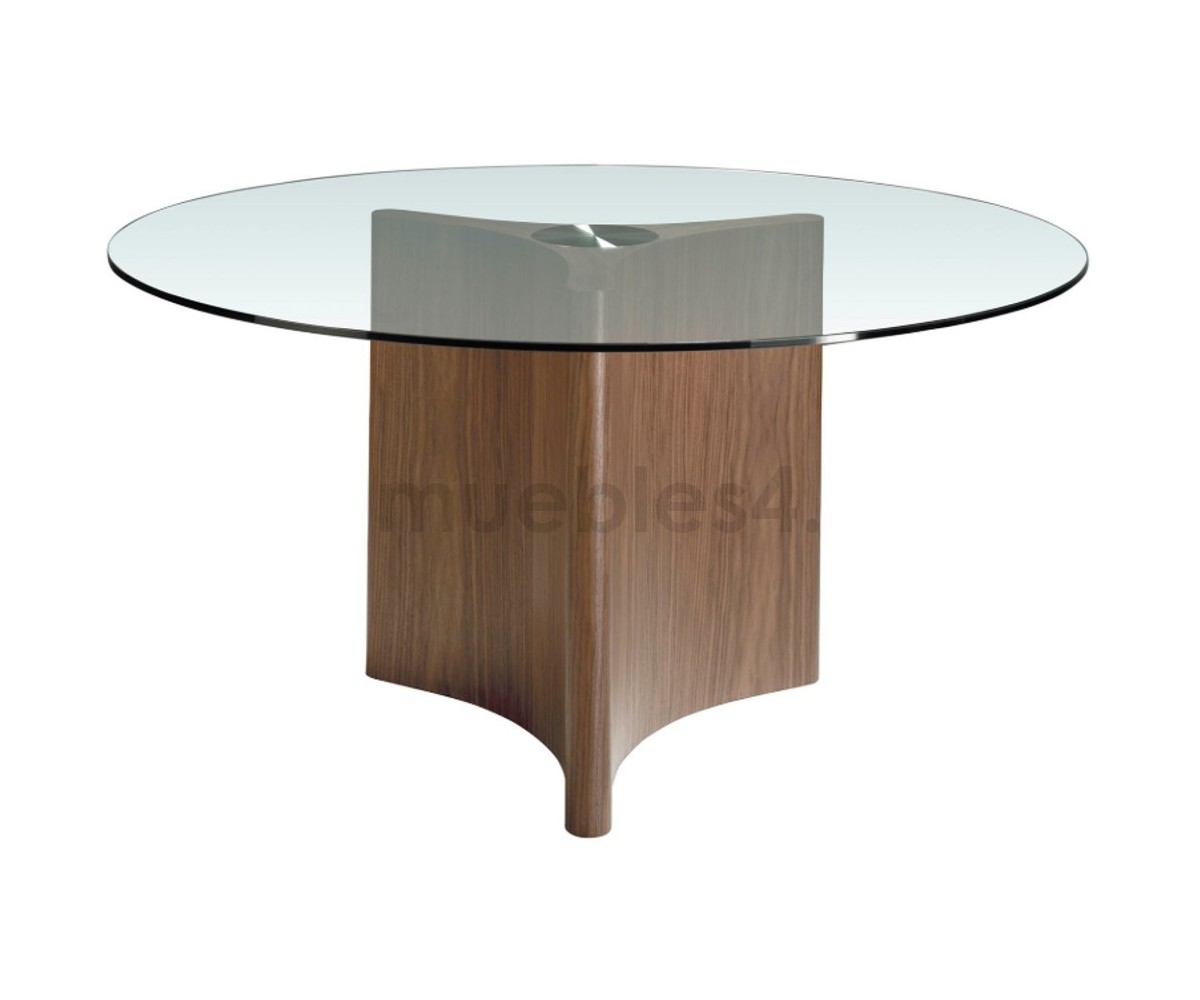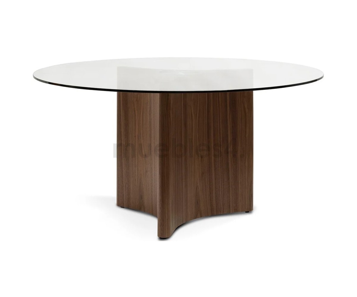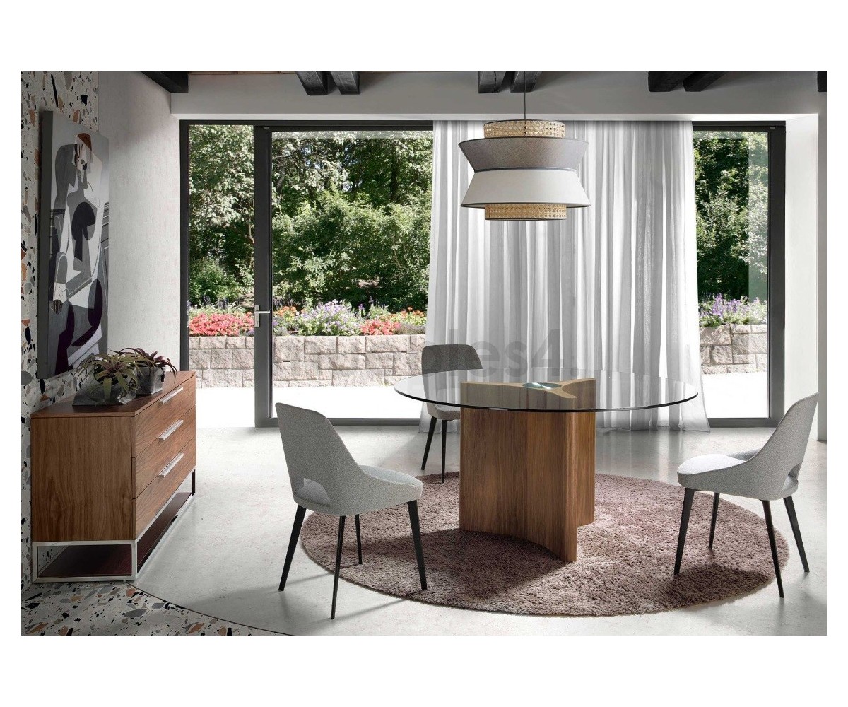 Mesa de comedor circular, inspirada en un diseño de Diseñado Oscar Buratti y Gabriele Buratti. Ofrece un ambiente acogedor y agradable con su diseño único. Rematada con una superficie de vidrio templado transparente, muestra una sensibilidad moderna que permite que su base brille. La base cuenta con una forma distintiva que capta la atención y agrega un toque artístico al diseño general. Con su combinación perfecta de vidrio y madera, la mesa de comedor crea una mezcla armoniosa de materiales, lo que la convierte en una pieza central cautivadora que fomenta reuniones agradables y fomenta un ambiente acogedor en cualquier espacio de comedor.