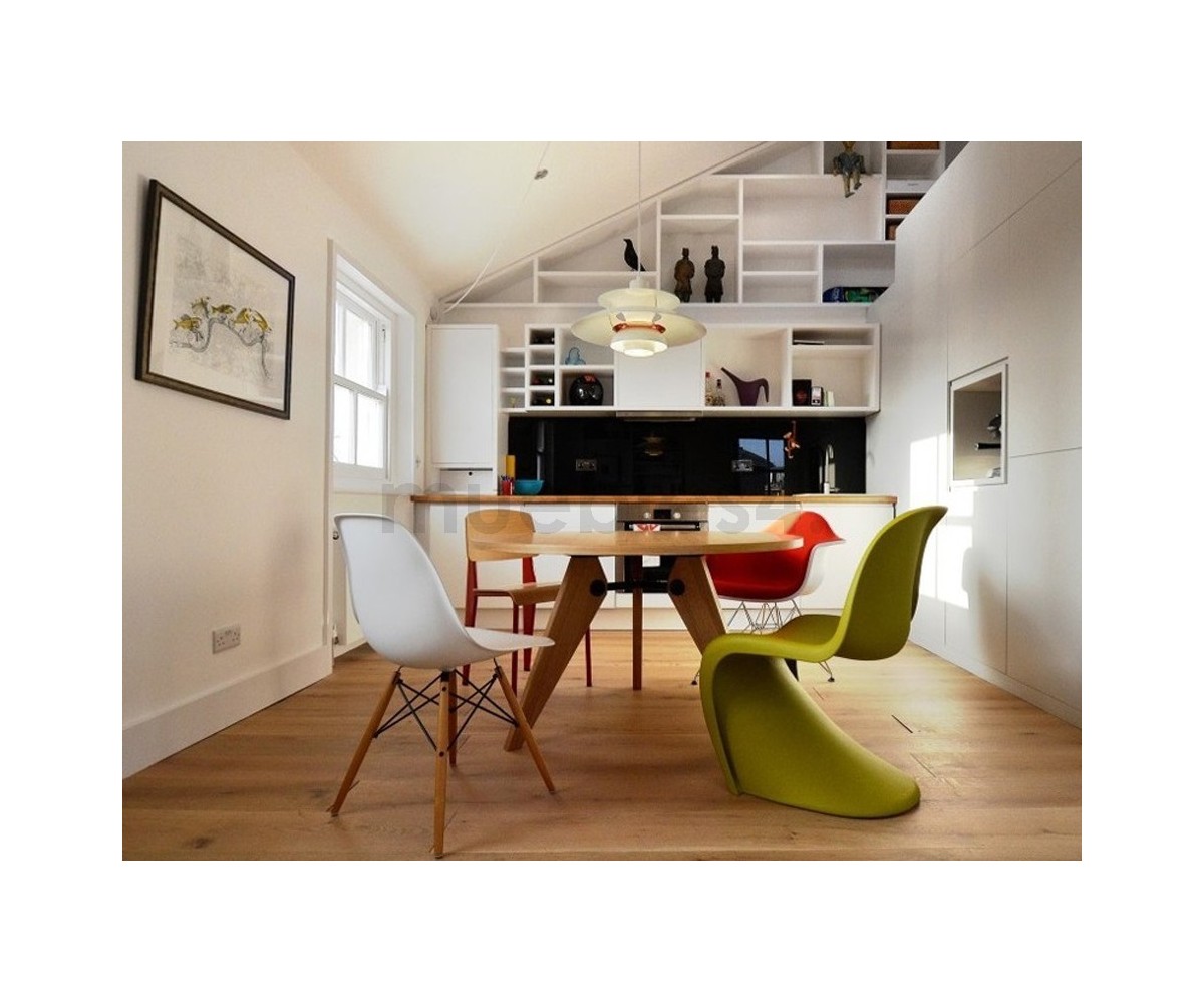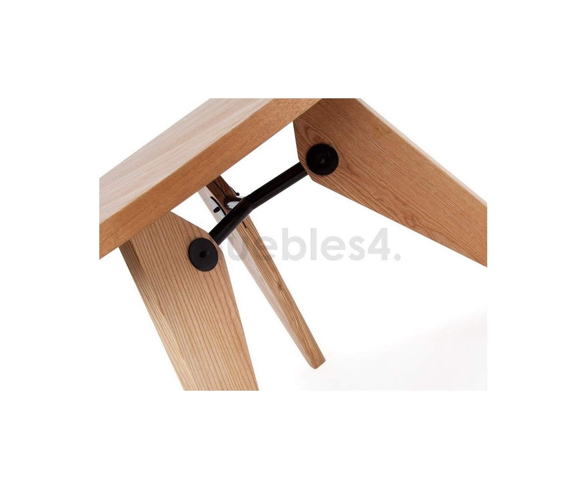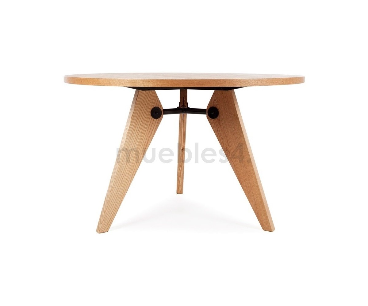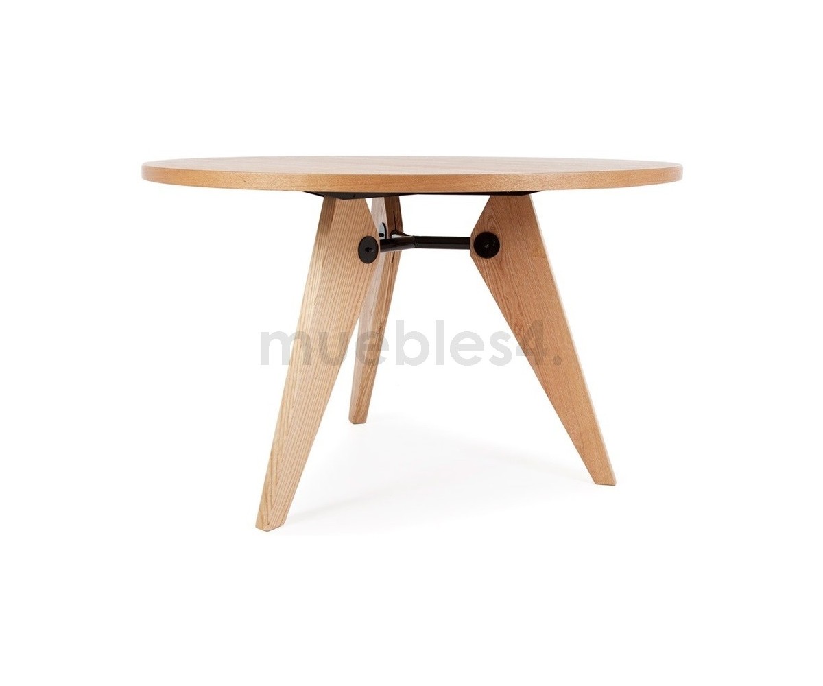 Mesa de comedor circular inspirada en un diseño de Jean Prouvé. Fabricada en madera de roble macizo, estructura de acero lacado en color negro para unir las 3 patas que le aporta gran estabilidad y resistencia. Réplica exacta con materiales originales de máxima calidad.