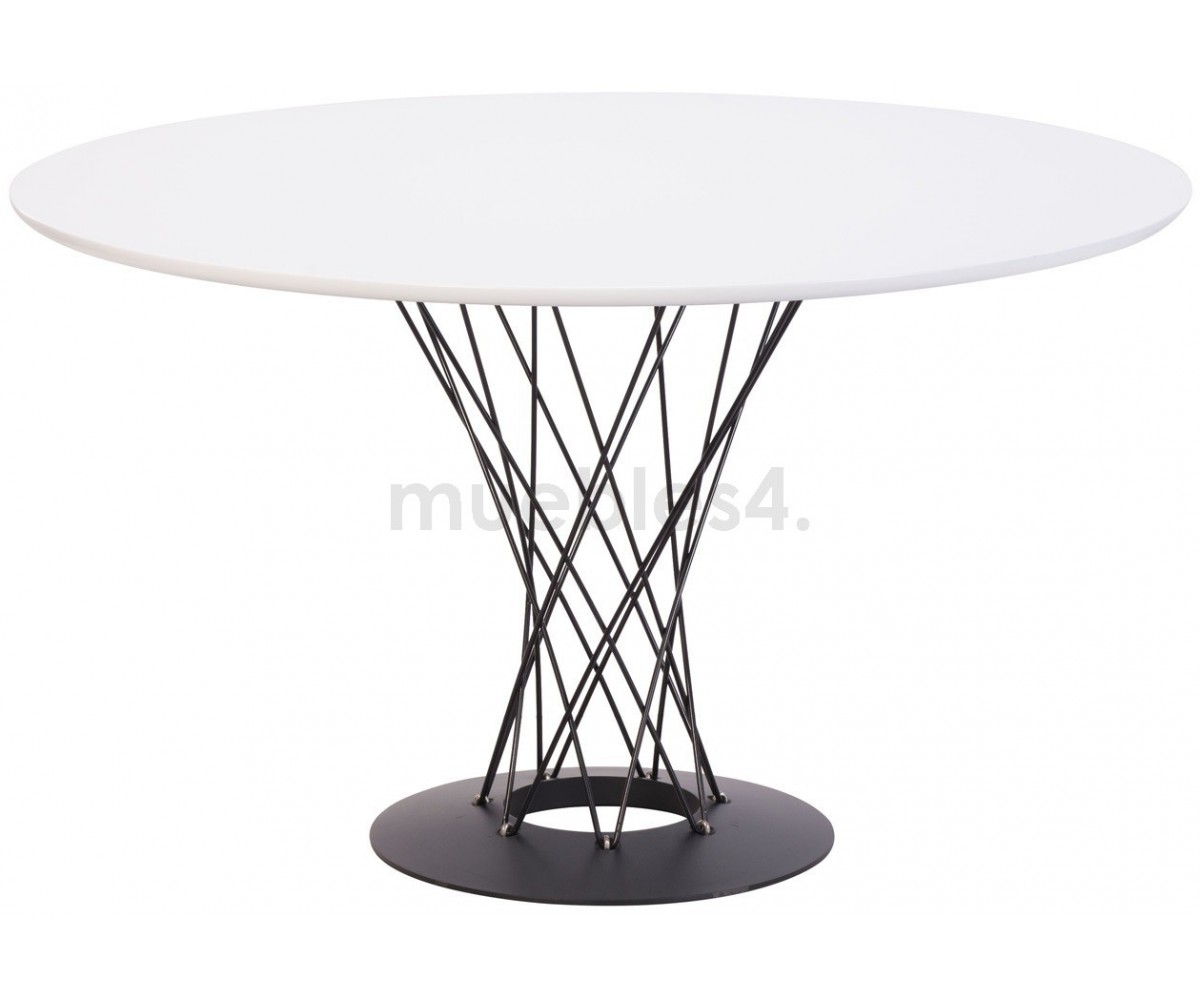 Mesa circular de comedor inspirada en un diseño Isamu Noguchi. Estructura mediante barillas en acero cromado termianción brillo lacadas en color negro, base circular en acero lacado color negro, sobre circular en madera de roble lacado color blanco con canto biselado. Réplica exacta con materiales originales de máxima calidad.