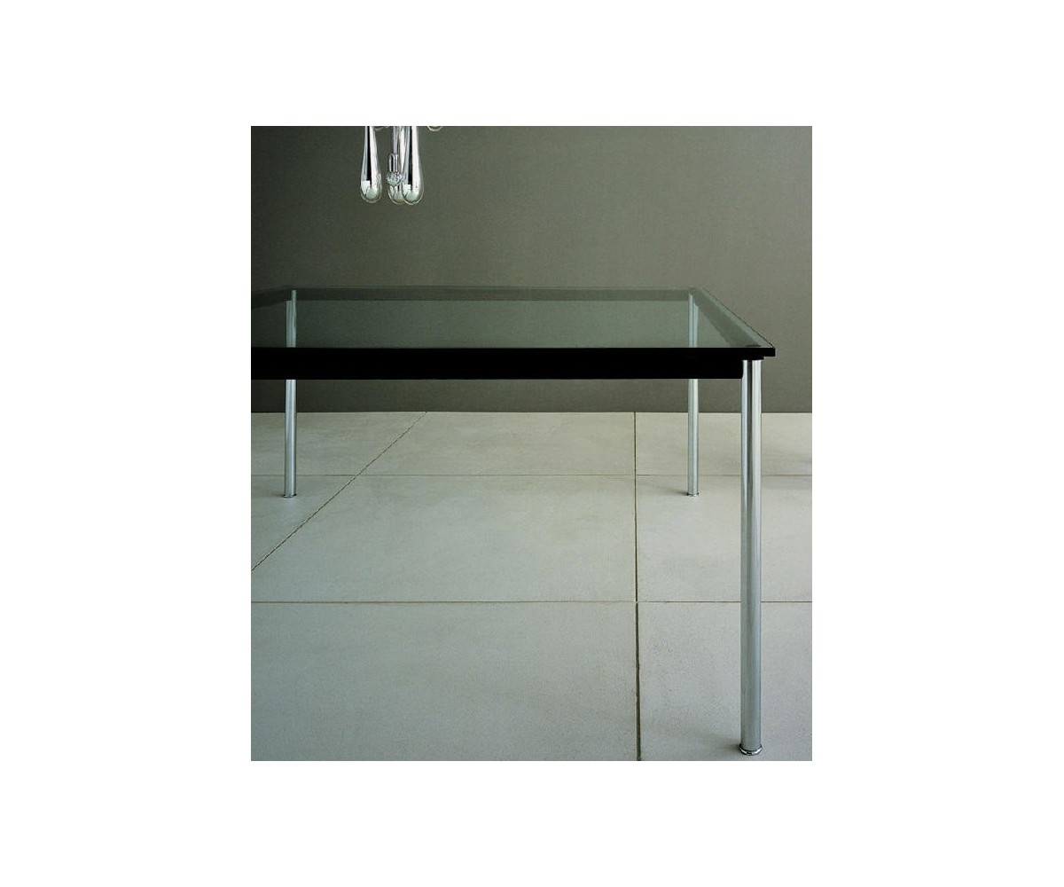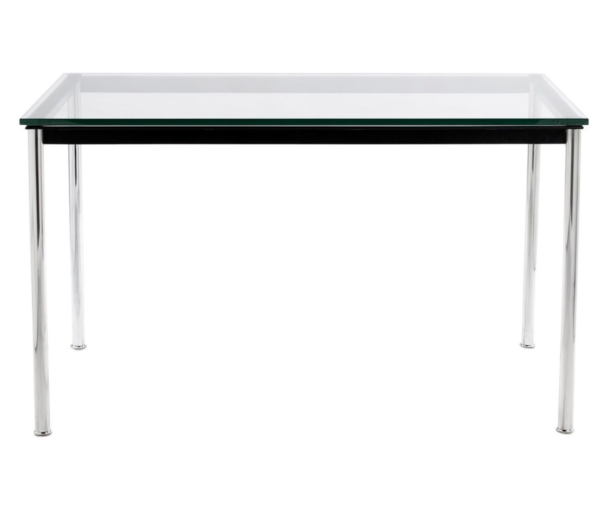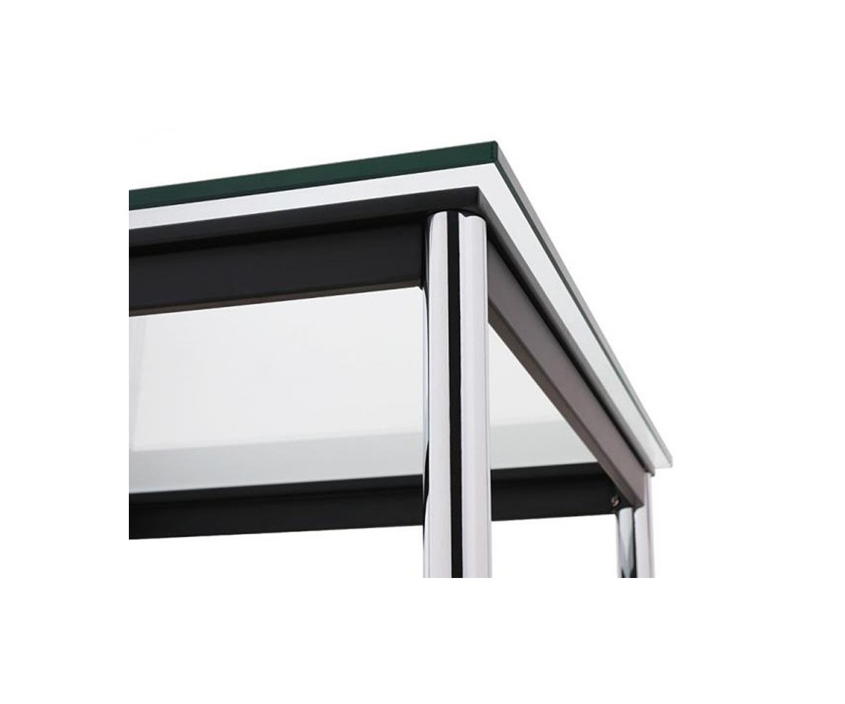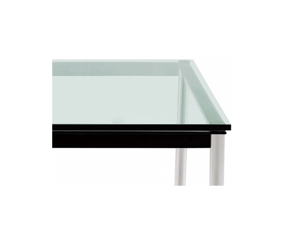 Mesa oficina inspirada en un diseño de Le Corbusier. Patas fabricada en acero pulido tubular, sobre un marco de acero con triple lacado color negro. Tapa en cristal templado segurizado transparente de 1.5cm de grosor. Disponible en mesa de centro y auxiliar. Réplica exacta con materiales originales de máxima calidad.