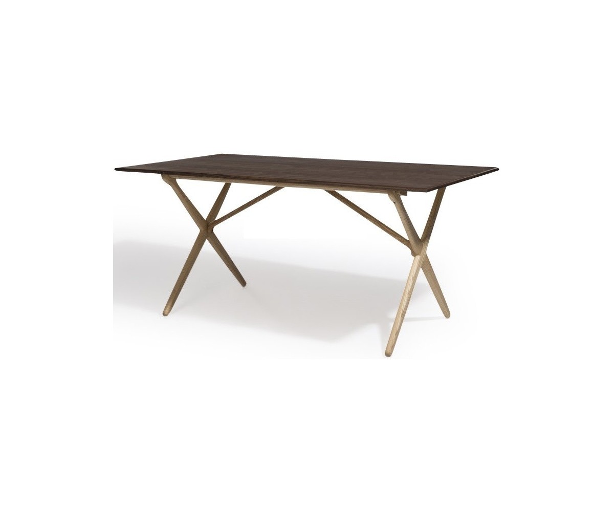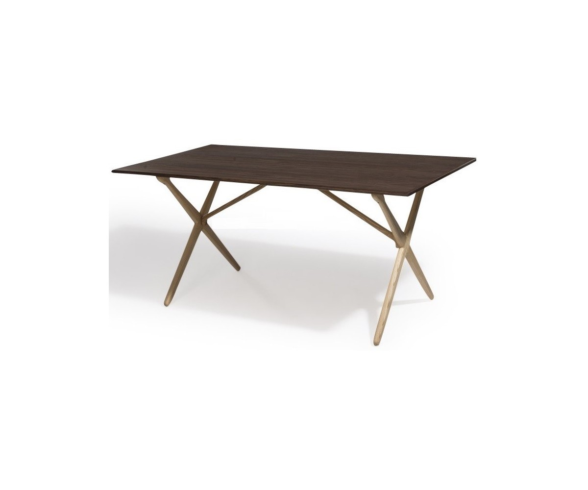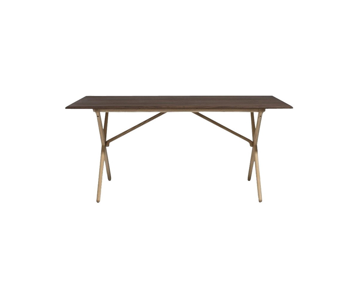 Mesa de oficina rectangular estilo danesa inspirada en un diseño de Hans J. Wegner. Estructura cruzada en roble americano macizo con tapa en nogal americano macizo. Réplica exacta con materiales originales de máxima calidad.