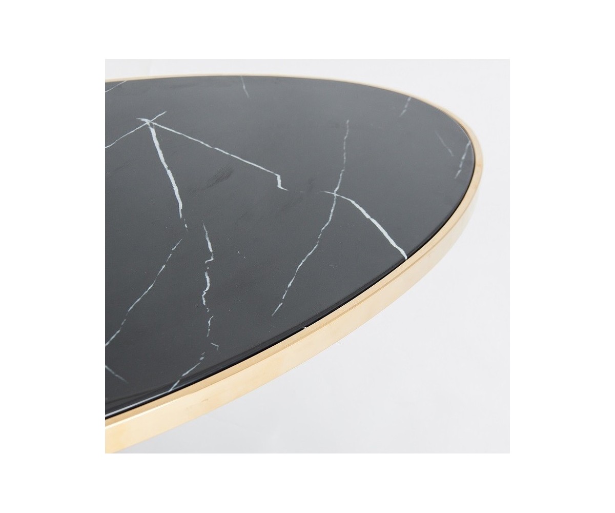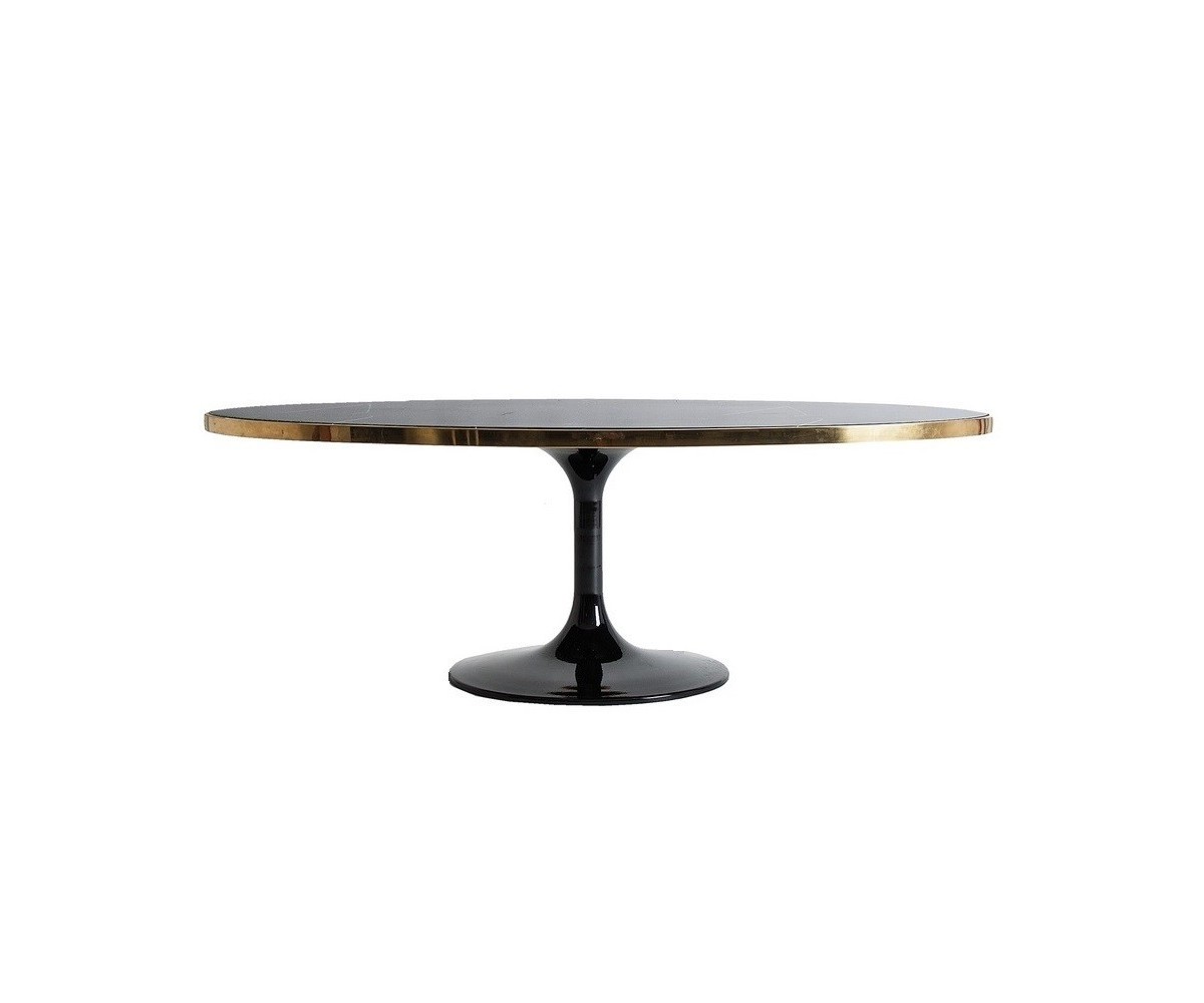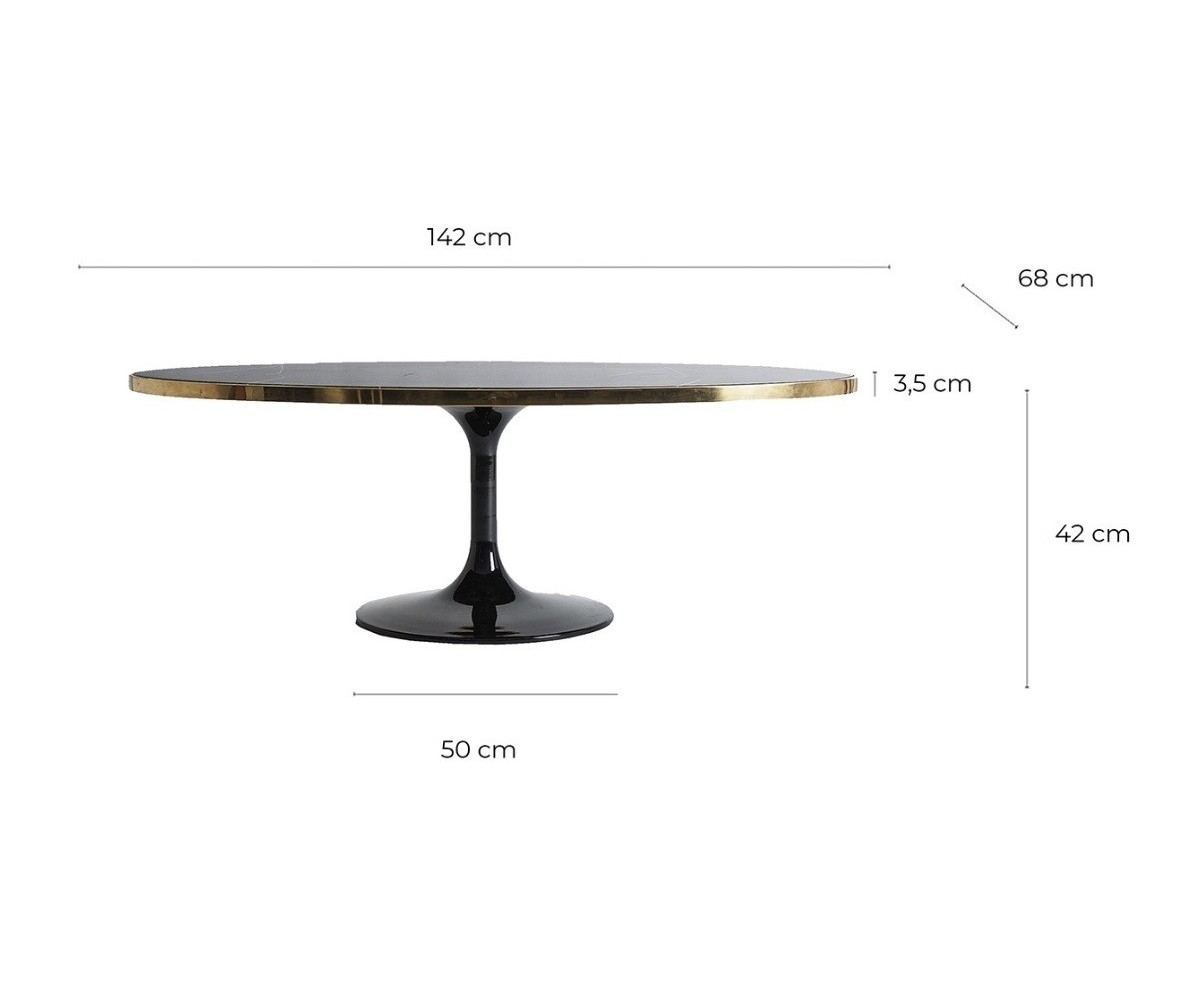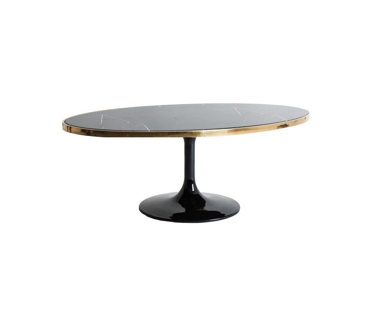 Mesa de centro ovalada inspirada en un diseño de Rodolfo Dordoni. Base de cero triple lacado en color negro con terminación brillo, tapa en mármol sintético negro, canto en acero dorado. Tambien disponible en mesa comedor. Réplica exacta con materiales originales de máxima calidad.
