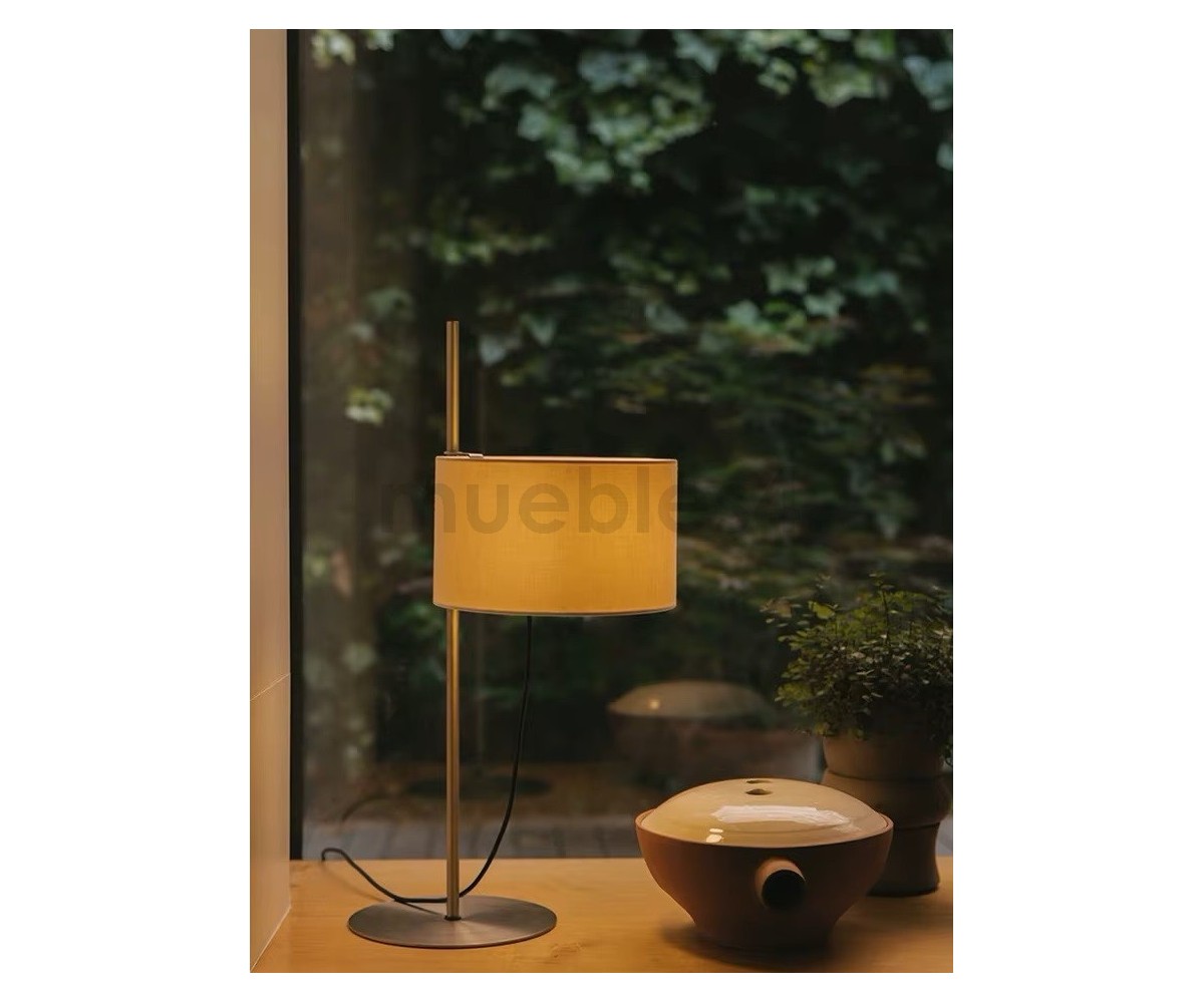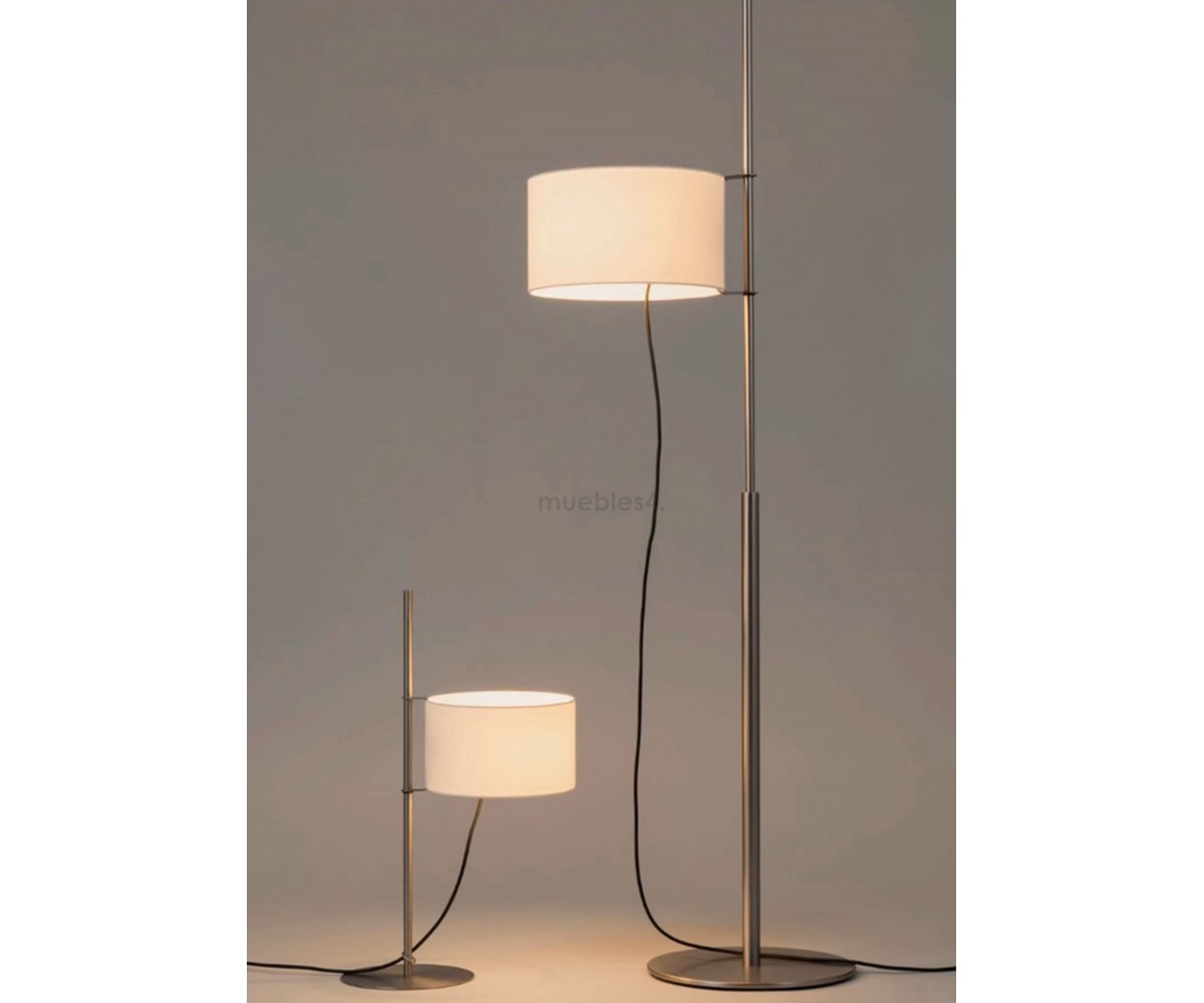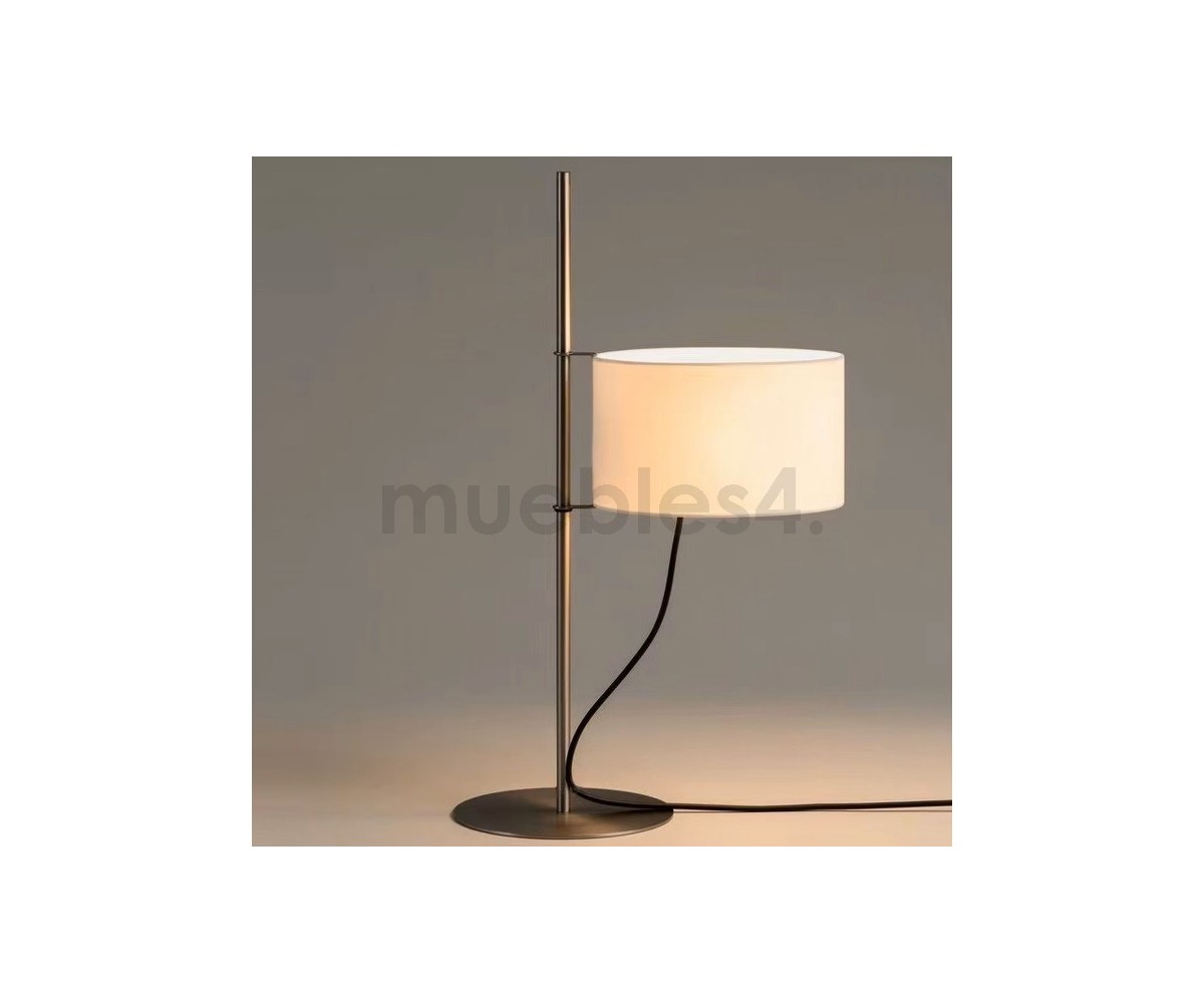 Lámpara de sobremesa inspirada en un diseño de Miguel Milá. Proyecto con la idea de una pantalla que se izase como una bandera por un mástil. Para reducir las secciones cambió la madera por el metal, y los pies en aspa por una base circular, menos intrusiva en la siempre repleta superficie de toda mesa de trabajo, pero mantuvo el ingenioso sistema de fijar la pantalla a la altura deseada. Apagada o encendida, la TMD consigue aportar calidez al espacio.