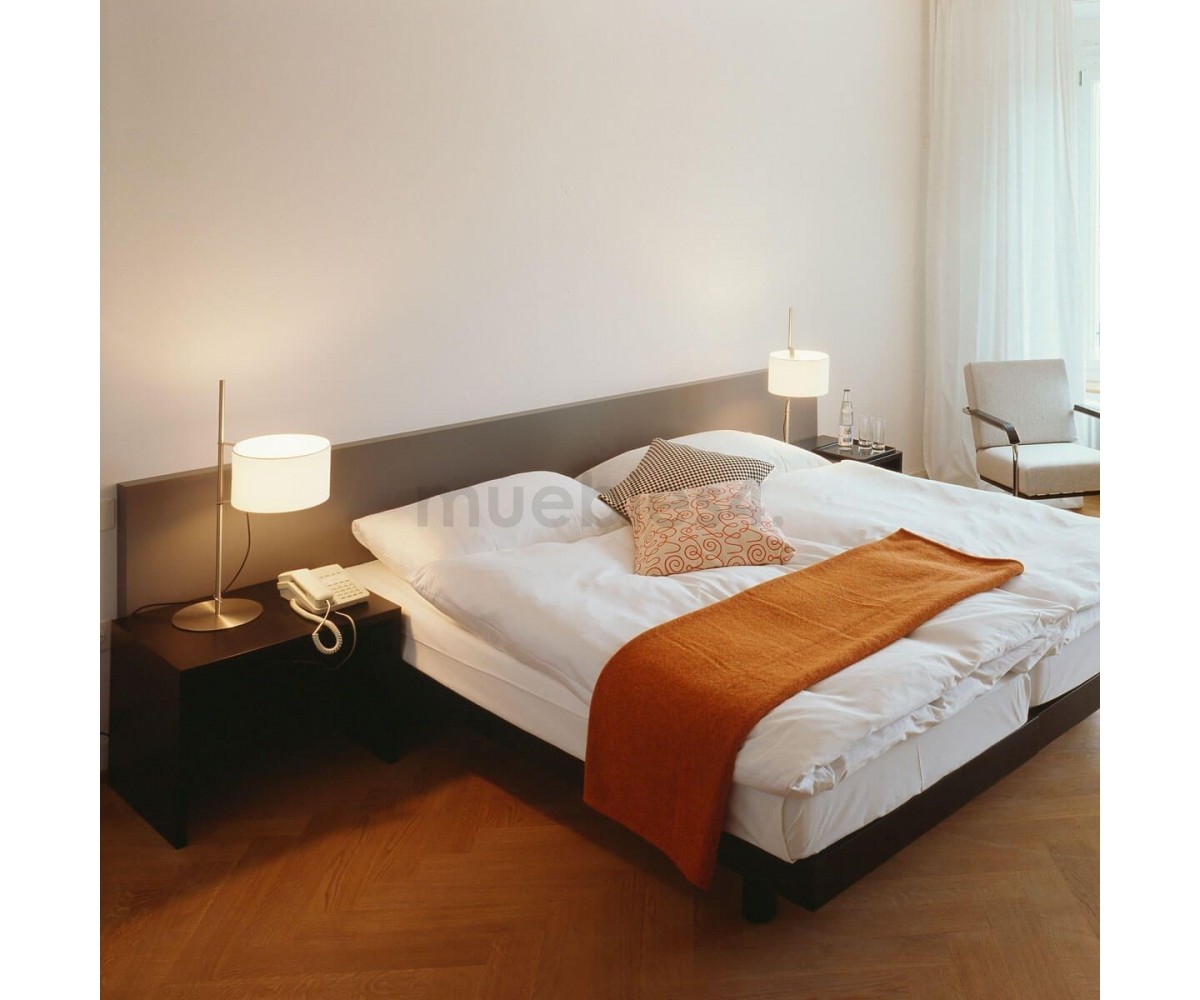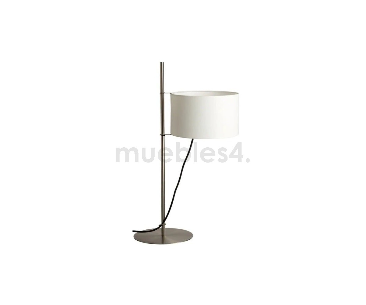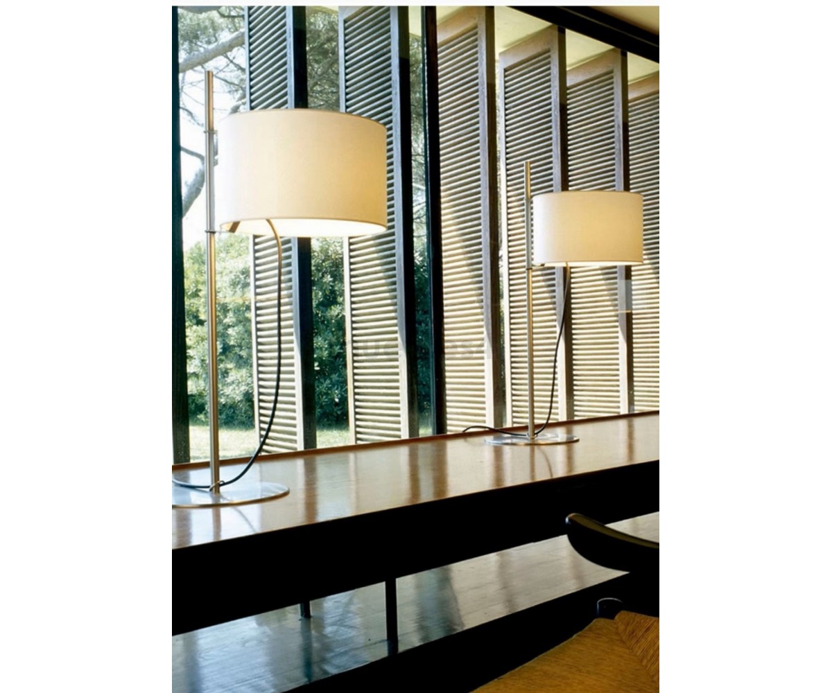 Lámpara de sobremesa inspirada en un diseño de Miguel Milá. Proyecto con la idea de una pantalla que se izase como una bandera por un mástil. Para reducir las secciones cambió la madera por el metal, y los pies en aspa por una base circular, menos intrusiva en la siempre repleta superficie de toda mesa de trabajo, pero mantuvo el ingenioso sistema de fijar la pantalla a la altura deseada. Apagada o encendida, la TMD consigue aportar calidez al espacio.