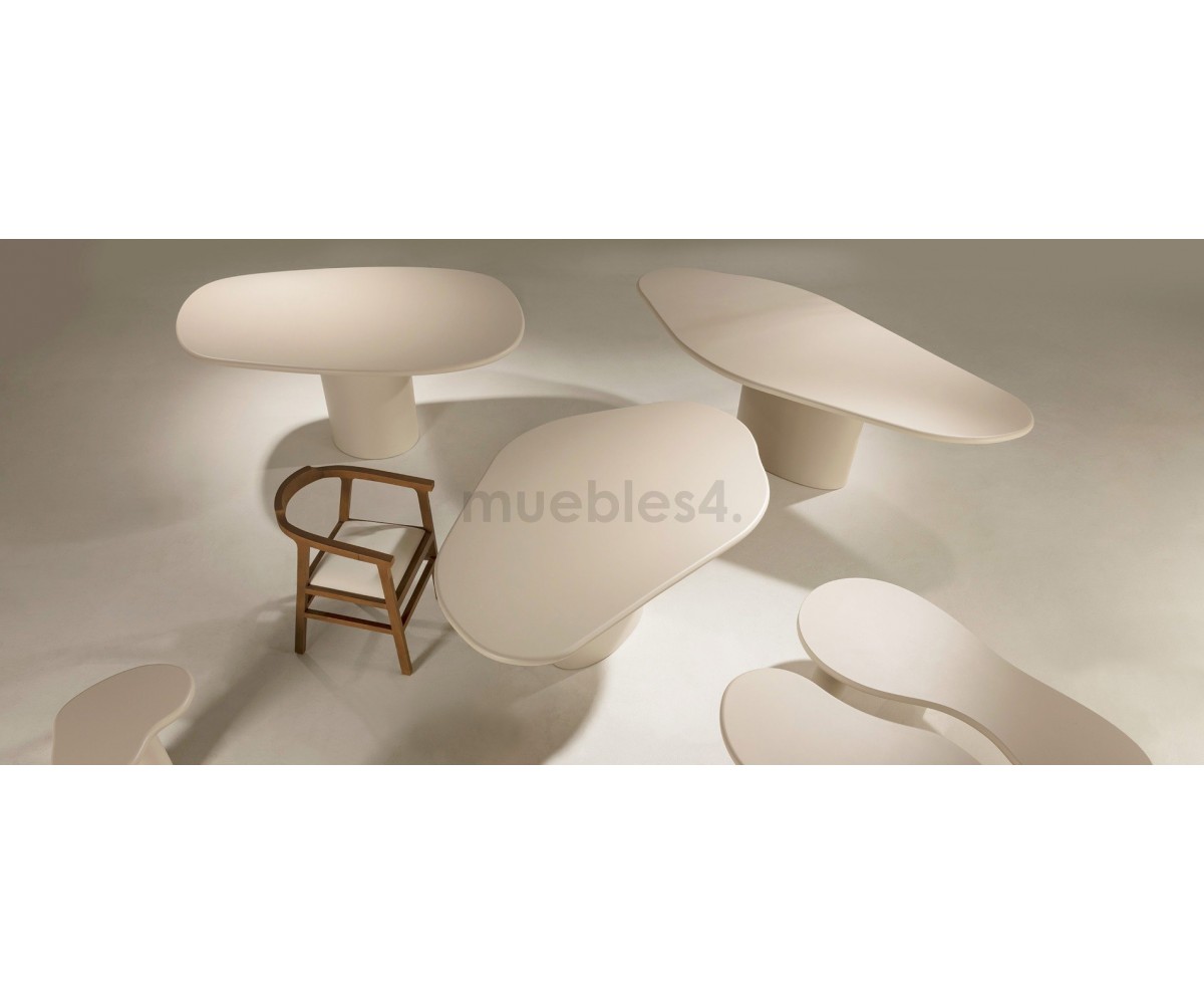 Mesa de centro inspirada en un diseño de Isabelle Beaumont. Mesa rediseñada y fabricada por Vicent Van Duysen, diseño contemporáneo de formas orgánicas y redondeadas con materiales ecológicos. Representa la unión perfecta entre simplicidad, funcionalidad y belleza. Prioridad de calidez minimalista con líneas puras, creando una atmósfera que transmite calma, sin renunciar a la funcionalidad, "El diseño debe ser sereno, funcional y táctil" (Vicent Van Duysen).