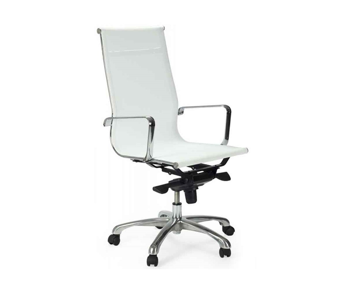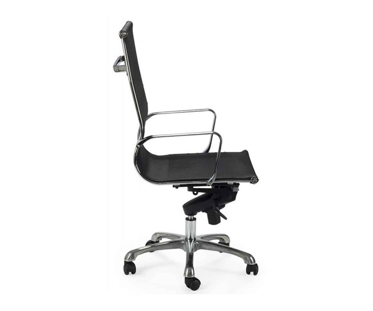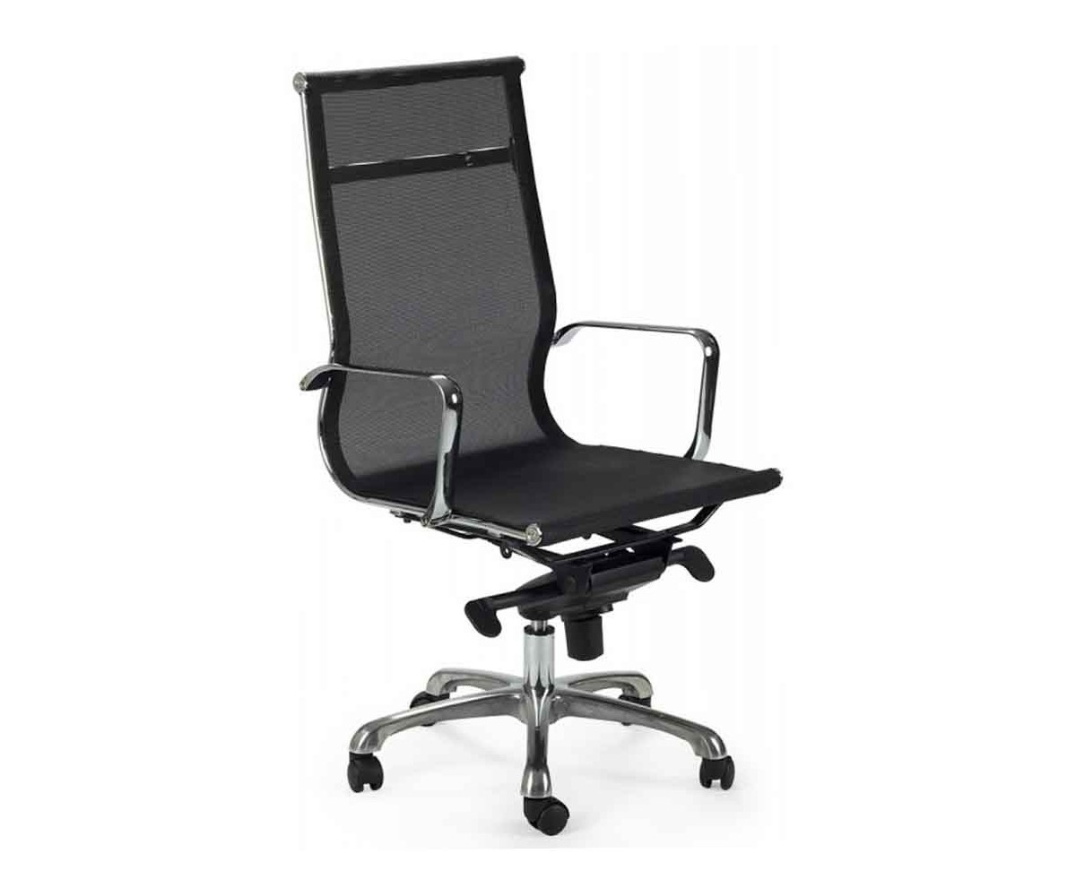 Silla de oficina giratoria inspirada en un diseño de Charles & Ray Eames. Armazón fabricado en acero terminación cromado, altura y inclinación del respaldo regulable mediante bomba de aire, carcasa con respaldo alto, asiento y respaldo en malla color negro o blanco de gran dureza y durabilidad. Réplica exacta con materiales originales de máxima calidad.
