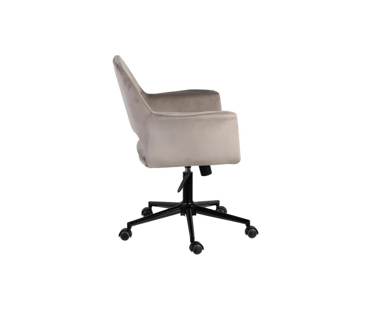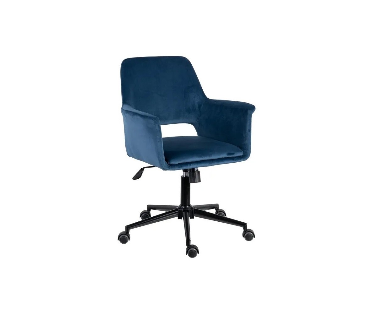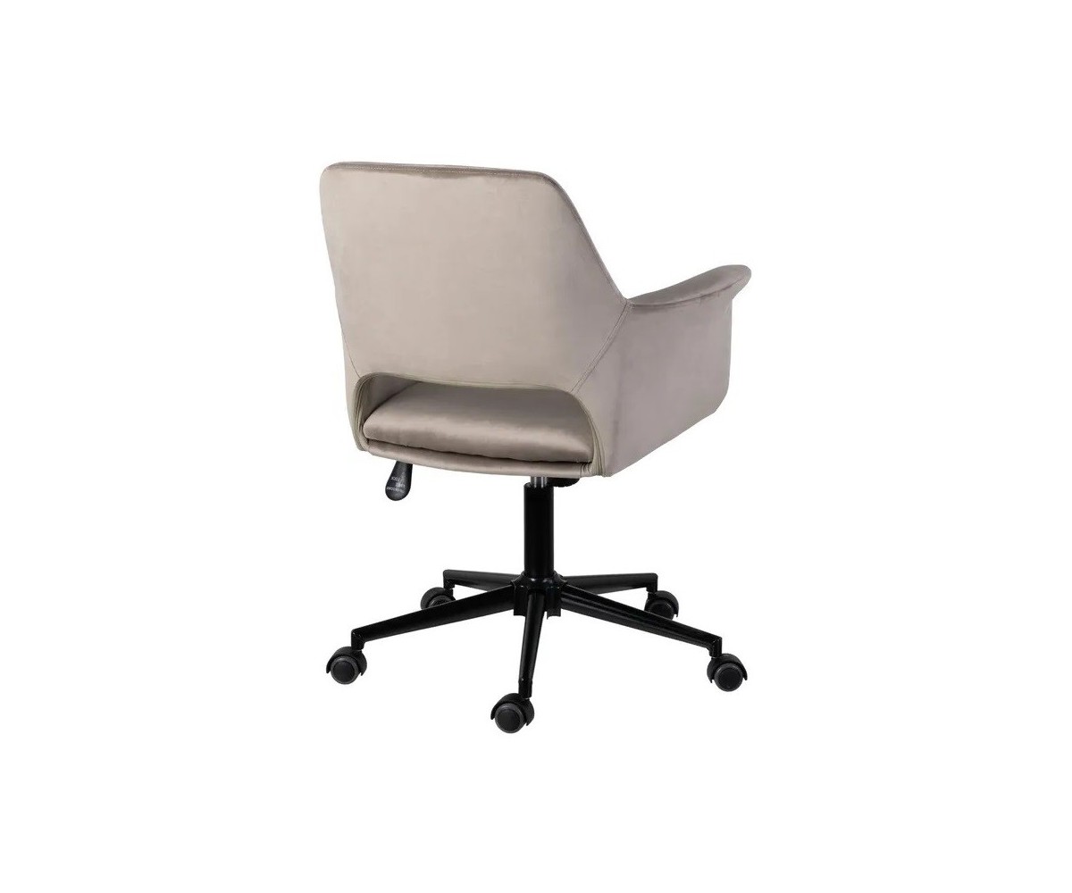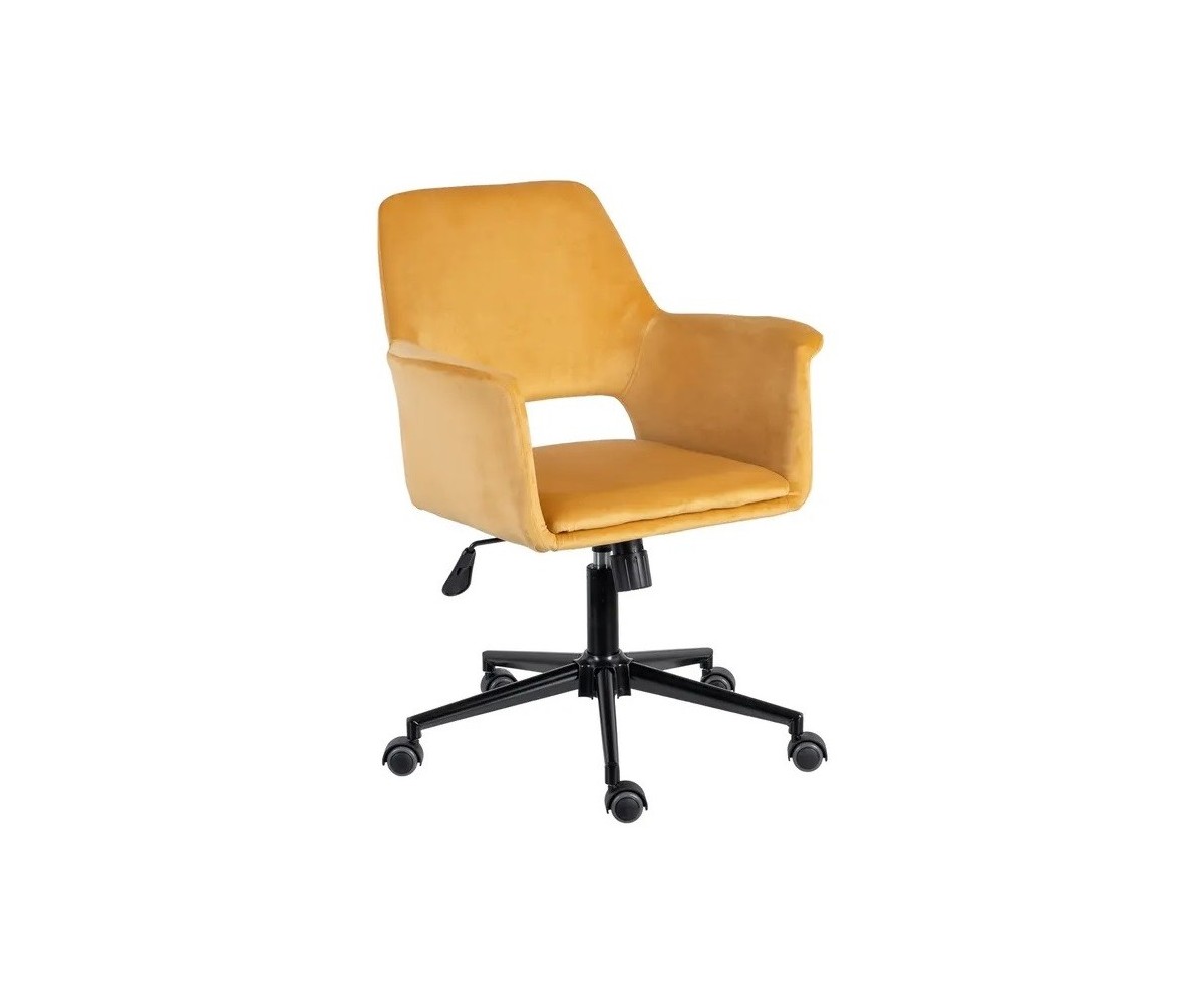 Silla de oficina inspirada en un diseño de Emmanuel Orlosi. Base fabricada en acero lacado al horno color negro, compuesta por 5 aspas con ruedas. Asiento y respaldo tapizado en tela terciopelo color beige, mostaza/amarillo, marrón, azul y gris. Carcasa giratoria y regulable en altura mediante bomba de aire. Réplica con materiales originales de máxima calidad.