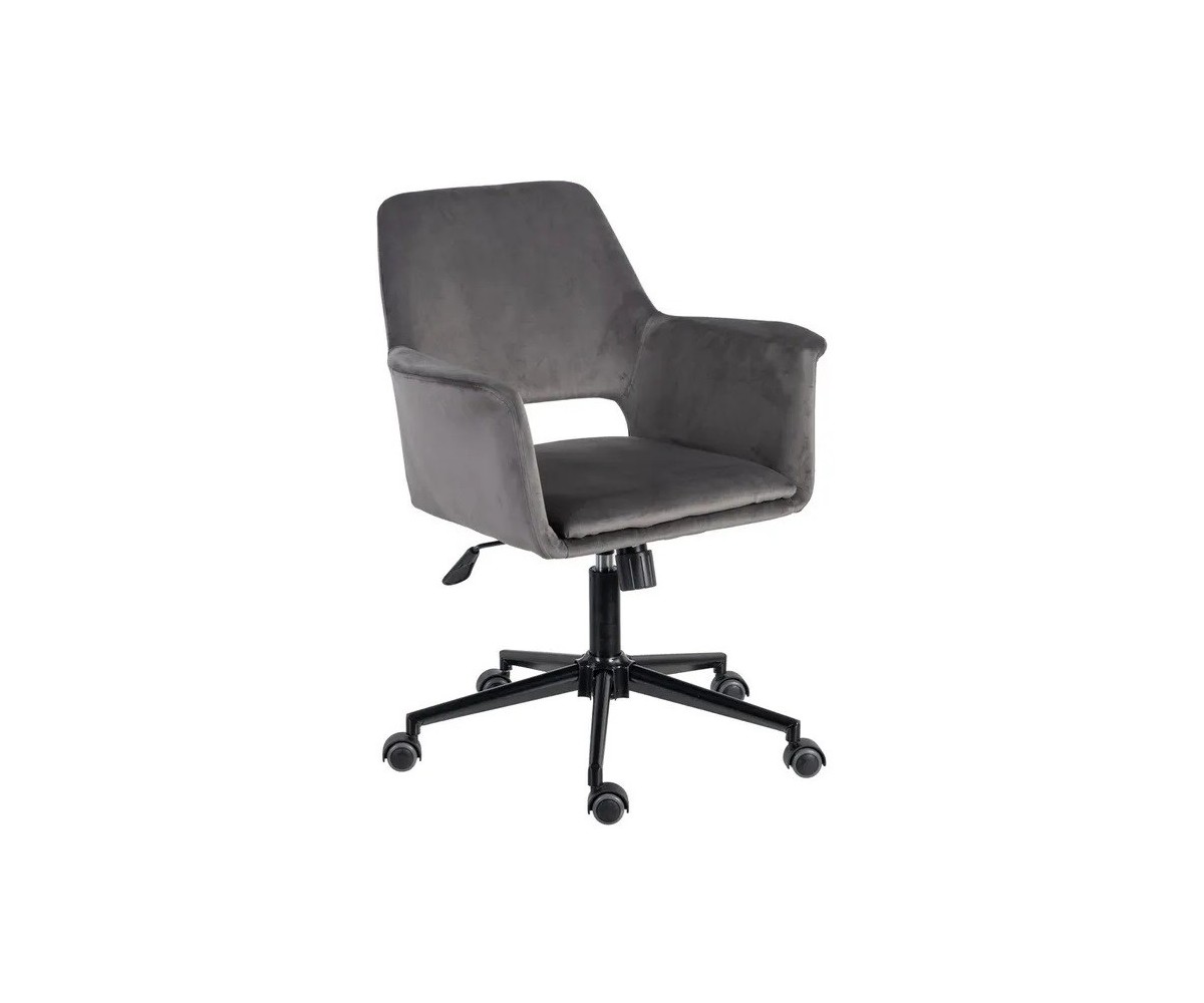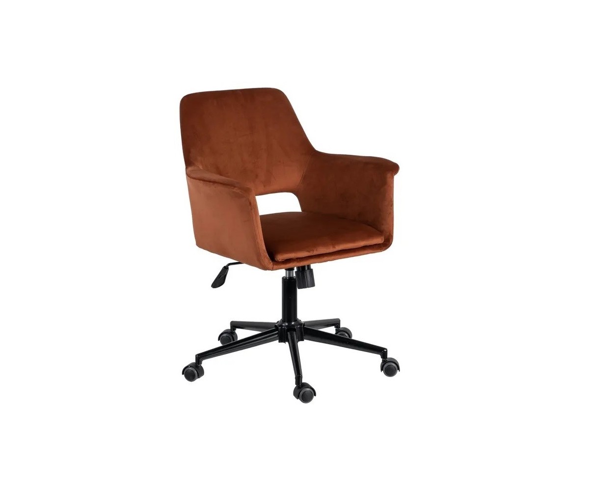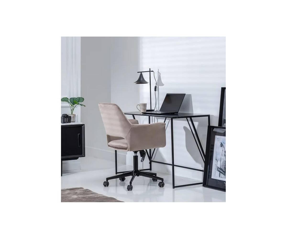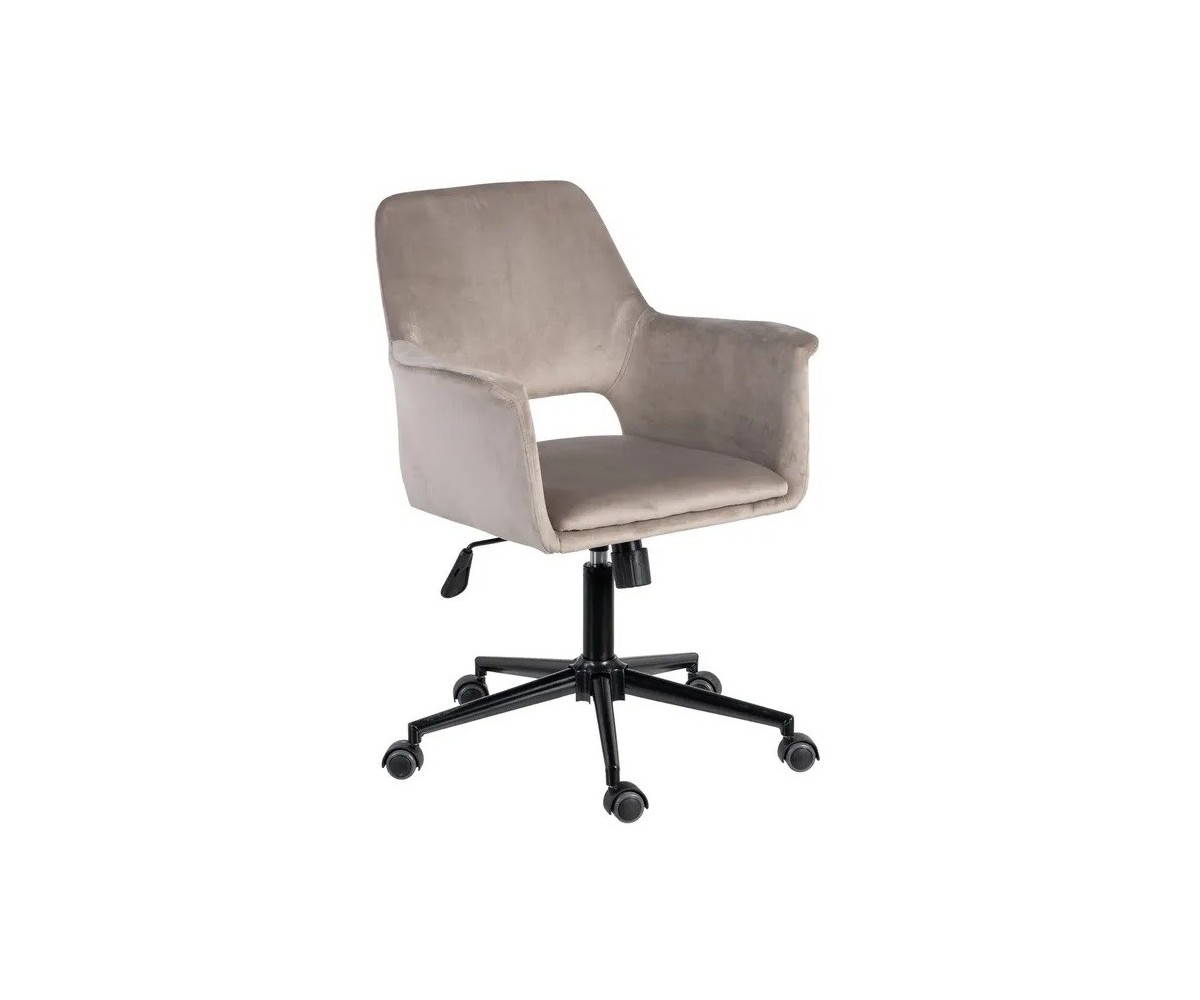 Silla de oficina inspirada en un diseño de Emmanuel Orlosi. Base fabricada en acero lacado al horno color negro, compuesta por 5 aspas con ruedas. Asiento y respaldo tapizado en tela terciopelo color beige, mostaza/amarillo, marrón, azul y gris. Carcasa giratoria y regulable en altura mediante bomba de aire. Réplica con materiales originales de máxima calidad.