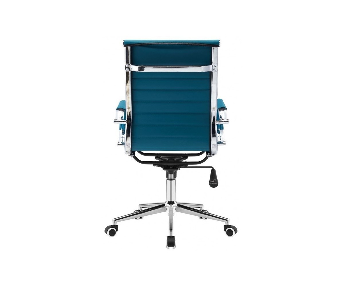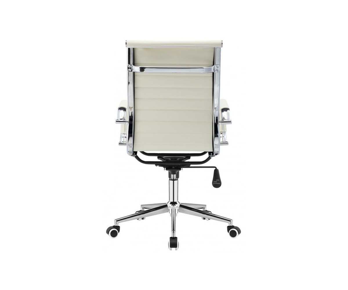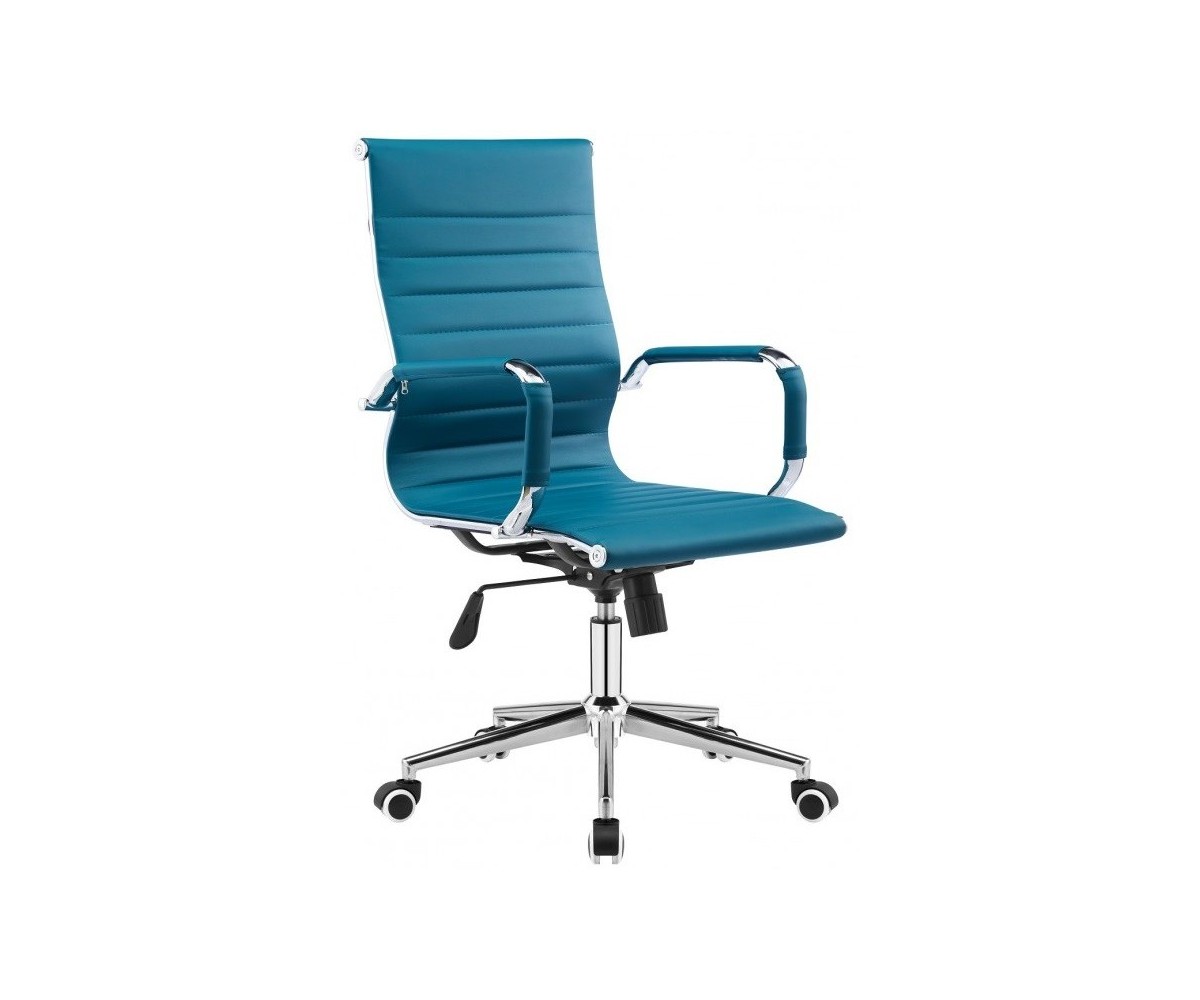 Silla de oficina giratoria inspirada en un diseño de Charles & Ray Eames. Armazón fabricado en acero terminación cromado, altura y inclinación del respaldo regulable mediante bomba de aire, carcasa con respaldo alto, asiento y respaldo tapizado en piel ecológica color azul o beige de gran dureza y durabilidad. Réplica exacta con materiales originales de máxima calidad.