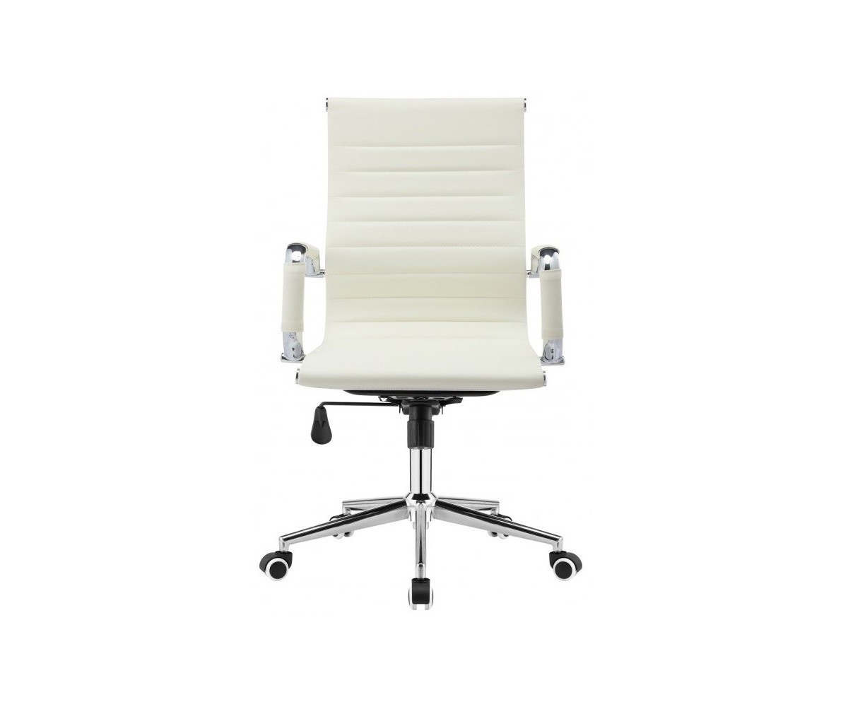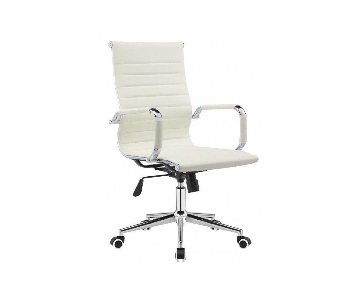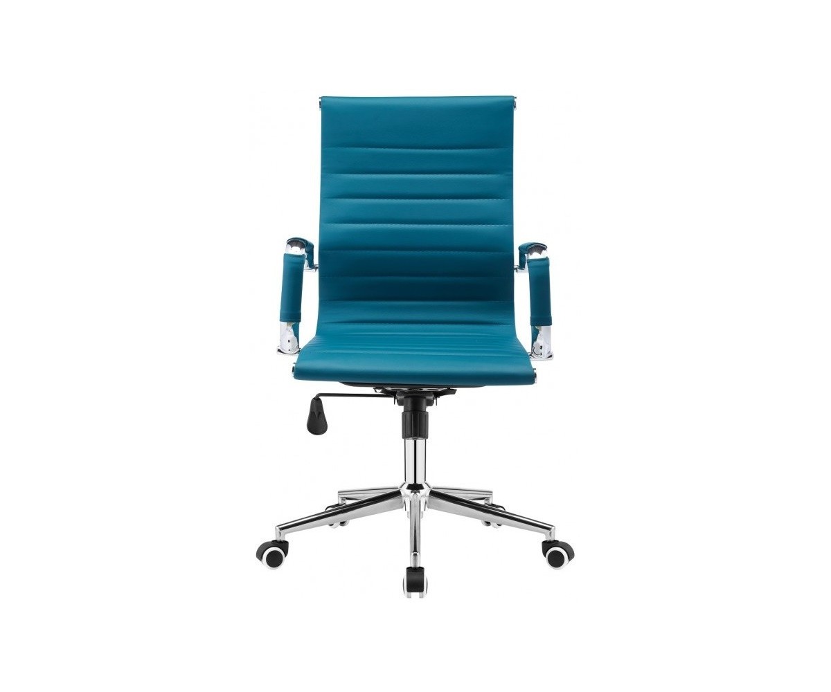 Silla de oficina giratoria inspirada en un diseño de Charles & Ray Eames. Armazón fabricado en acero terminación cromado, altura y inclinación del respaldo regulable mediante bomba de aire, carcasa con respaldo alto, asiento y respaldo tapizado en piel ecológica color azul o beige de gran dureza y durabilidad. Réplica exacta con materiales originales de máxima calidad.