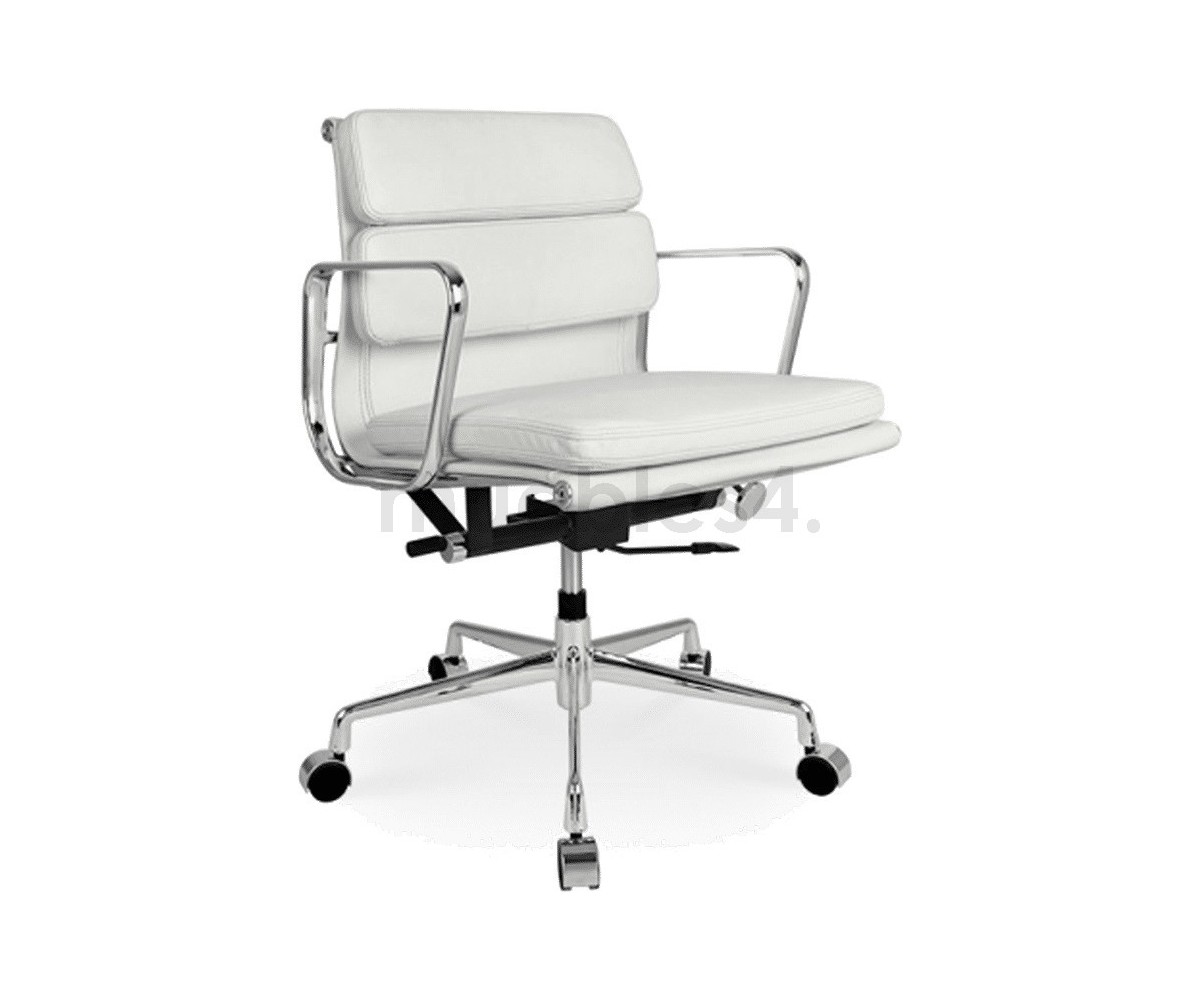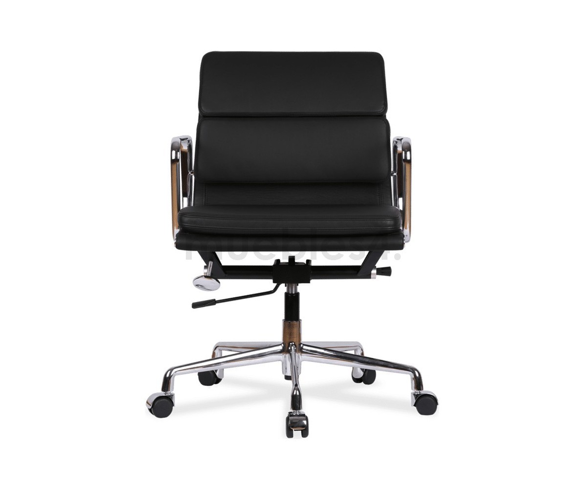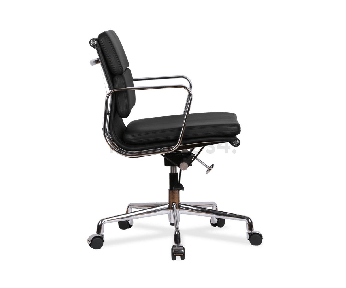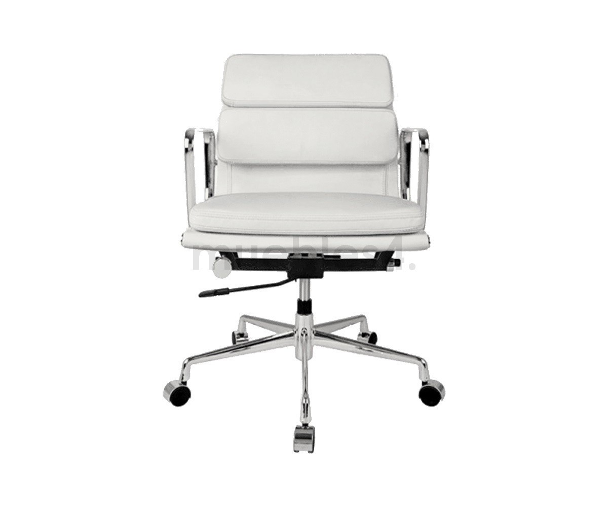Silla de oficina inspirada en un diseño de Charles & Ray Eames. Por su forma y construcción se asemeja a la Aluminium Chair. Extraordinario confort, al combinar el mecanismo de inclinación, que puede ajustarse al peso del usuario, y al suave acolchado. Su diseño elegante, simple y cómodo hace que sea un producto perfecto para oficinas, despachos, estudios.