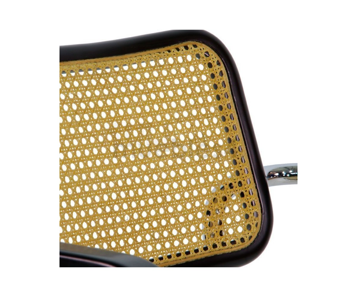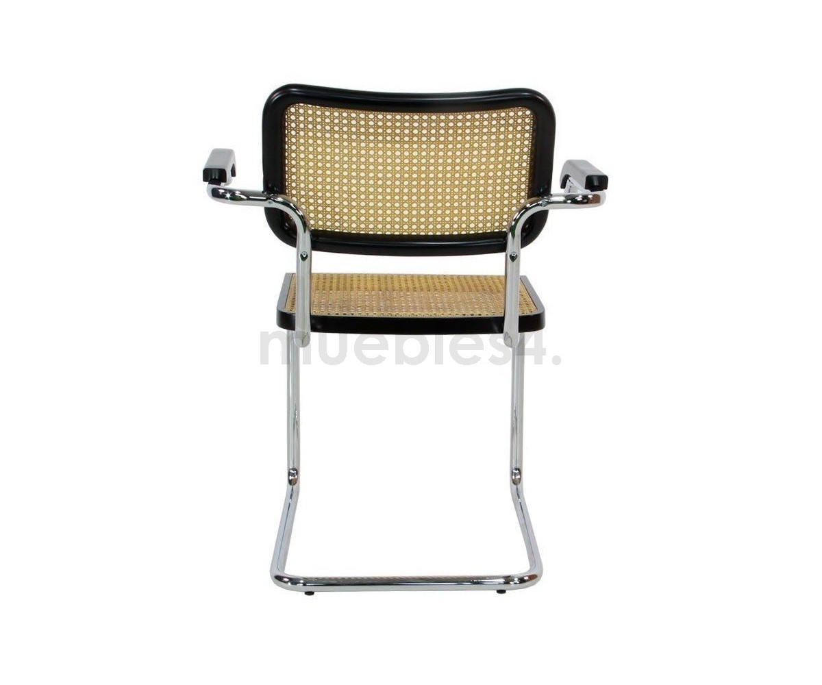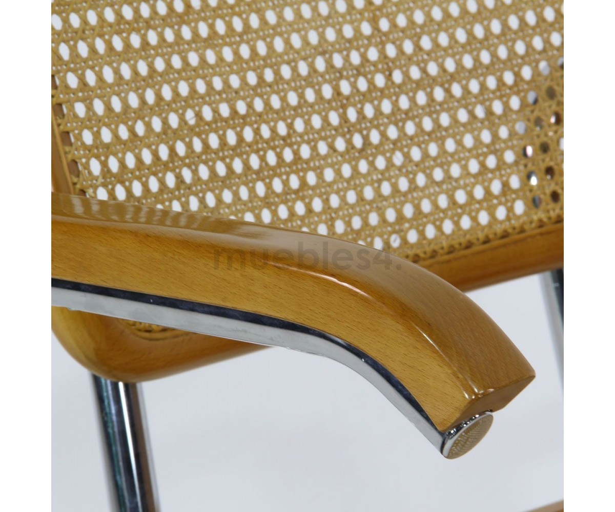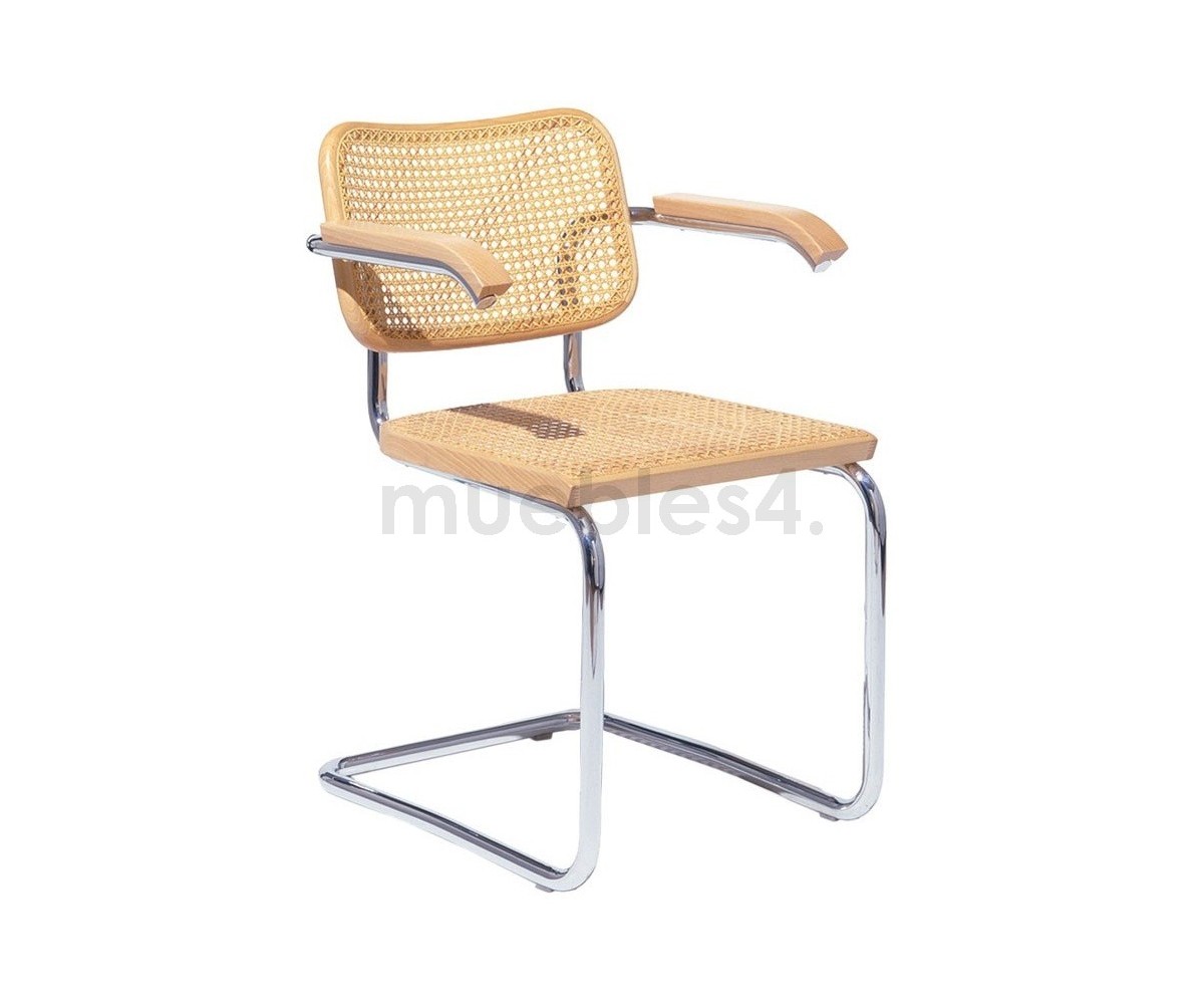 Silla con brazos inspirado en un diseño de Marcel Breuer. Estructura tubular en acero inoxidable brillo, asiento y respaldo en madera con marco en roble claro natural o negra, caña natural. Réplica exacta con materiales originales de máxima calidad.