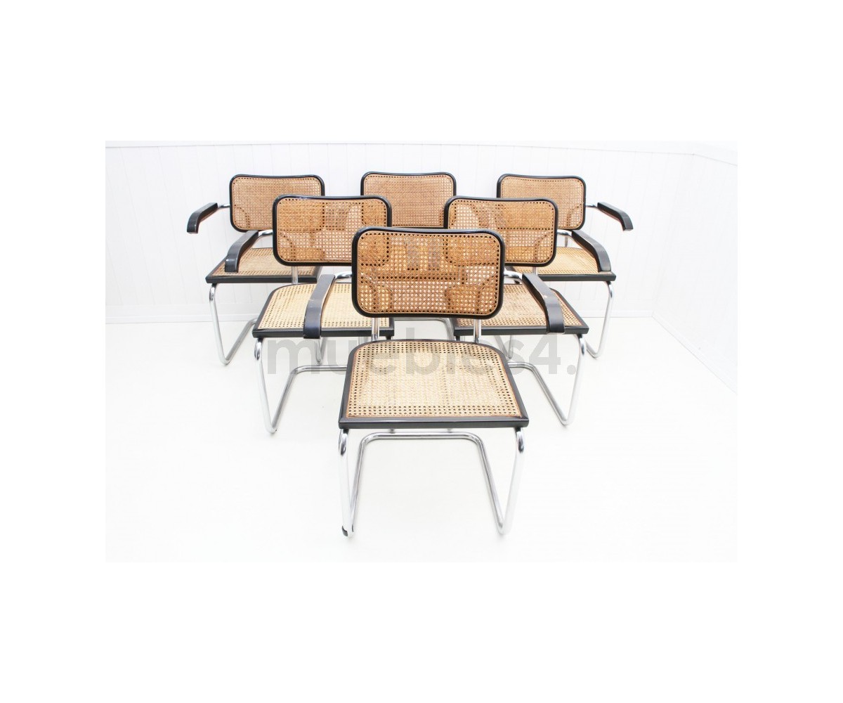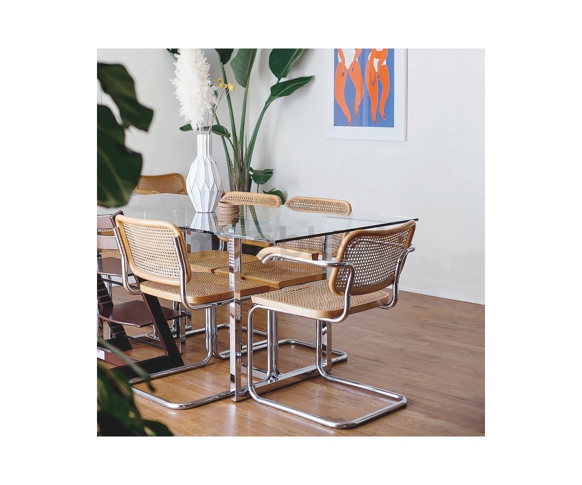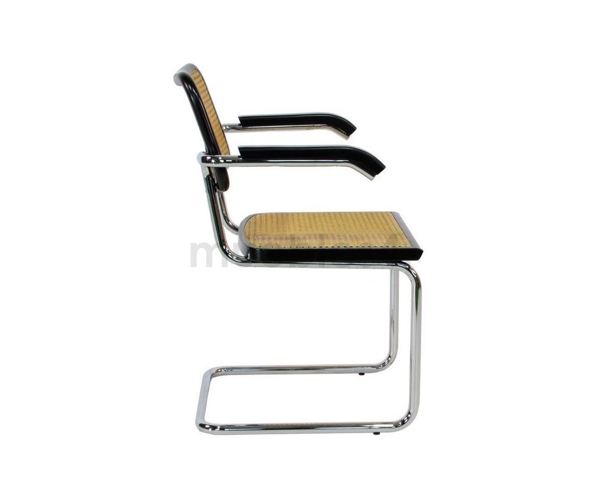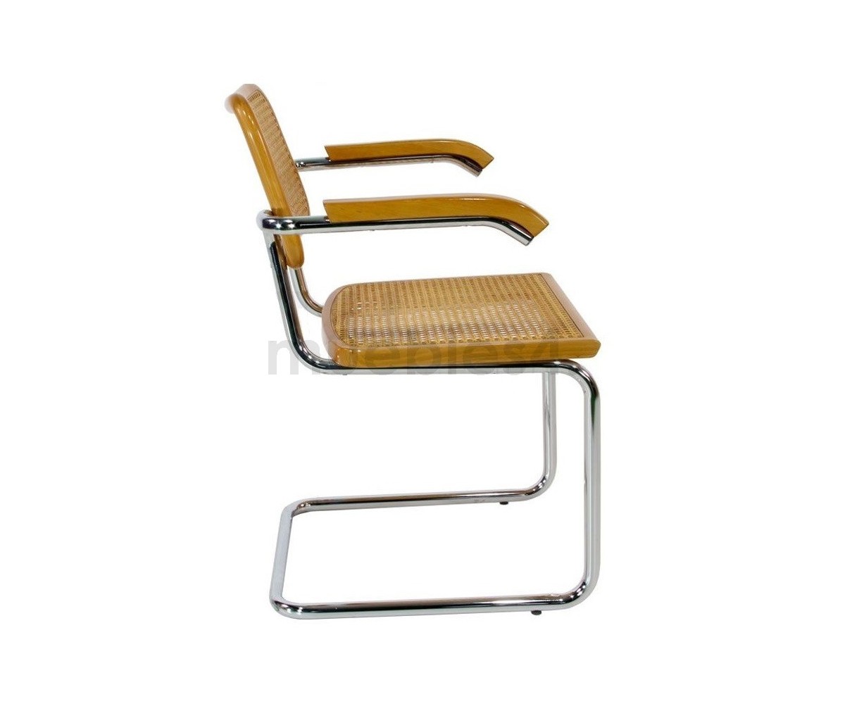 Silla con brazos inspirado en un diseño de Marcel Breuer. Estructura tubular en acero inoxidable brillo, asiento y respaldo en madera con marco en roble claro natural o negra, caña natural. Réplica exacta con materiales originales de máxima calidad.