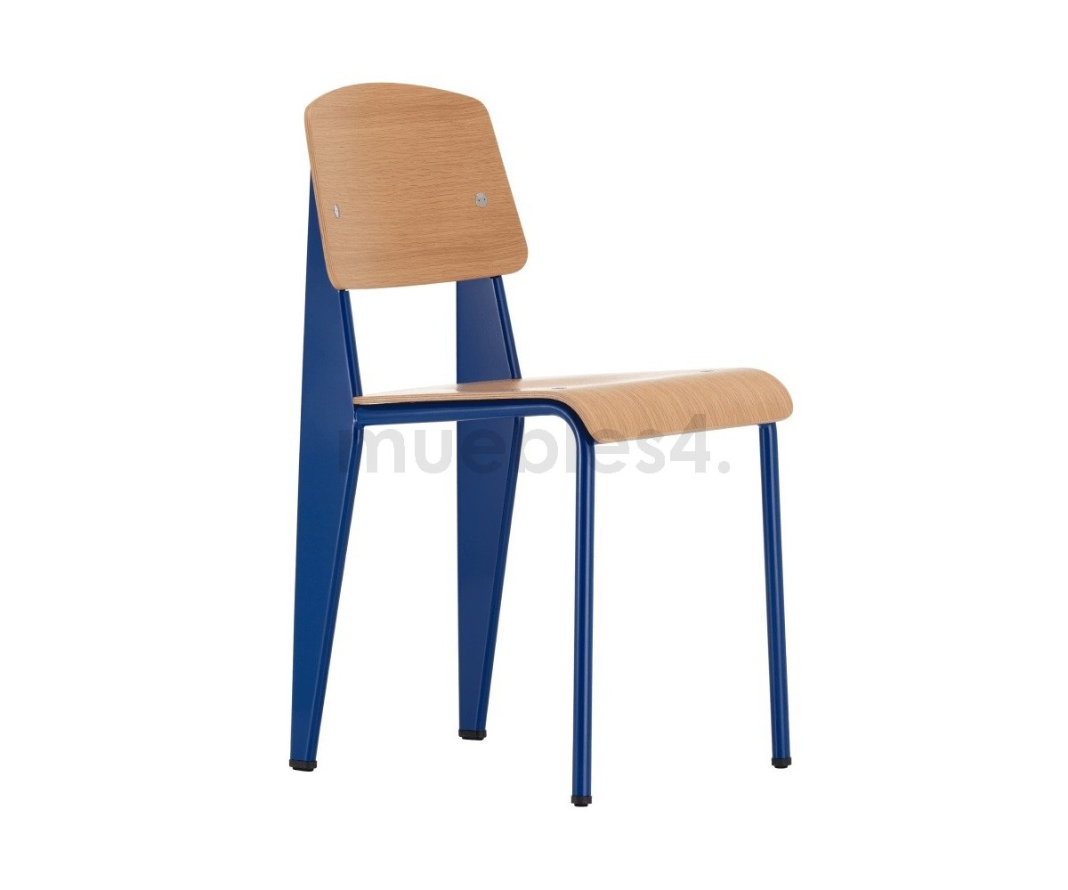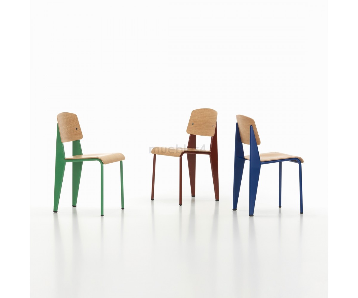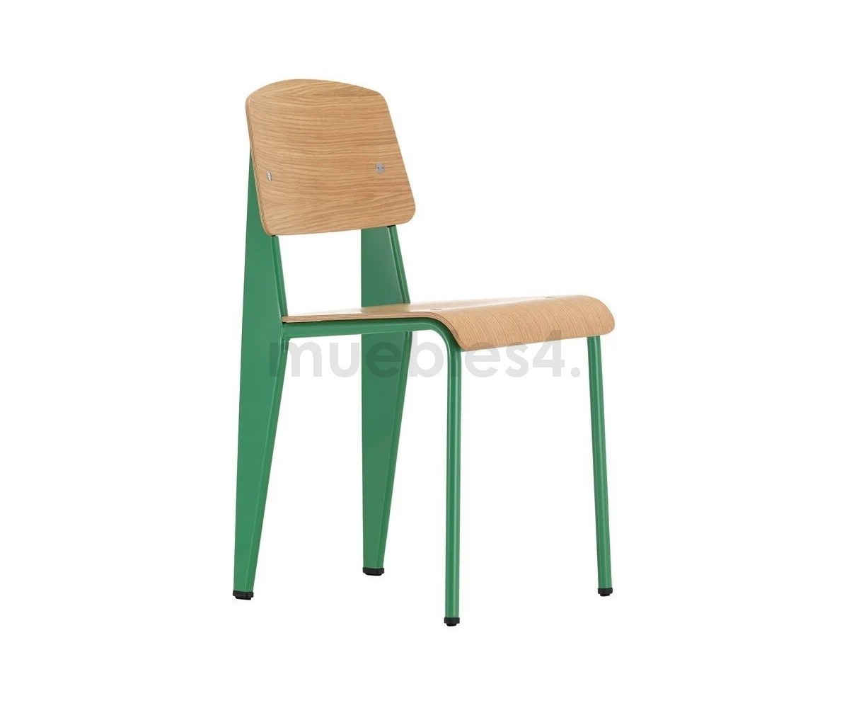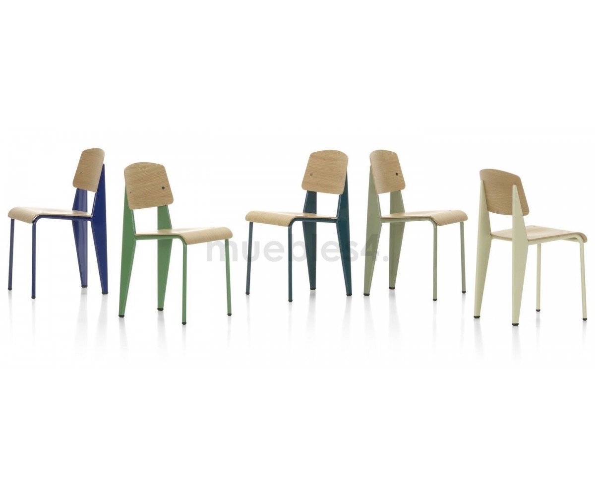 Silla, inspirada en un diseño de Jean Prouvé. La Standard Chair se ha convertido en uno de los clásicos más famosos del diseñador francés. La estructura metálica de esta icónica silla, está disponible en distintos colores. La silla esta pensada y fabricada para soportar mas carga en las patas traseras, donde debe sustentar el peso de la parte superior del cuerpo.