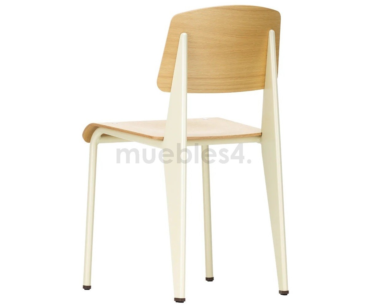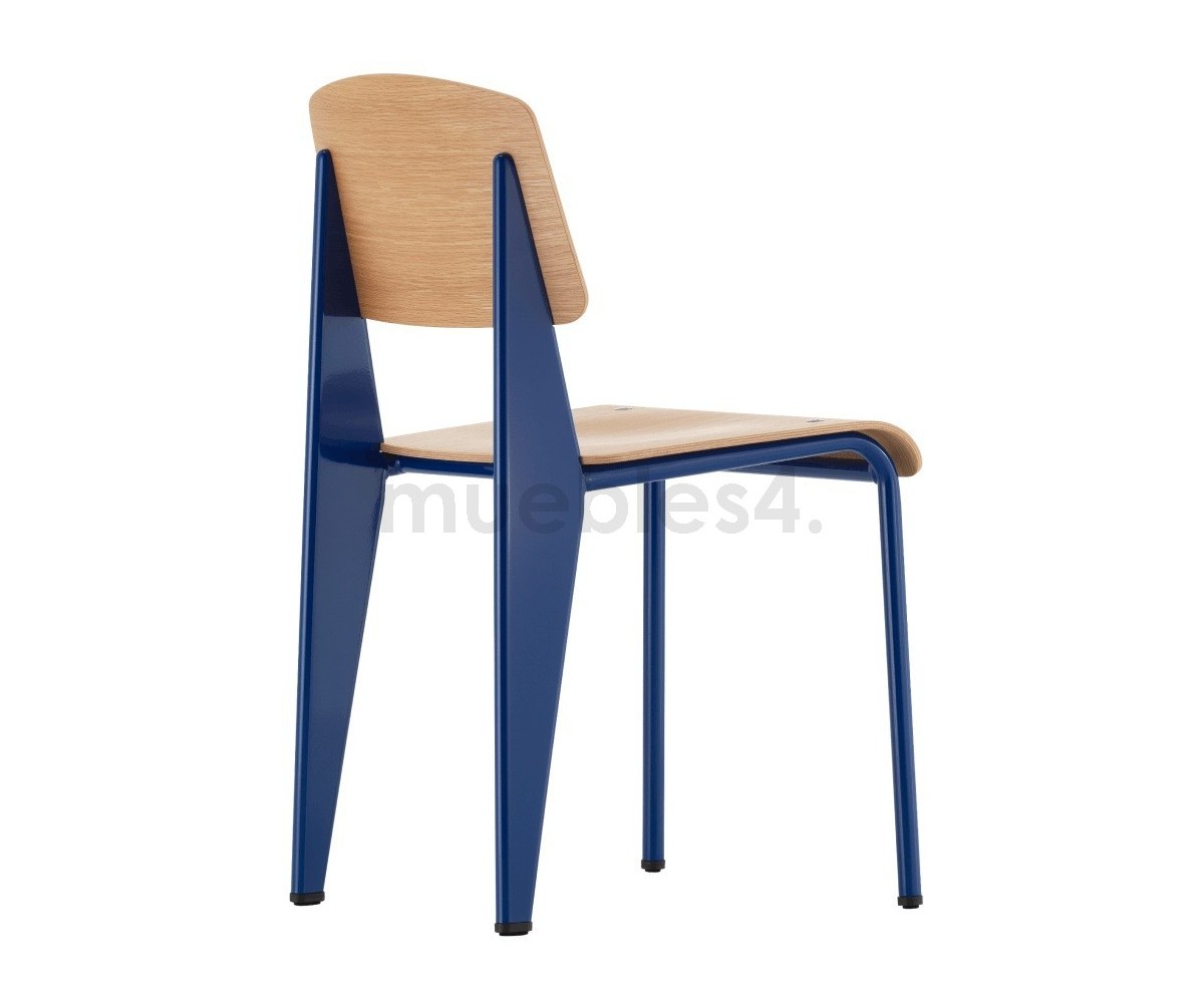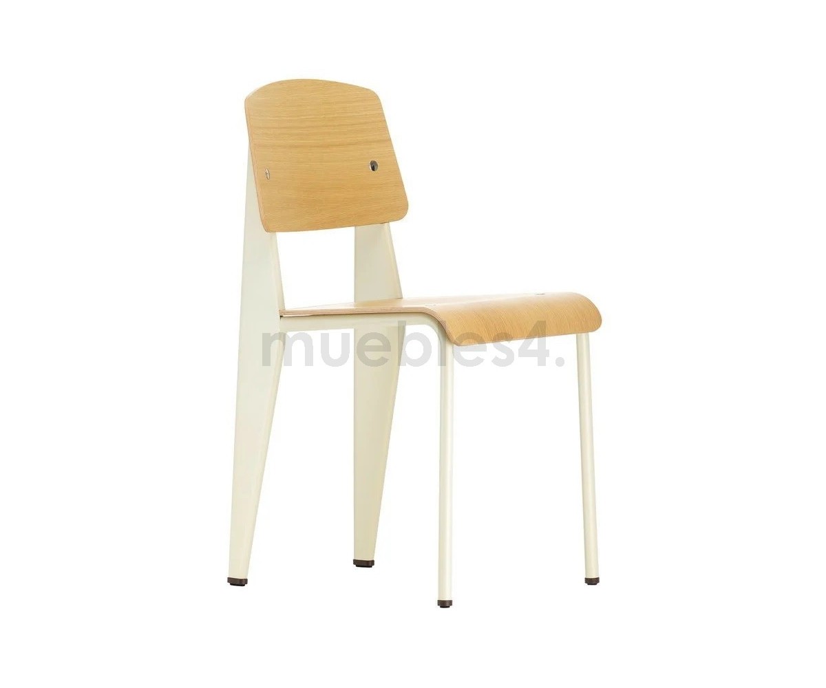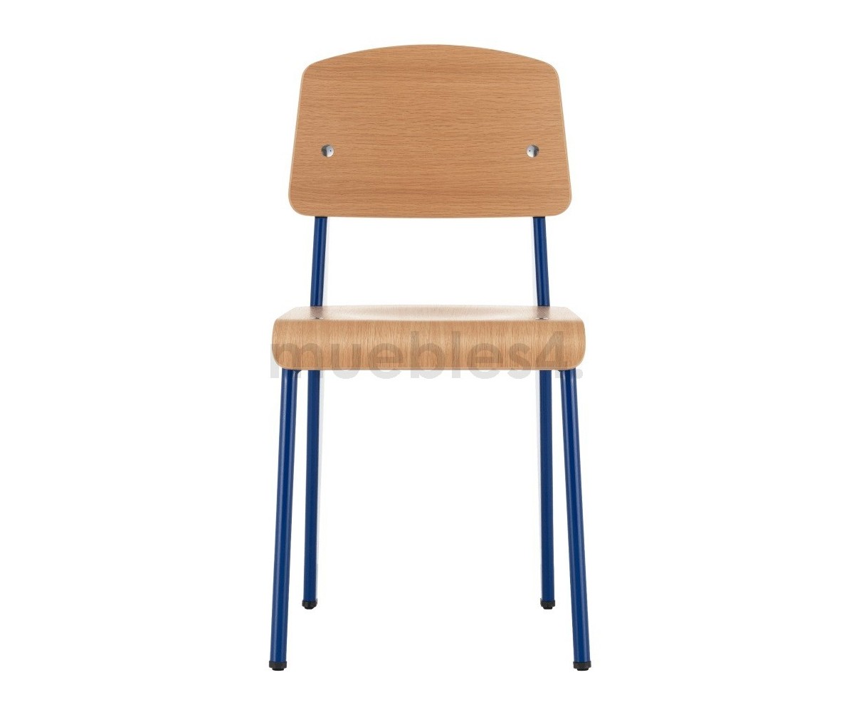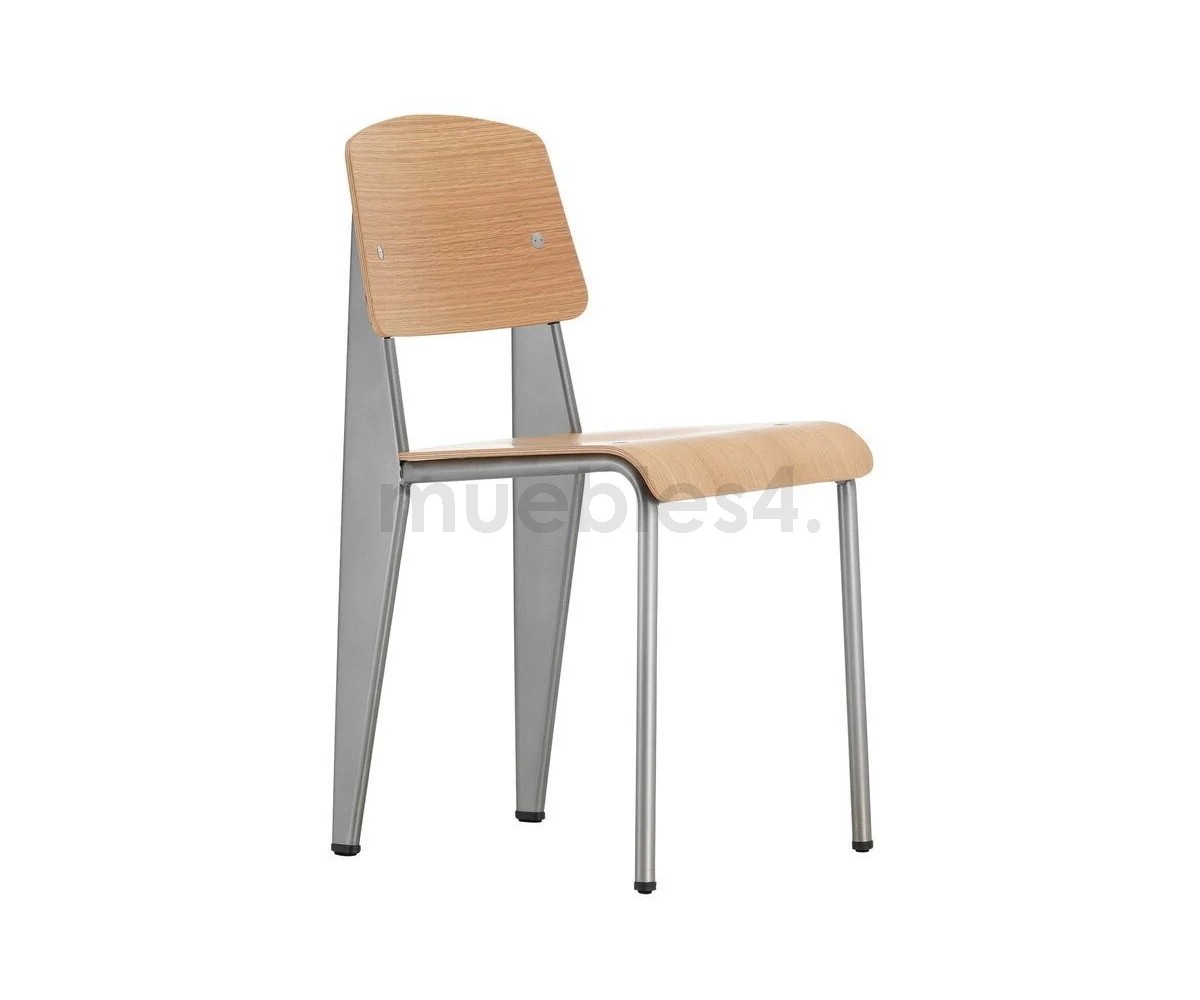 Silla, inspirada en un diseño de Jean Prouvé. La Standard Chair se ha convertido en uno de los clásicos más famosos del diseñador francés. La estructura metálica de esta icónica silla, está disponible en distintos colores. La silla esta pensada y fabricada para soportar mas carga en las patas traseras, donde debe sustentar el peso de la parte superior del cuerpo.