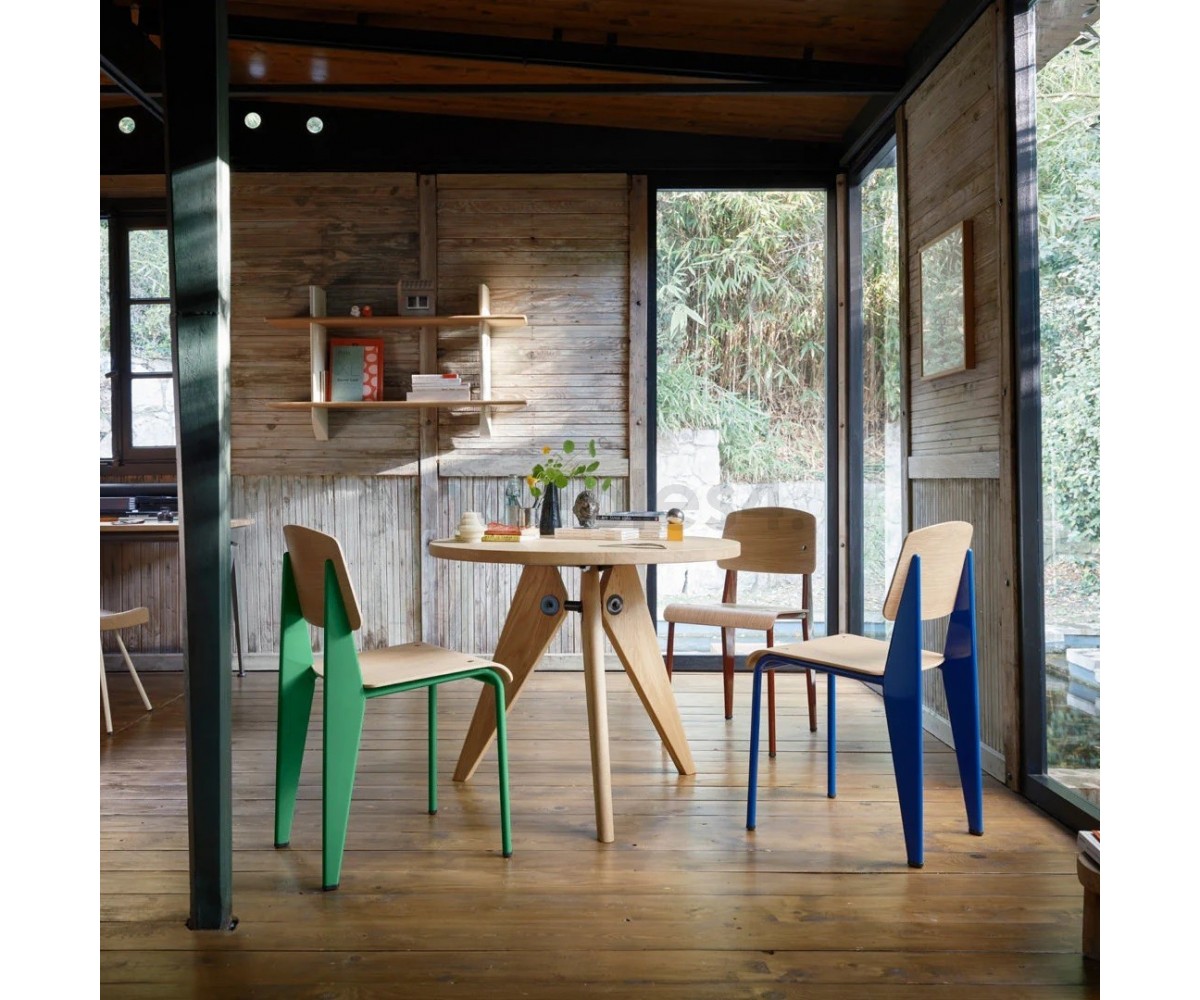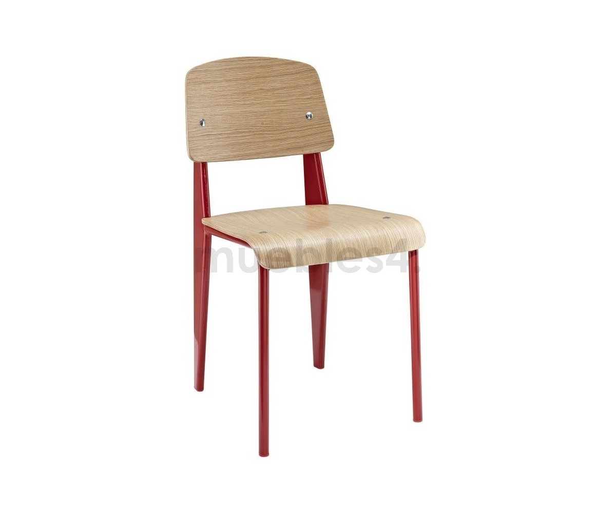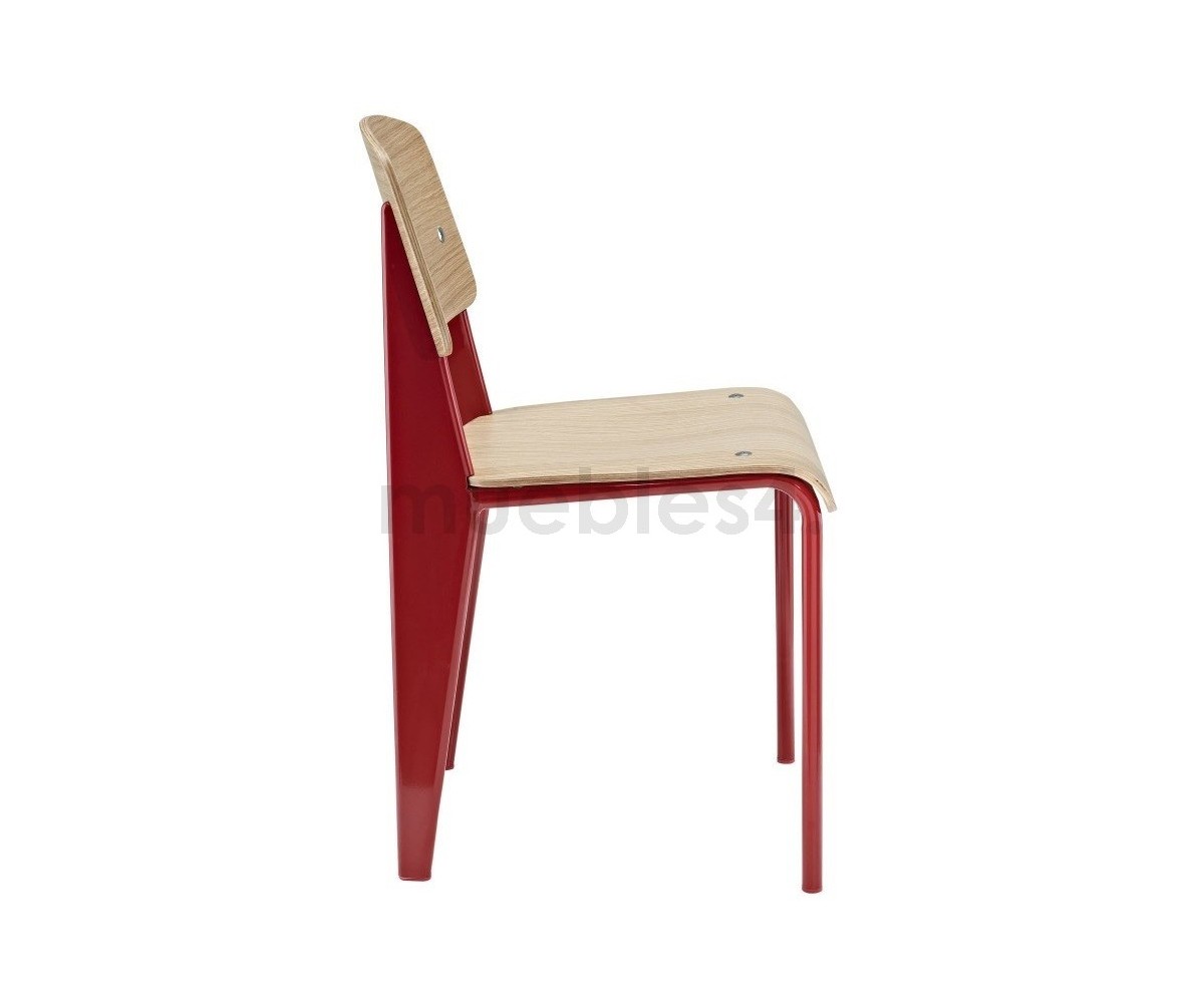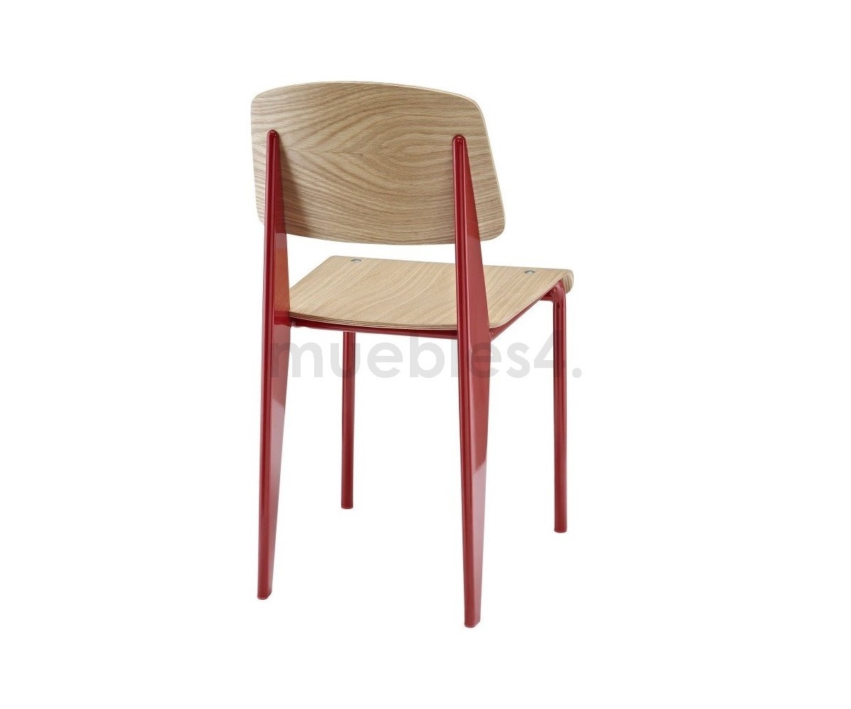 Silla, inspirada en un diseño de Jean Prouvé. La Standard Chair se ha convertido en uno de los clásicos más famosos del diseñador francés. La estructura metálica de esta icónica silla, está disponible en distintos colores. La silla esta pensada y fabricada para soportar mas carga en las patas traseras, donde debe sustentar el peso de la parte superior del cuerpo.