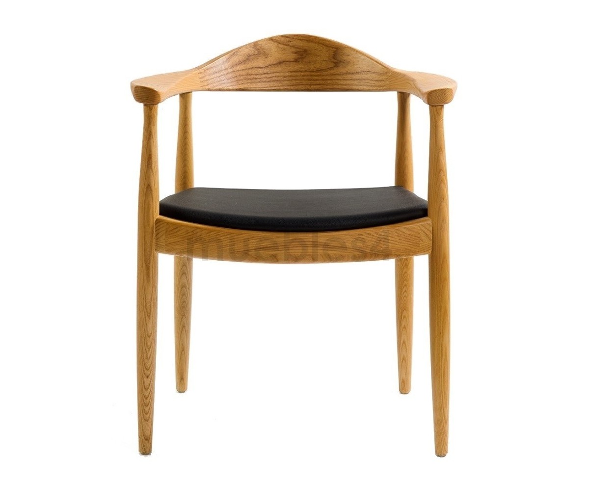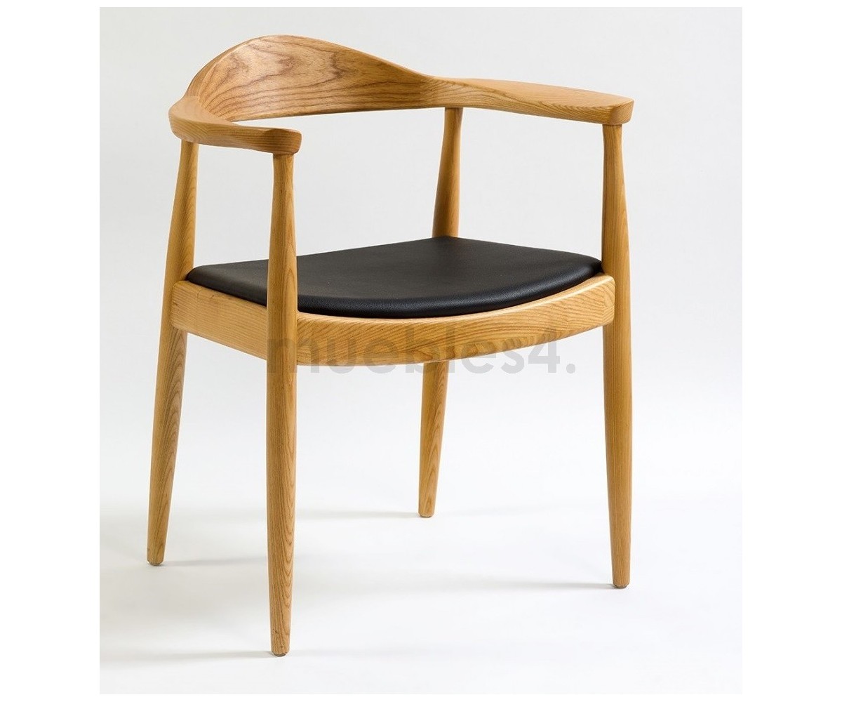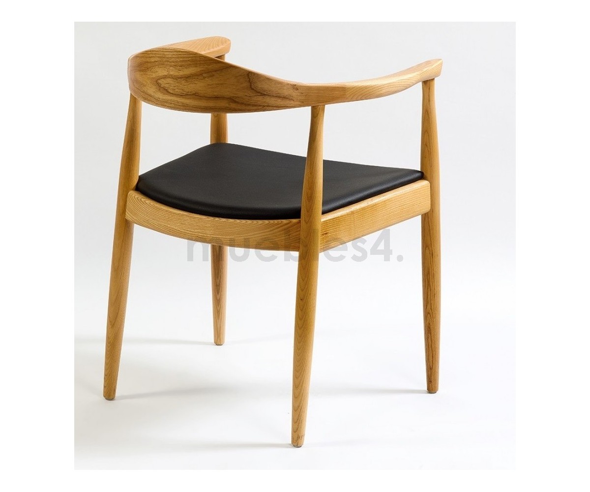 Silla con apoyabrazos inspirada en un diseño de Hans J. Wegner. Estructura fabricada en madera de fresno natural, asiento tapizado en piel stamdar color negro. Réplica exacta con materiales originales de máxima calidad.