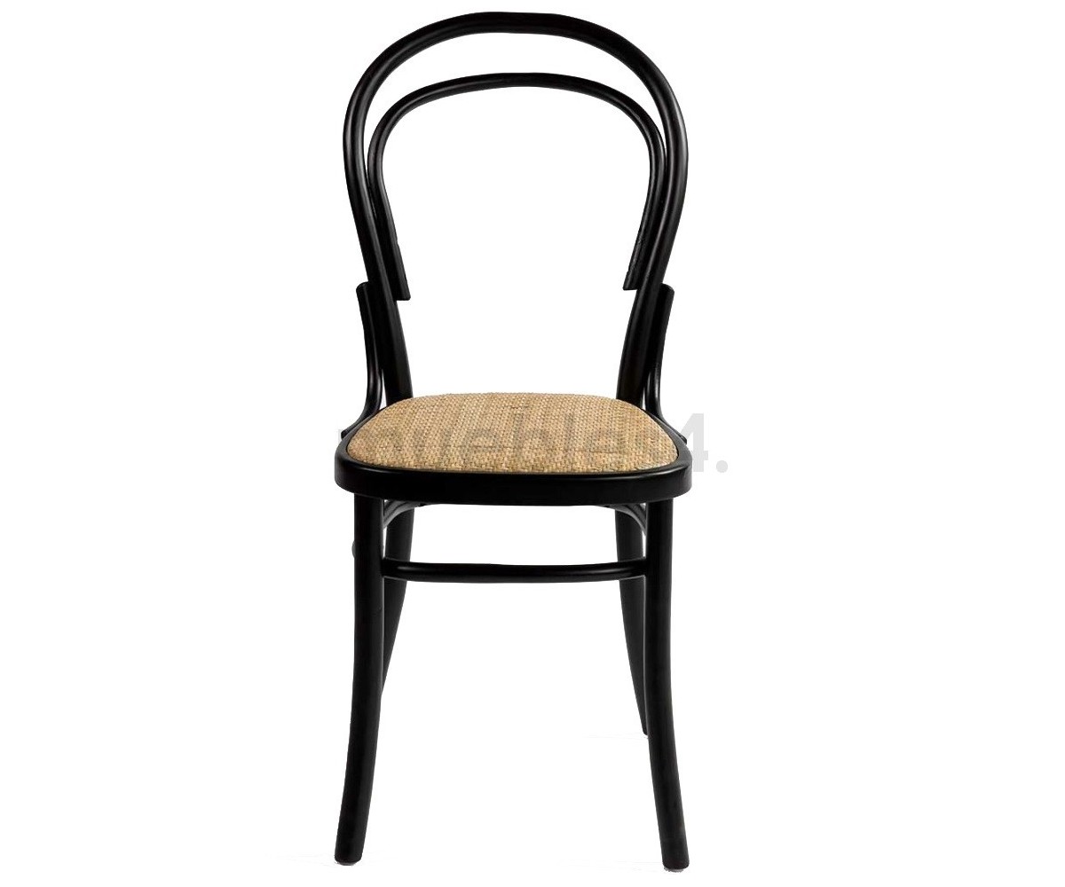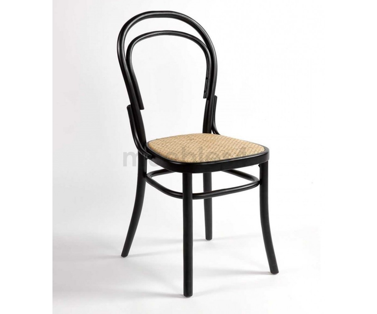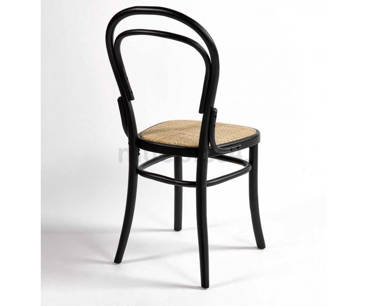 Silla inspirada en un diseño de Michael Thonet. Estructura fabricada en madera natual de roble macizo, terminación con TRIPLE lacado color negro. Asiento en rattán natural. Réplica exacta con materiales originales de máxima calidad.