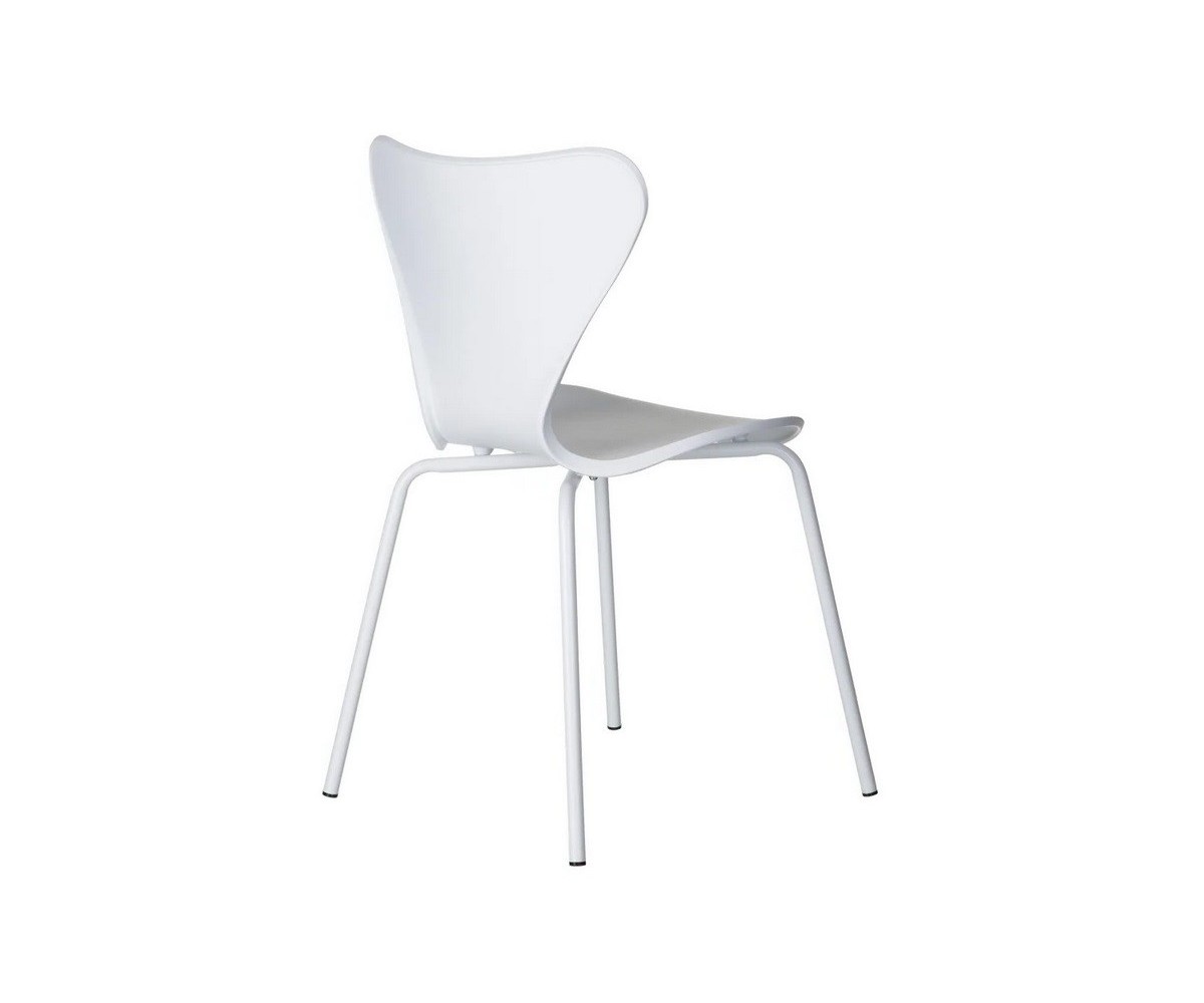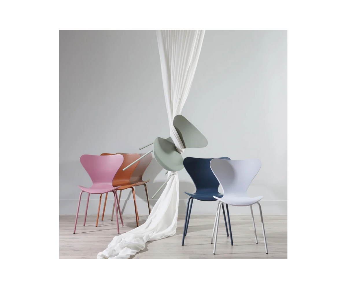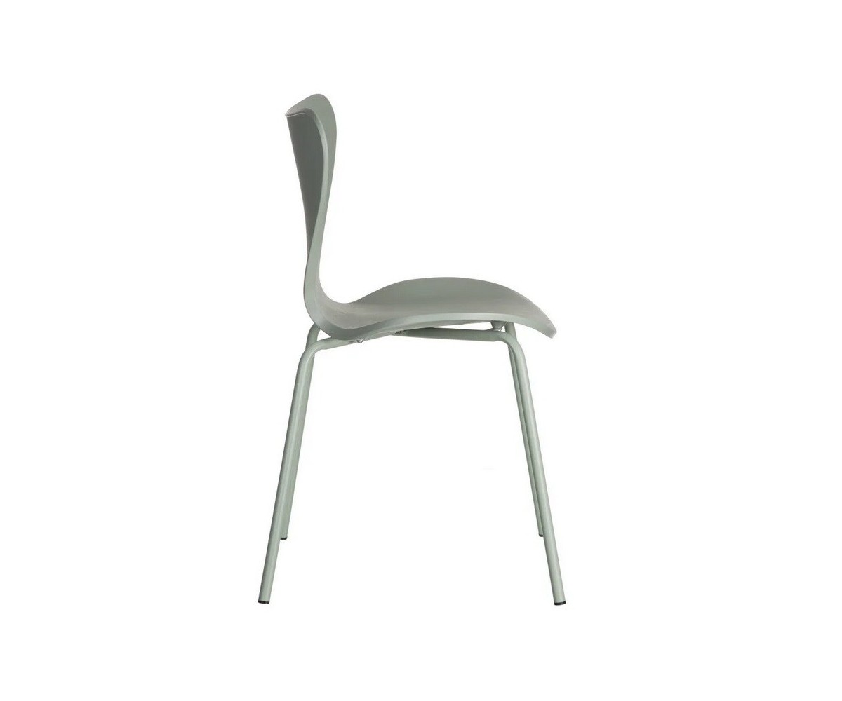 Silla inspirada en un diseño de Arne Jacobsen para Fritz Hansen. Asiento y respaldo fabricado en polipropileno inyectado de gran dureza y durabilidad, silla modeable por inyección, apilable. Uso interior y exterior. Respaldo con un grado de flexión que proporciona un gran confort. Superficie ligeramente texturizada, totalmente lavable. Estructrura tubular en acero con TRIPLE lacado mismo color que carcasa. Disponible en color blanco, negro, morado y verde menta. Réplica exacta con materiales originales de máxima calidad.