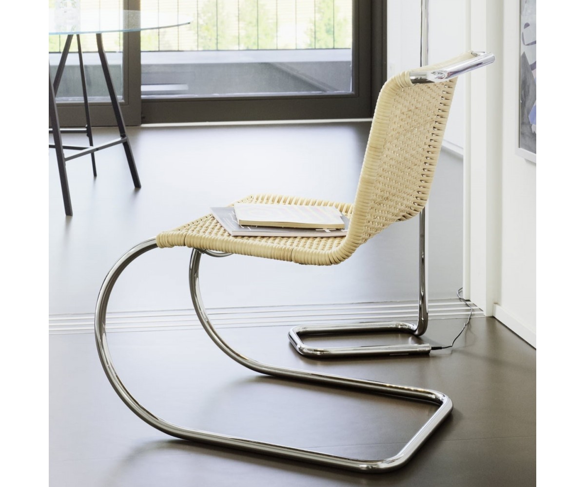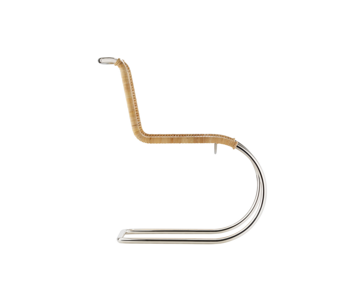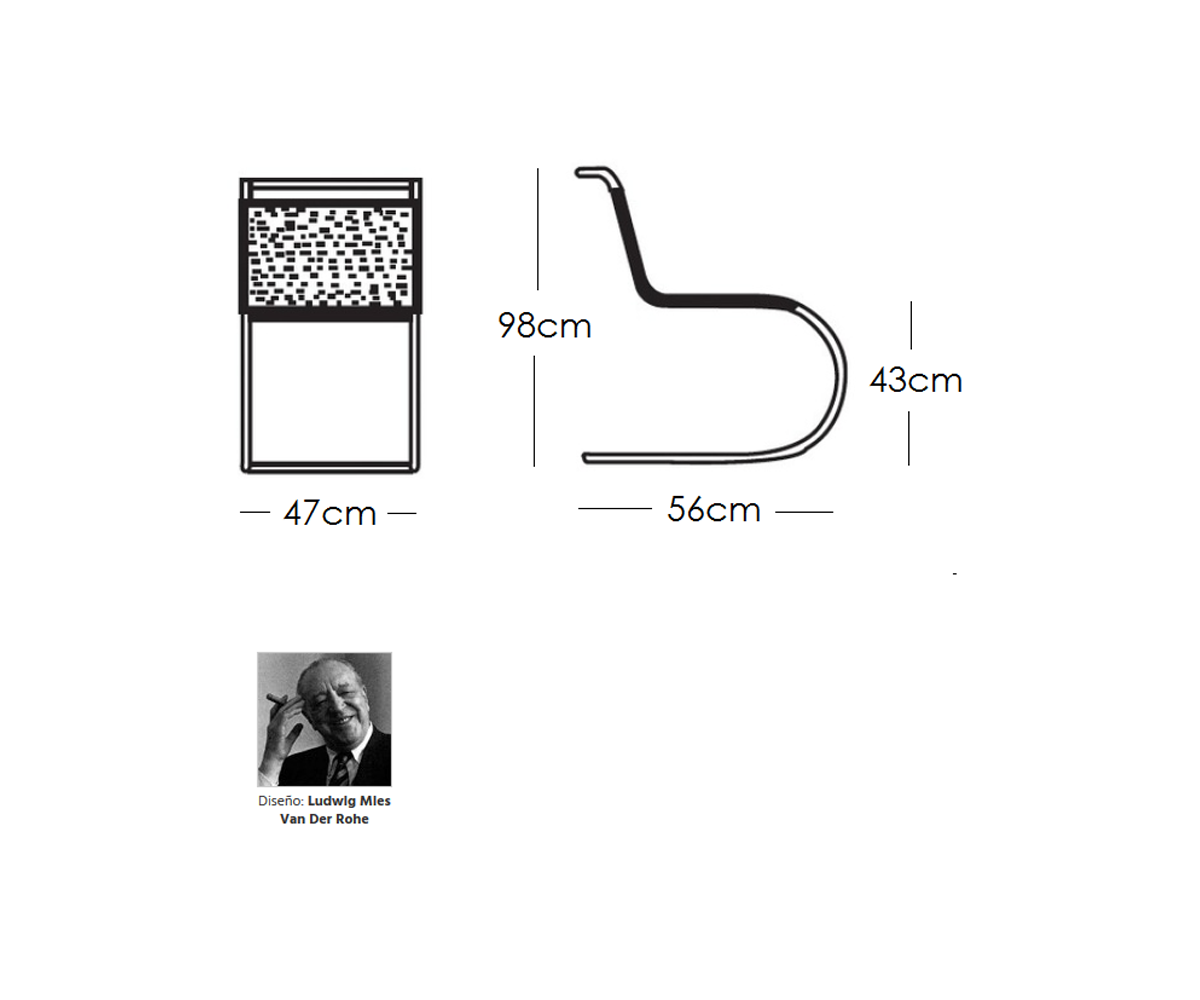 Silla fabricada en Italia, inspirada en un diseño de Ludwig Mies van der Rohe. Estructura armazón tubular de acero niquelado y con asiento en mimbre de doble entrelazado de palma rattan fabricado a mano artesanalmente. También disponible en piel. Réplica exacta con materiales originales de máxima calidad.