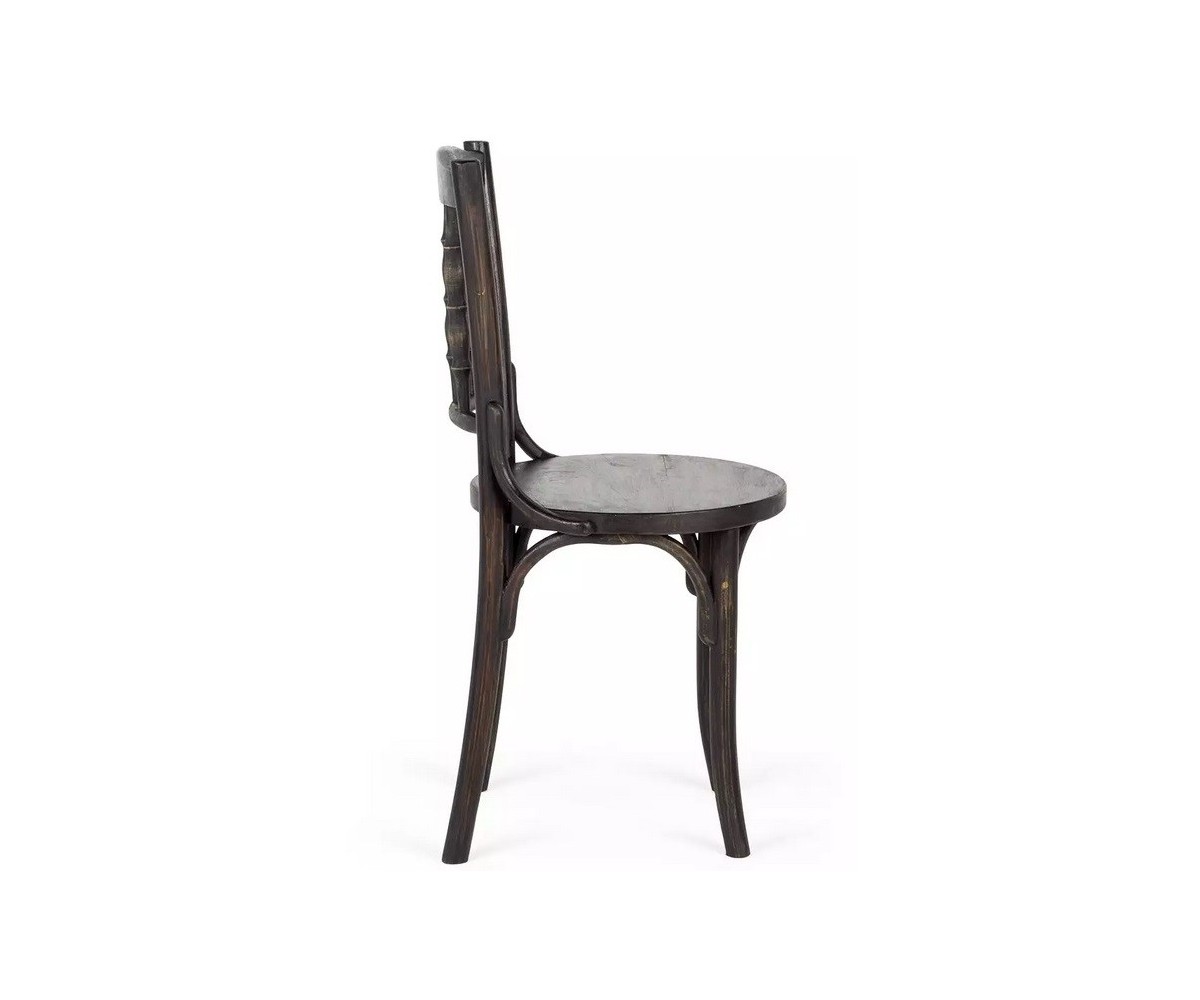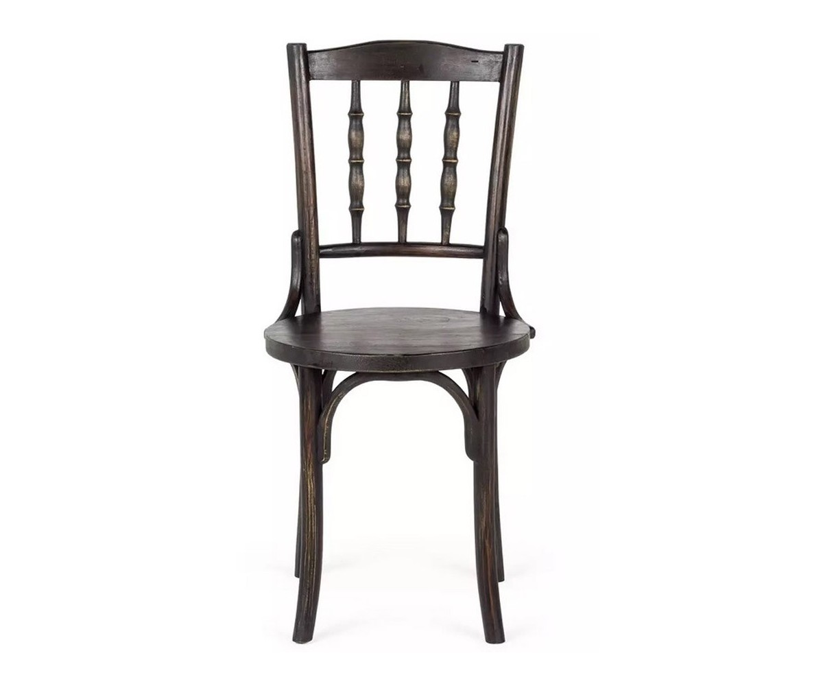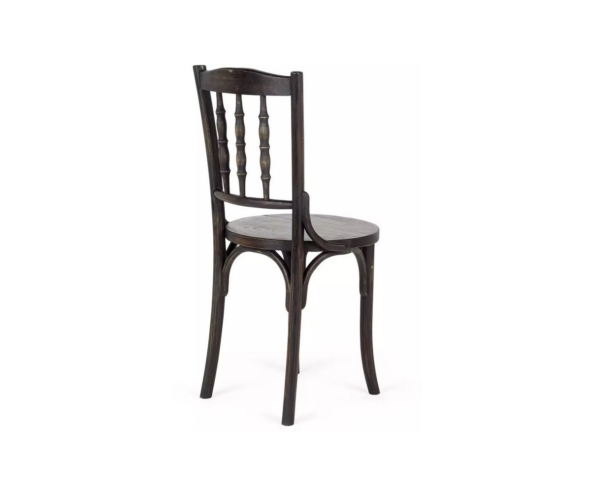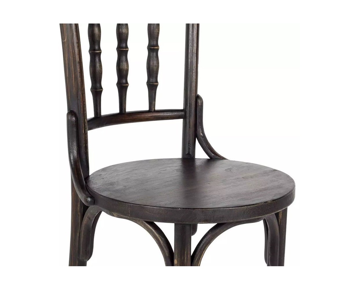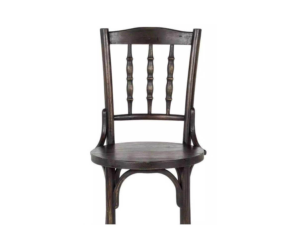 Silla inspirada en un diseño de Michael Thonet. Estructura fabricada en madera de roble macizo torneado, acabado oscuro envejecido. Réplica exacta con materiales originales de máxima calidad.